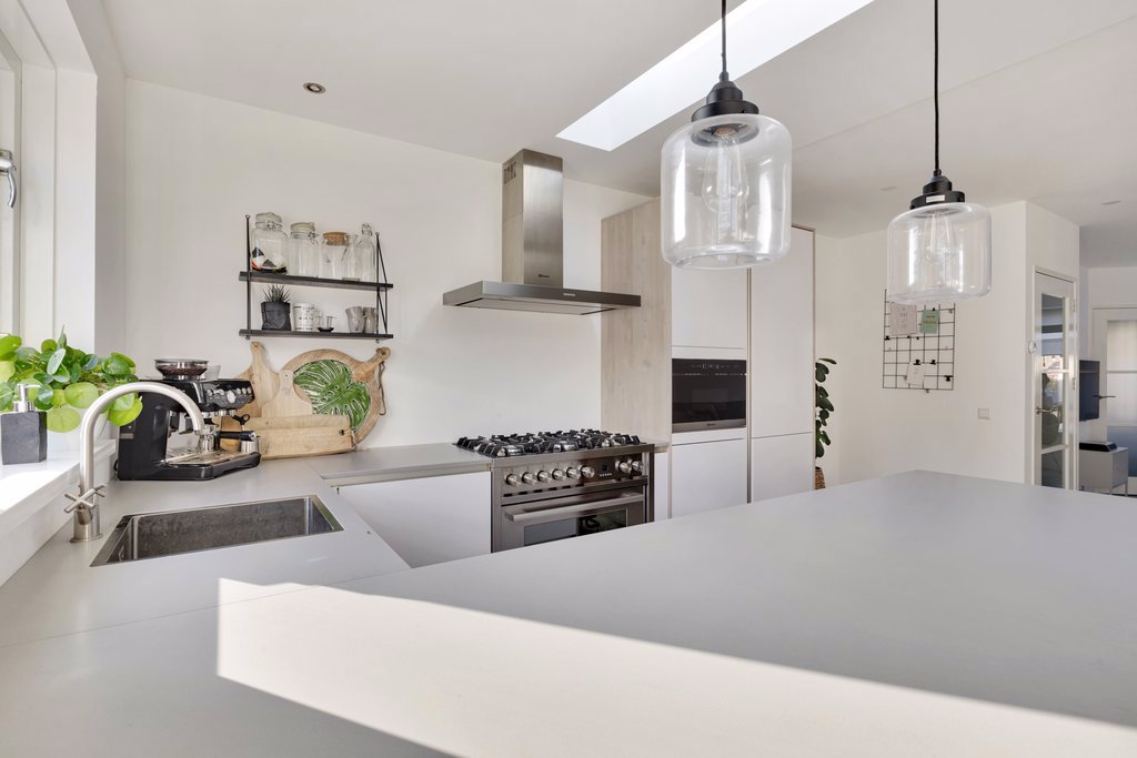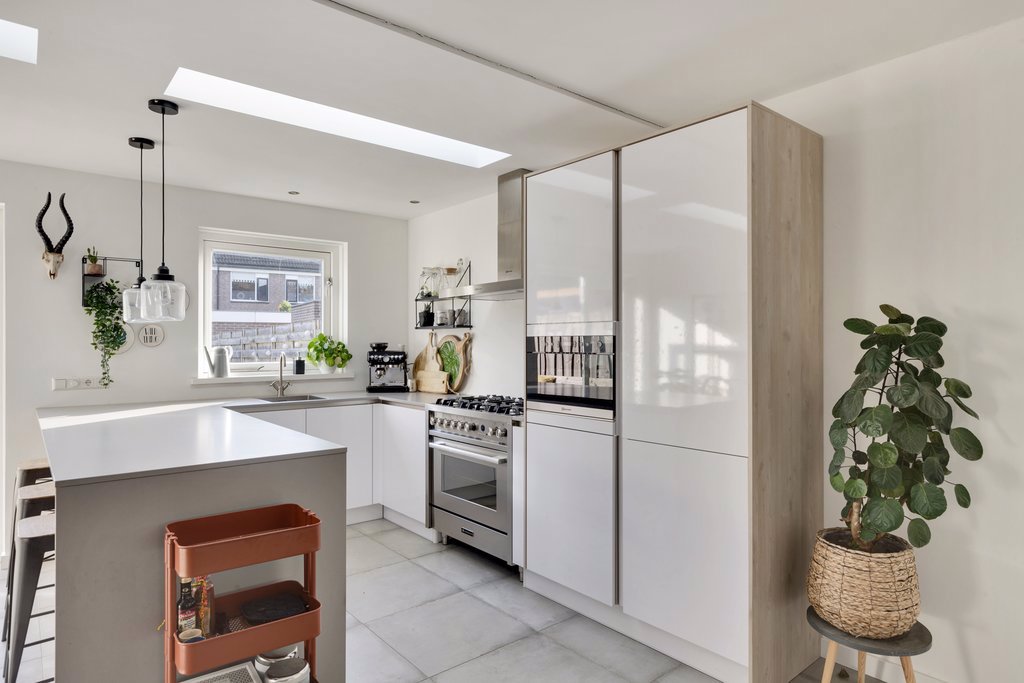 Met een lichtgrijze tegelvloer, gestucte muren en houten deuren is een prachtige woonkamer gerealiseerd. De keuken uit 2017 heeft een composieten werkblad en biedt veel berg- en werkruimte. ’s Ochtends een ontbijtje aan de bar of in het weekend gezellig koken voor familie of vrienden…dat kan hier allemaal! Met een koelkast, vrieskast, afwasmachine, afzuigkap, magnetron en een Lancelotti fornuis met oven en 6-pits gasfornuis kun je je helemaal uitleven.