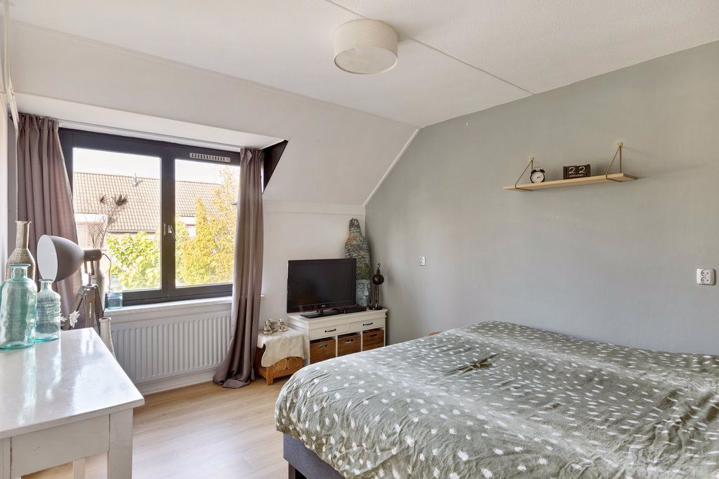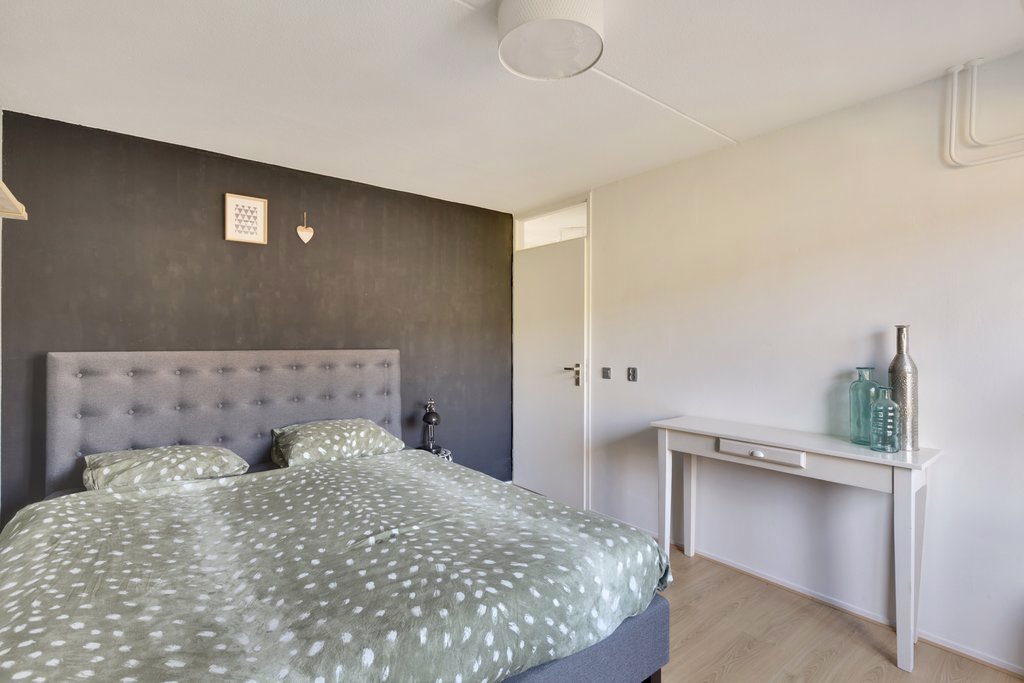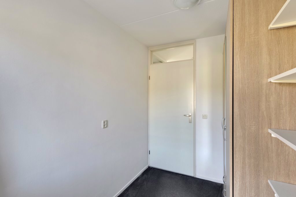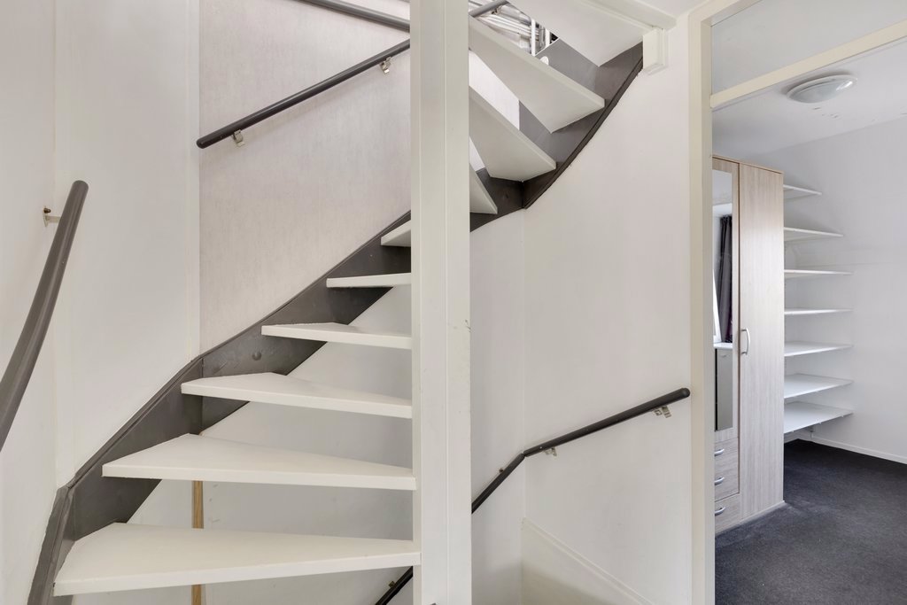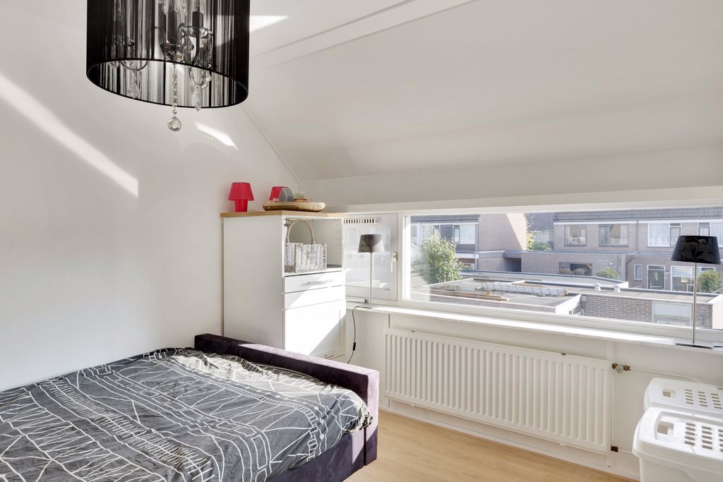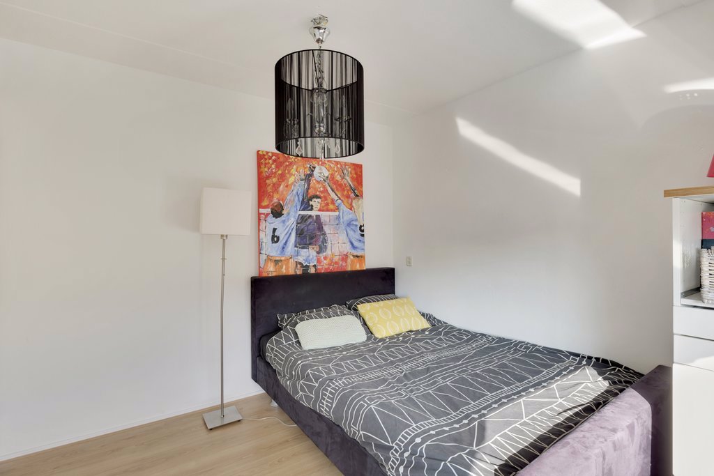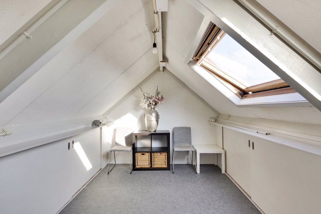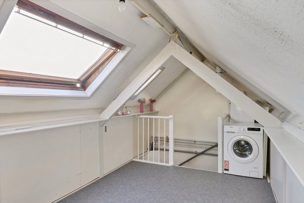 Hier ligt nieuw vinyl op de vloer. Achter de schuifdeuren zit veel bergruimte. De cv-ketel en de aansluiting van de wasmachine zijn op deze verdieping te vinden. Er zijn al twee dakramen op zolder, waardoor er prima een extra slaapkamer te realiseren is.