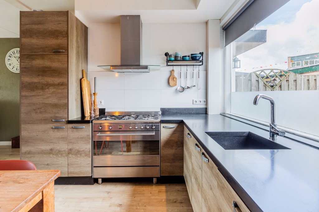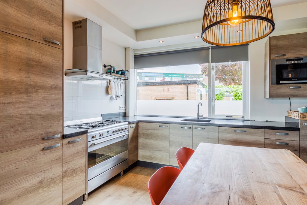 De hoekkeuken heeft een stoere uitstraling en is van alle gemakken voorzien. Met een Smeg 6-pits gasfornuis met oven, magnetron, nieuwe vaatwasser, afzuigkap, koelkast en diepvries kun je hier de heerlijkste maaltijden bereiden.