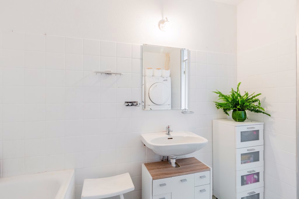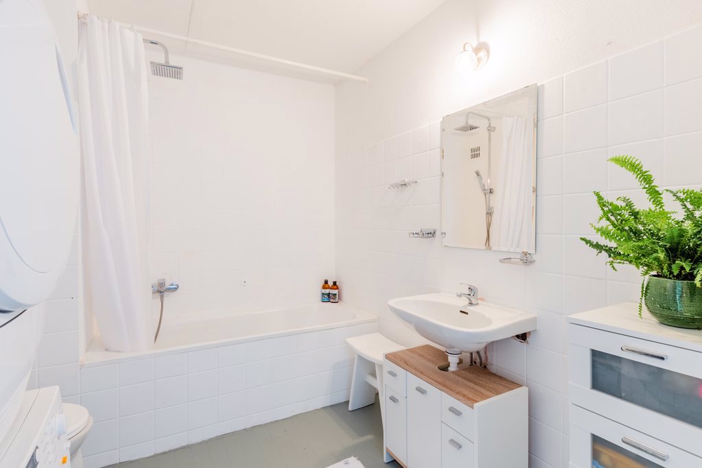 Via de trap kom je op de overloop van de eerste verdieping. Hier zijn 4 slaapkamers. De twee slaapkamers aan de achterzijde hebben allebei toegang tot het balkon. De badkamer is tot bovenaan betegeld en is voorzien van een bad met douche, een toilet en een wastafel. Hier zit ook de aansluiting voor de wasmachine.