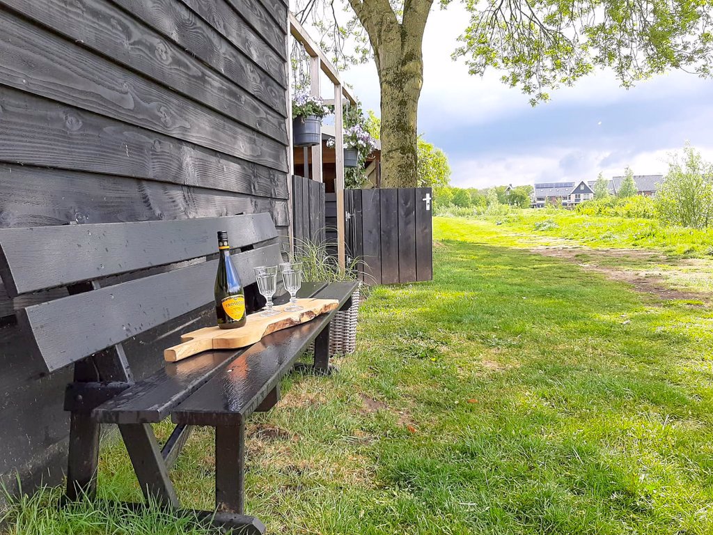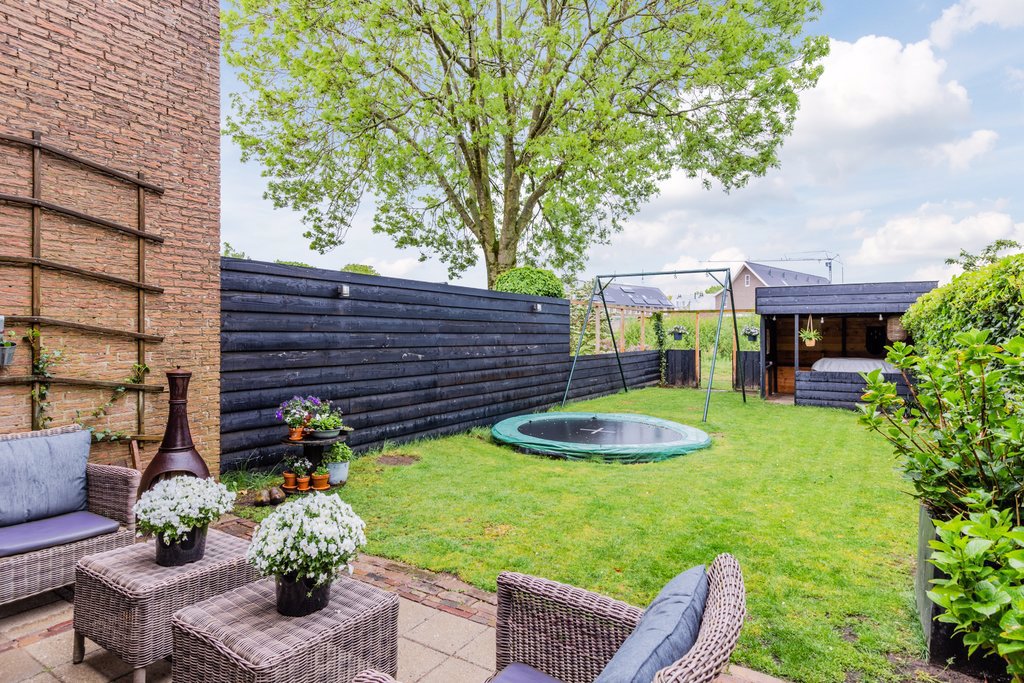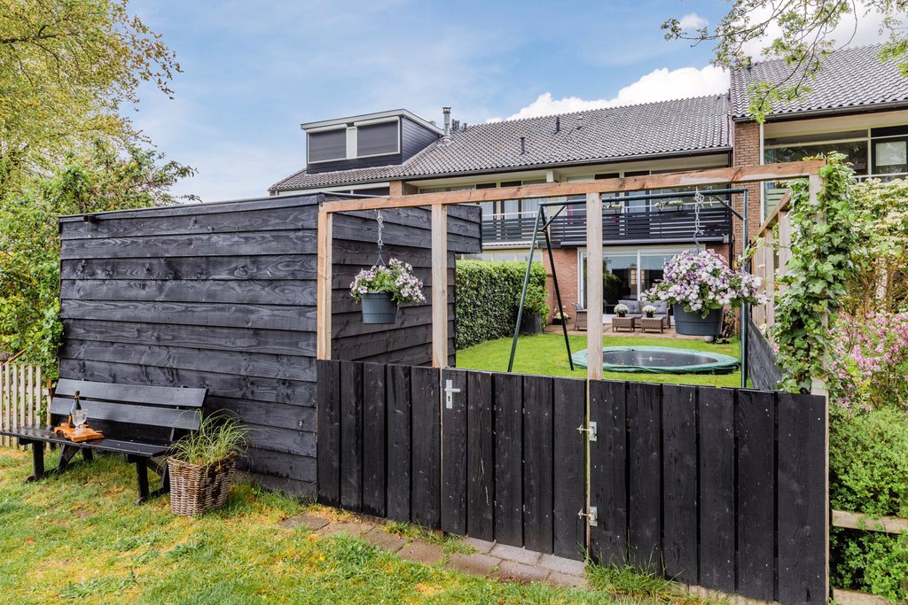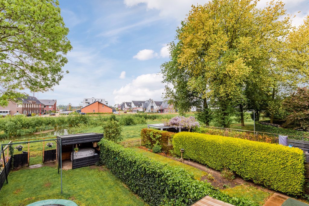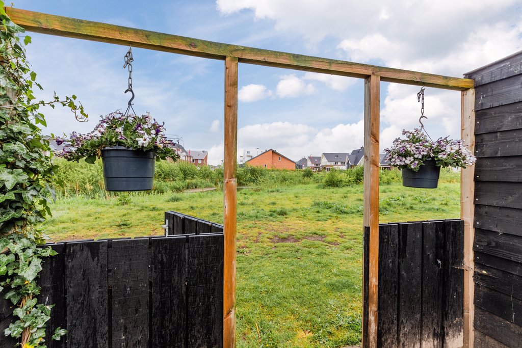 In de voortuin is een zitje gemaakt en hier staat de garage met elektrische deur. De diepe achtertuin ligt op de het zuiden. Achterin de tuin staat een overkapping (2016) waardoor je lekker lang buiten kunt zitten. Vanuit de achtertuin kom je gelijk op een prachtig groen en rustig plekje aan de beek.