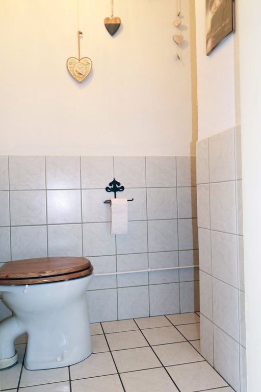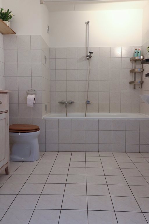 De badkamer is betegeld, heeft een bad met daarin een douche, een toilet en een wastafel. Ook zit hier een aansluiting voor een wasmachine.