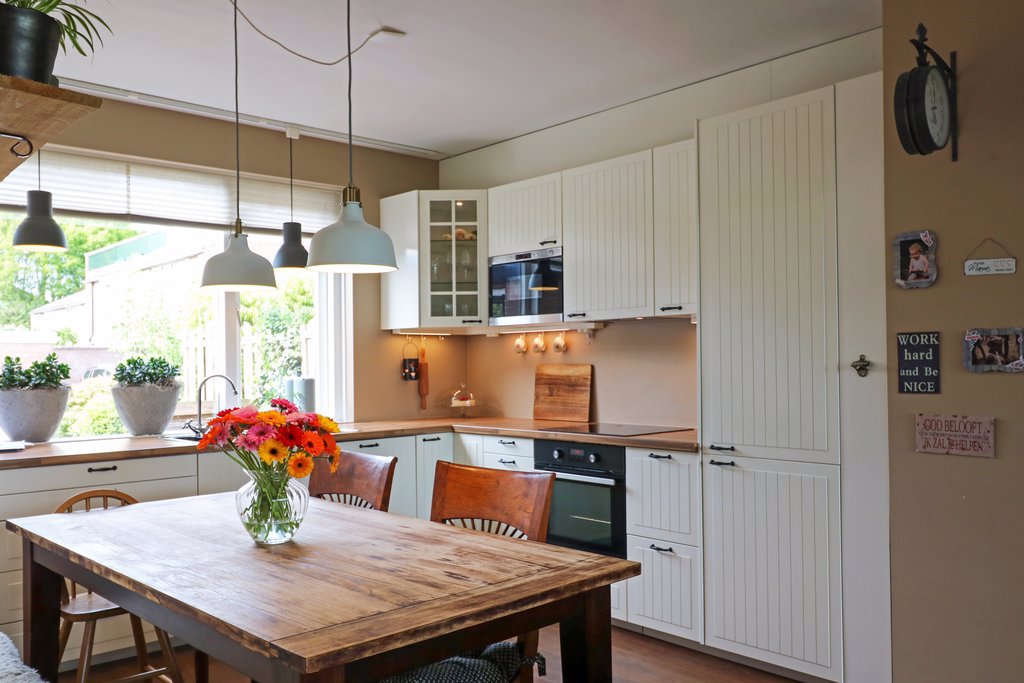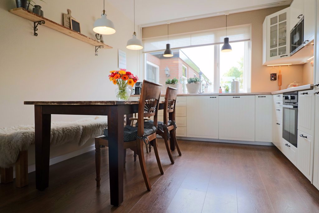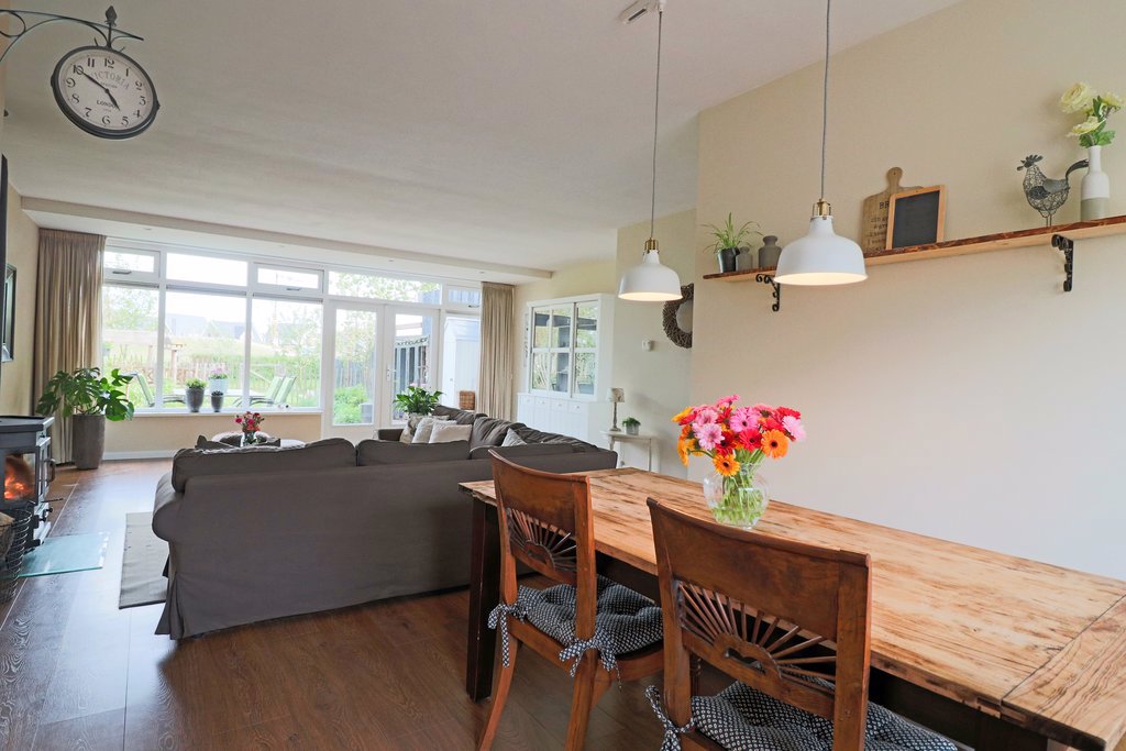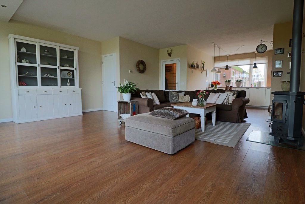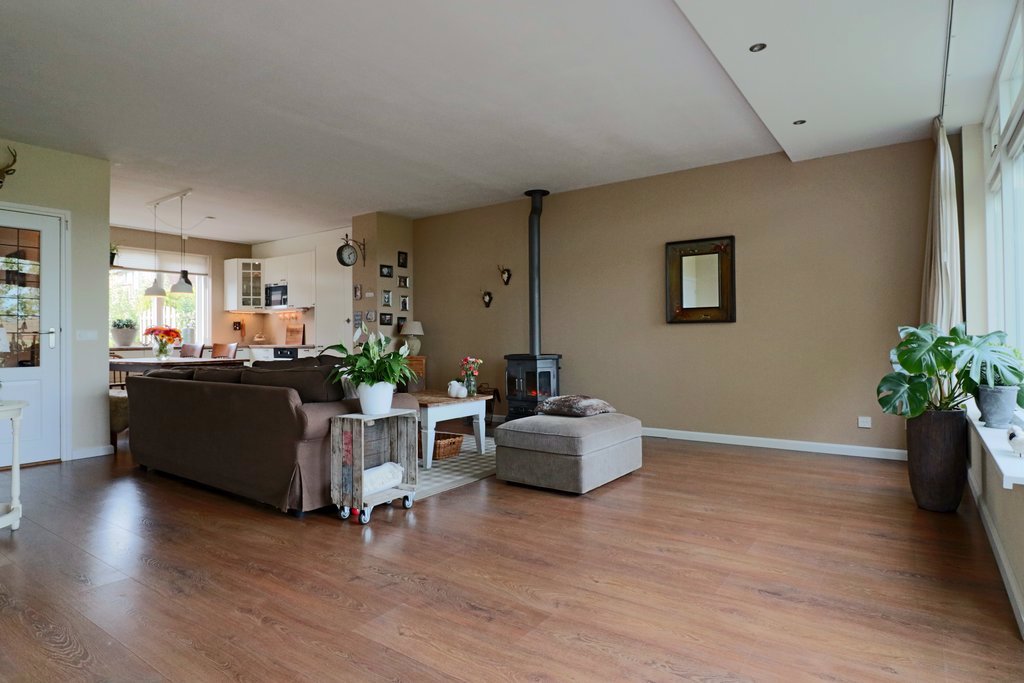Via de karakteristieke houten deur met glas-in-lood kom je in de royale woonkamer van bijna 6 meter breed. Door de openslaande deuren en grote raampartij komt er veel licht naar binnen. Vanuit de tuingerichte woonkamer heb je een mooi vrij uitzicht. De strakke muren, het gestuukte plafond met inbouwspots en de laminaatvloer met vloerverwarming laten zien dat hier alles tot in de puntjes afgewerkt is. Met de mogelijkheid voor het plaatsen van een houtkachel kun je extra sfeer creëren.