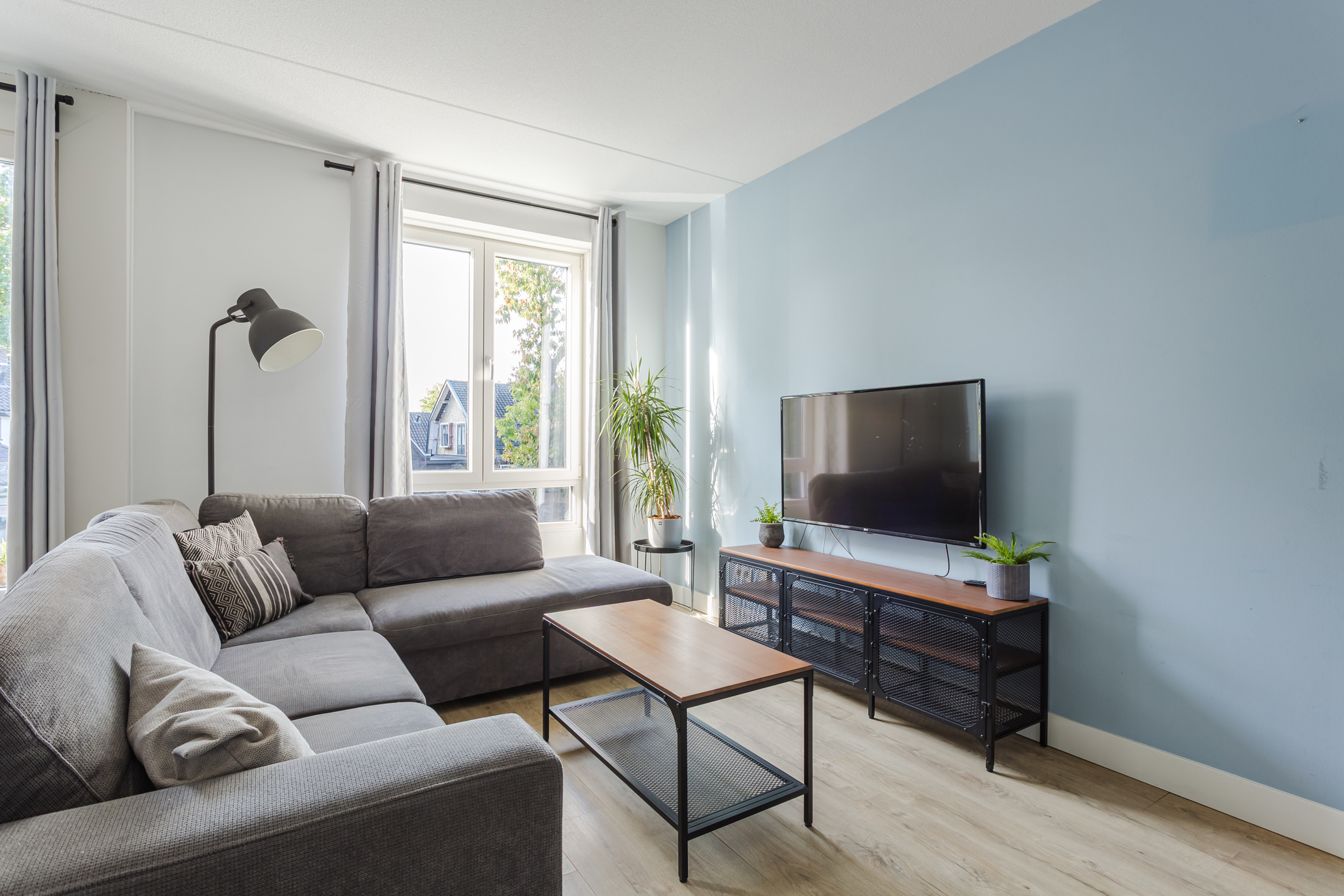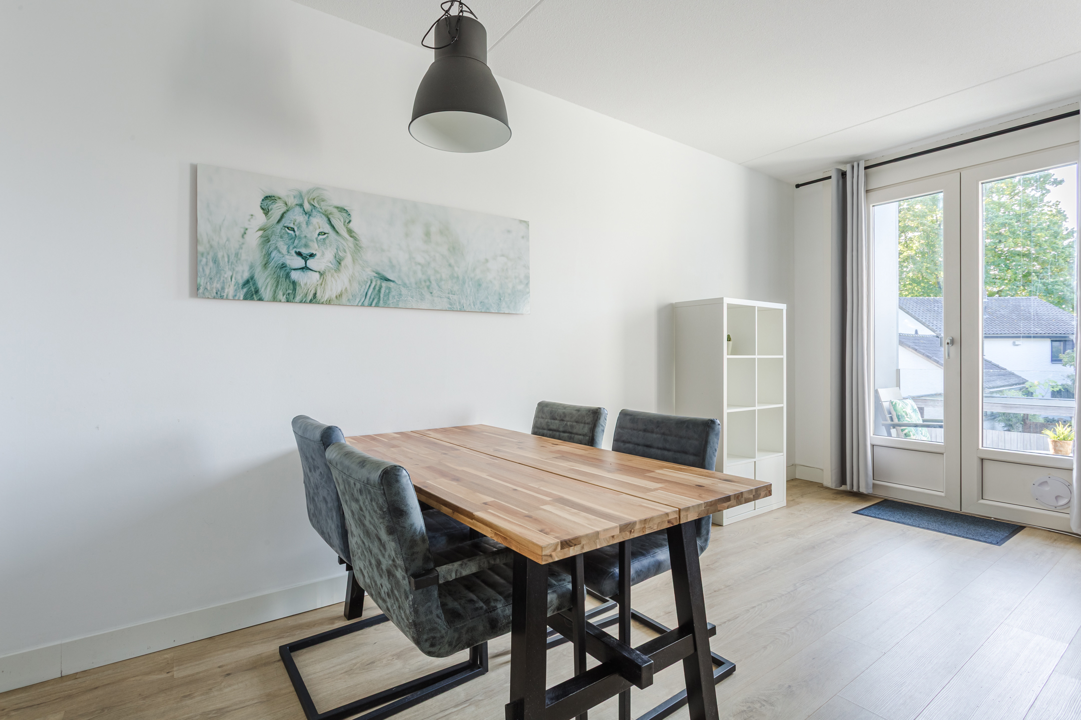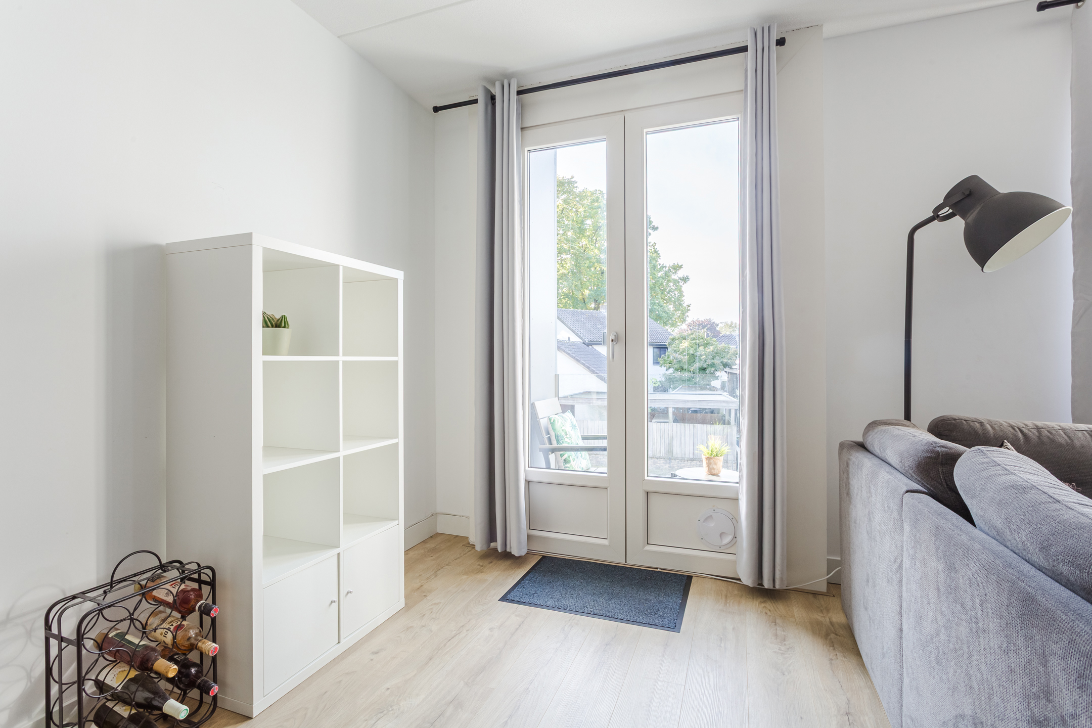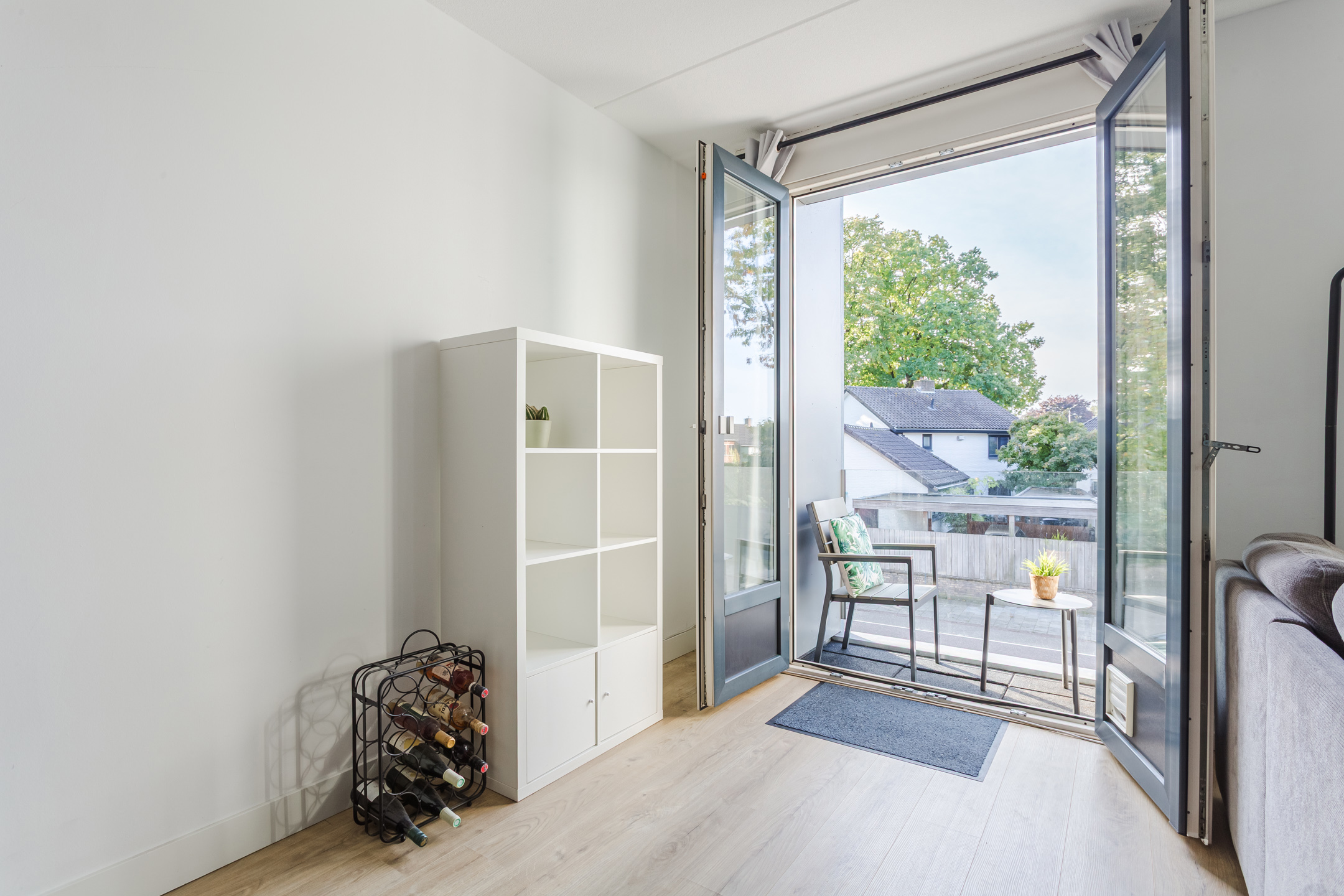 De lichte woonkamer met grote ramen beschikt over openslaande deuren naar een knus balkon op het zuiden; een fijn plekje om van de zon te genieten. Met de mobiele airco houd je het in de zomer heerlijk koel.