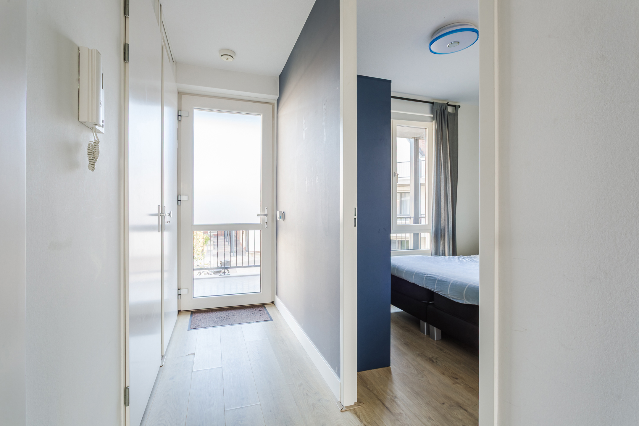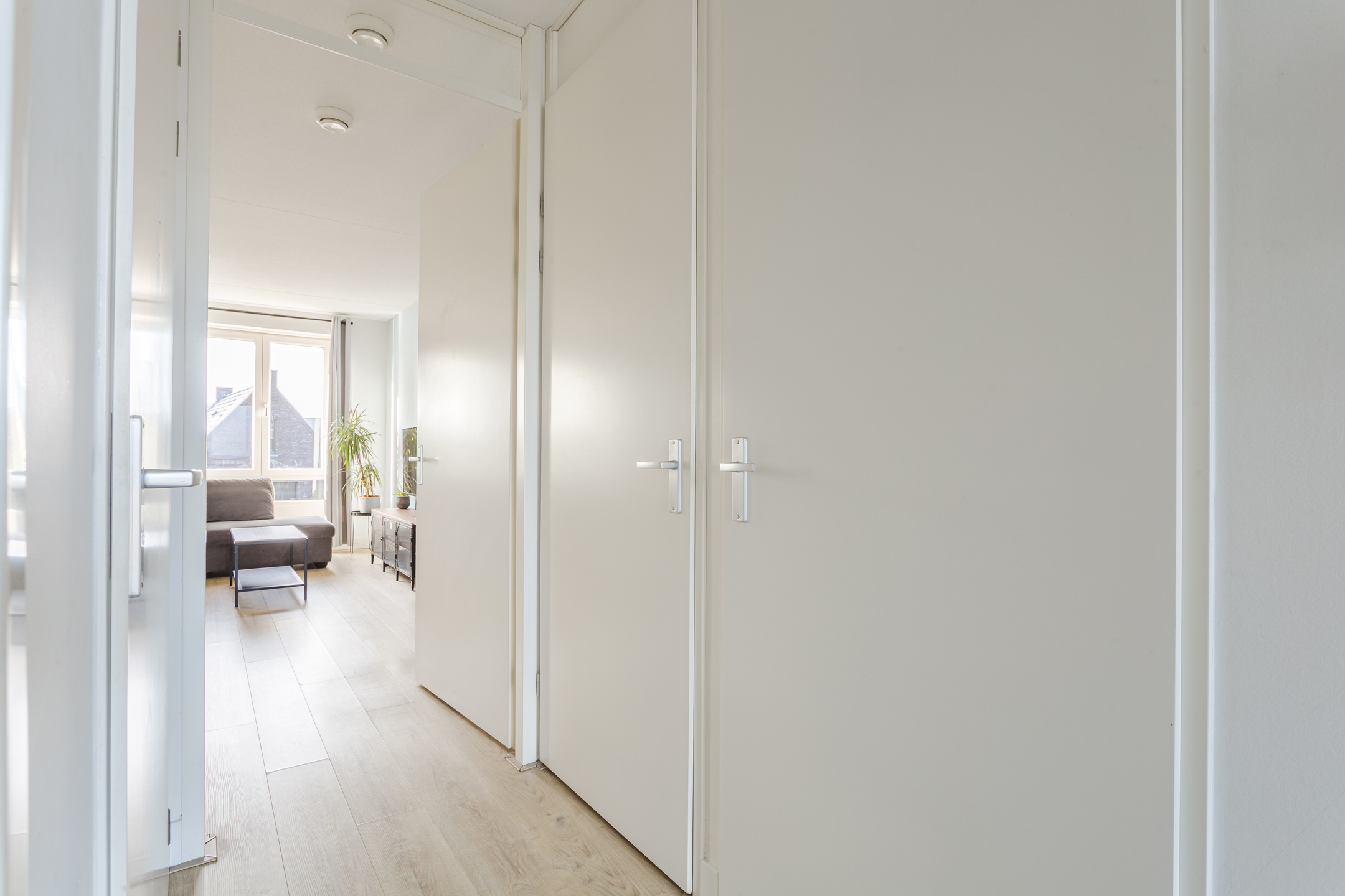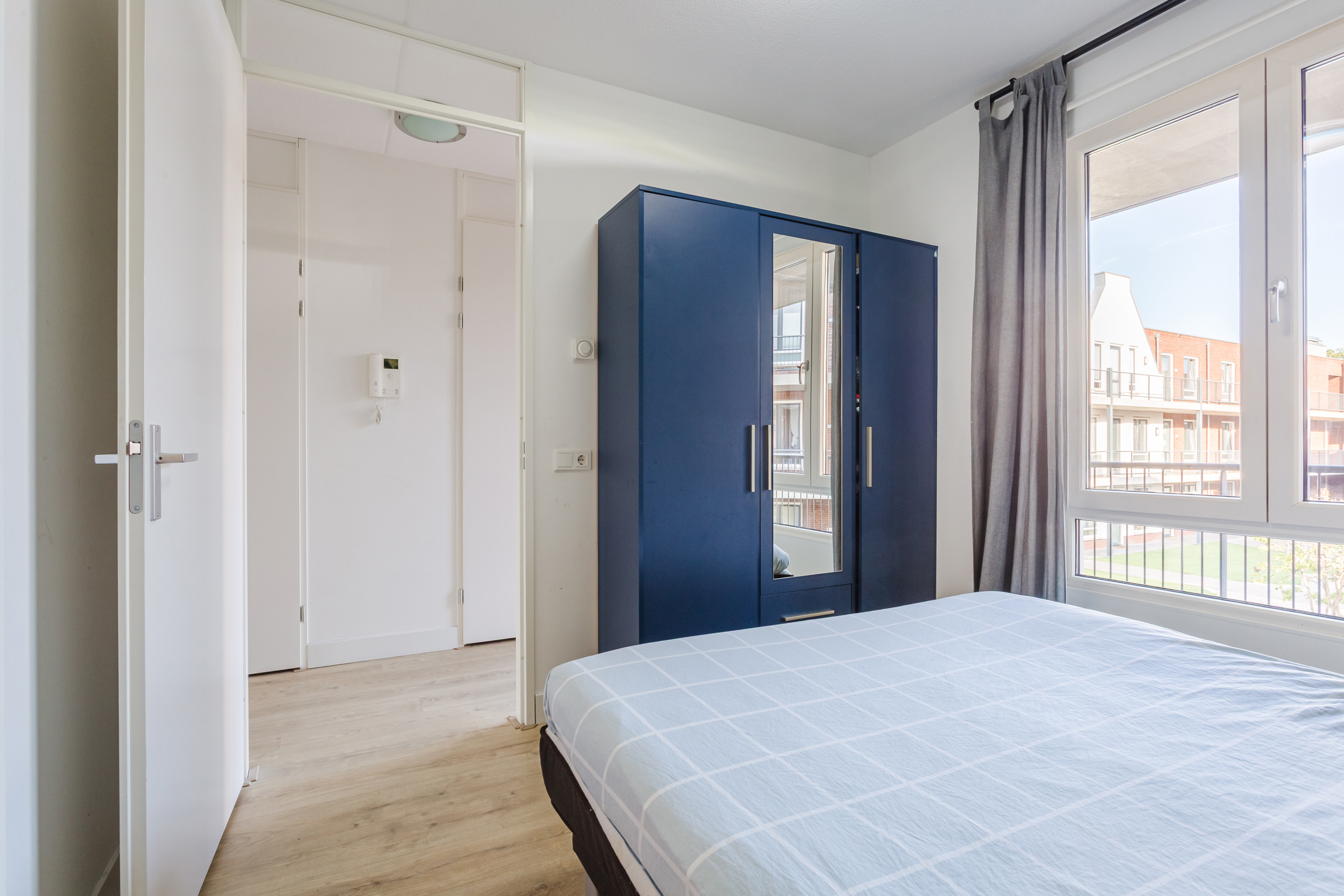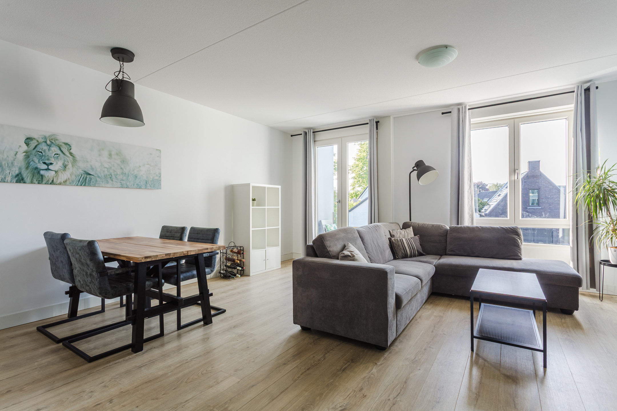 De lichte woonkamer met grote ramen beschikt over openslaande deuren naar een knus balkon op het zuiden; een fijn plekje om van de zon te genieten. Met de mobiele airco houd je het in de zomer heerlijk koel.
