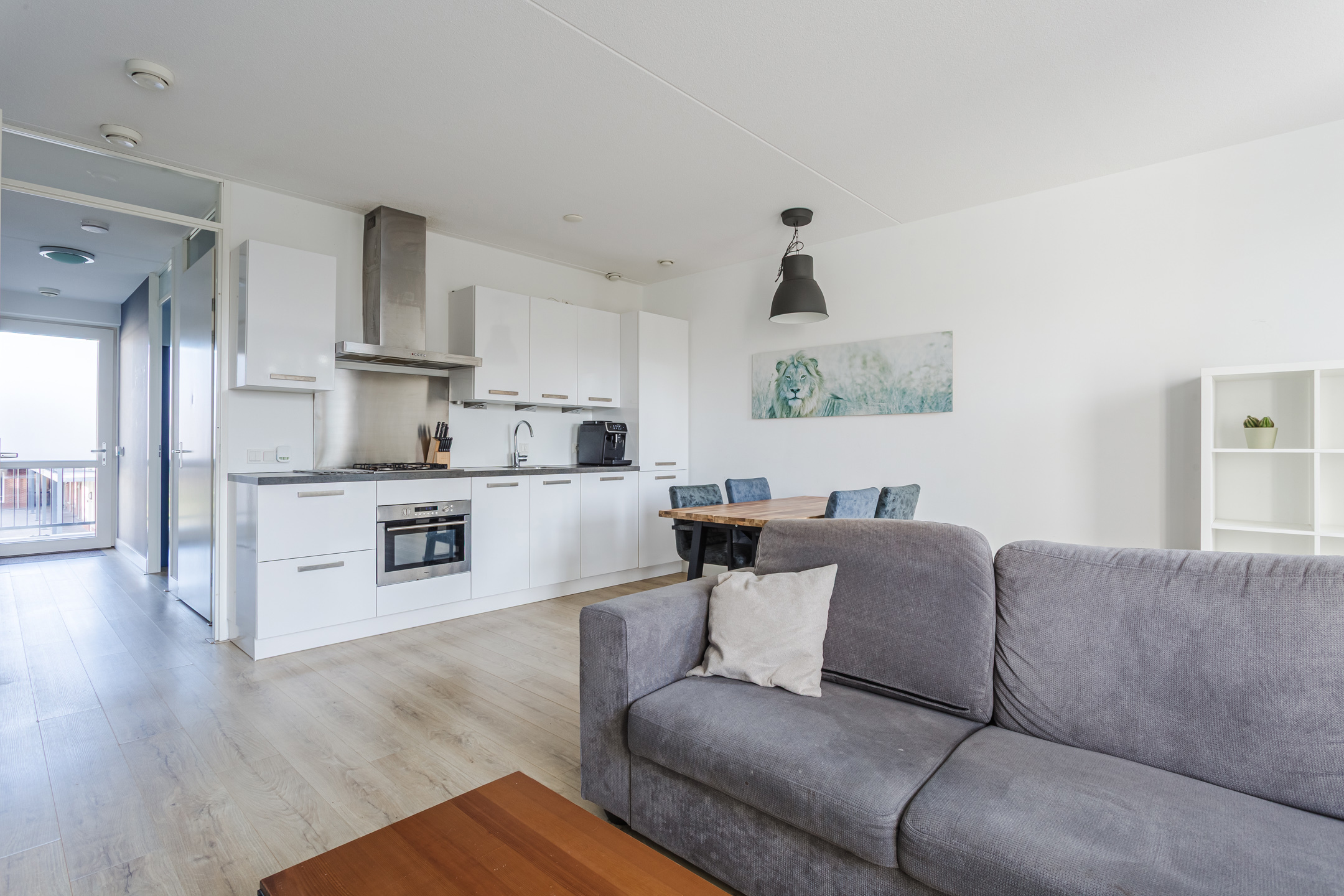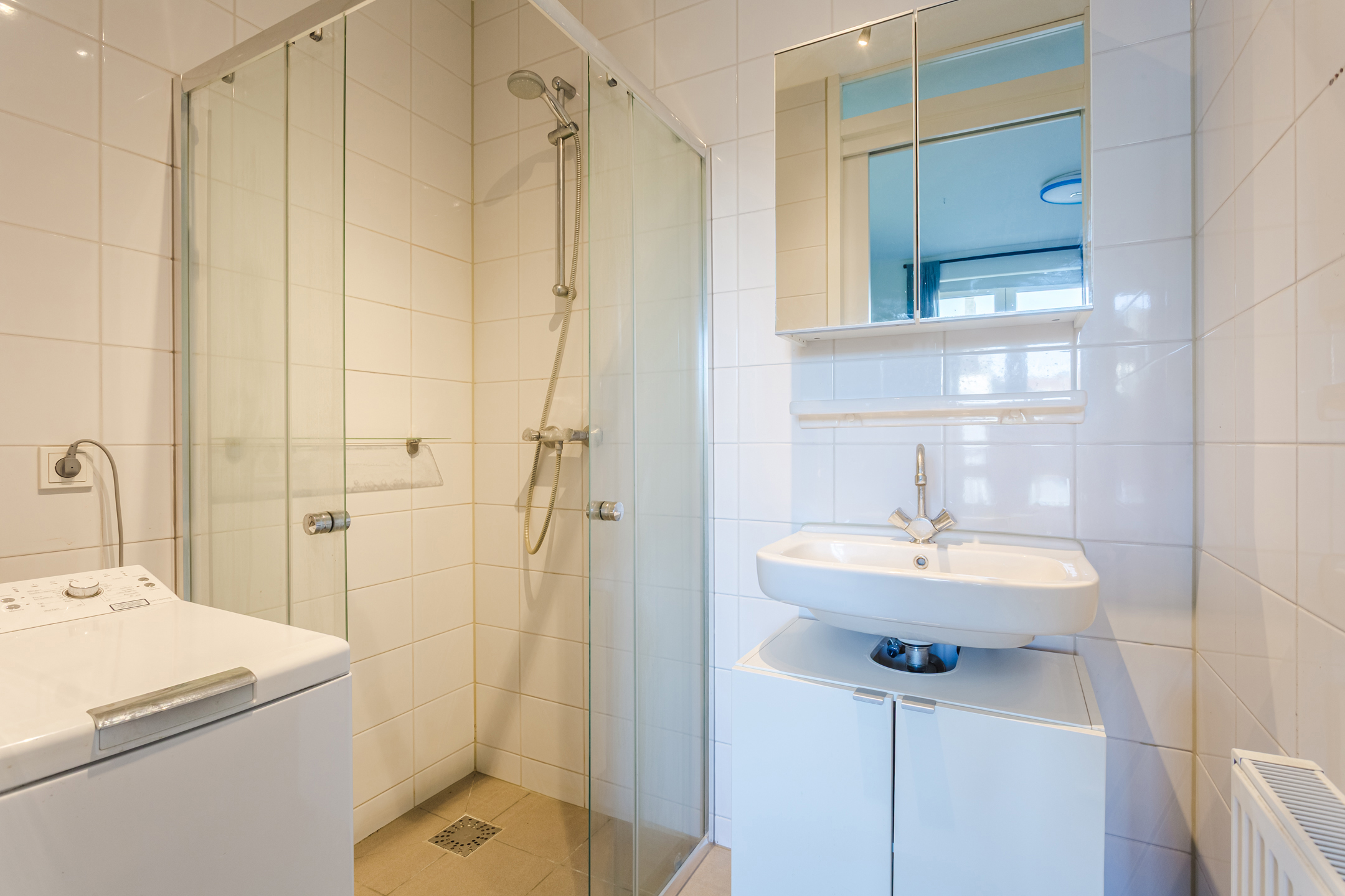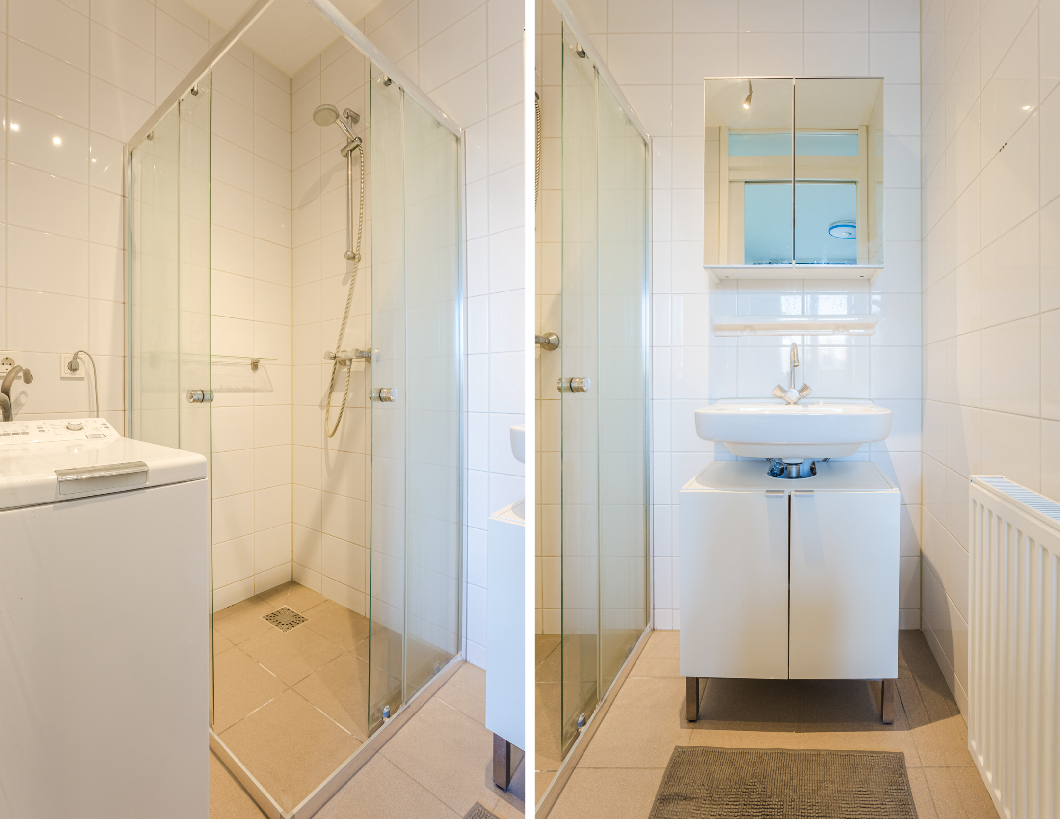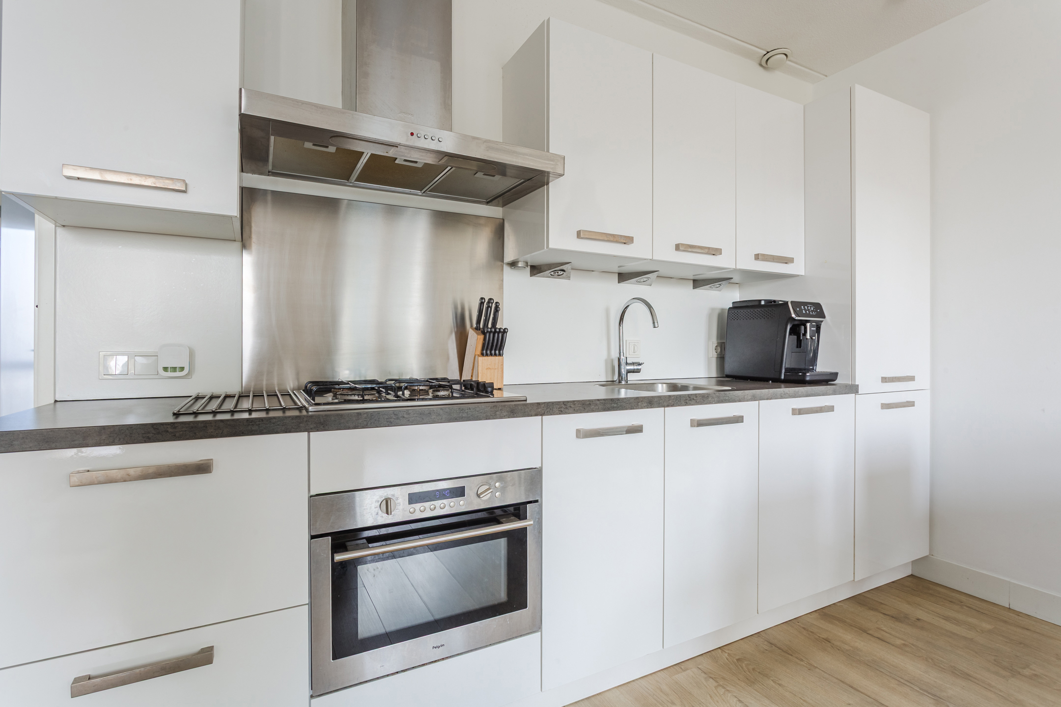 De open keuken is compleet uitgerust met een vaatwasser, koelkast, vriezer, 4-pits gaskookplaat, afzuigkap en oven. De badkamer grenst direct aan de ruime slaapkamer. Hier vind je een douche, wastafelmeubel en de aansluiting voor een wasmachine.