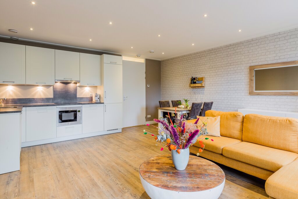 Alles ziet er hier tiptop uit! De woonkamer heeft openslaande deuren naar het terras op het zuiden. Hier kun je nagenoeg de hele dag genieten van het zonnetje! De hoekkeuken is voorzien van een koelkast, vrieskast, vaatwasser, inductie kookplaat, afzuigkap en combi oven/magnetron.