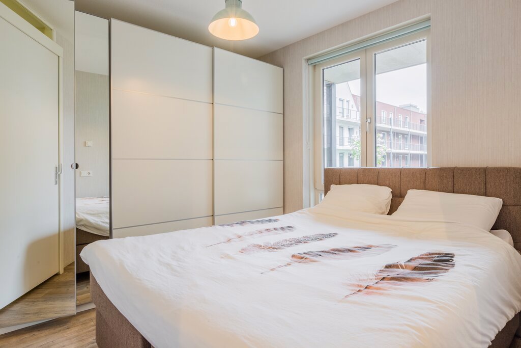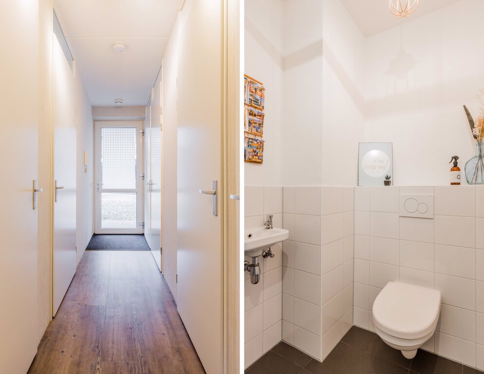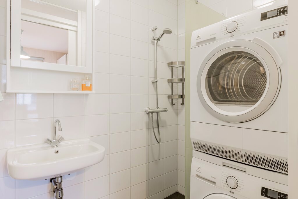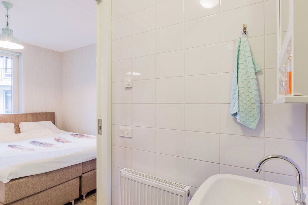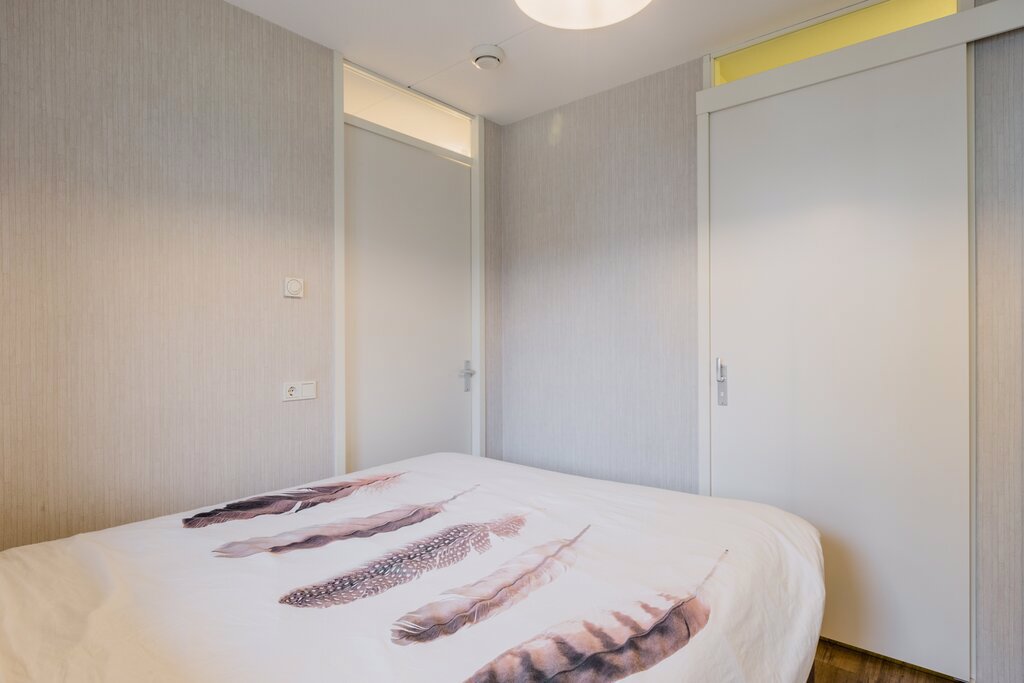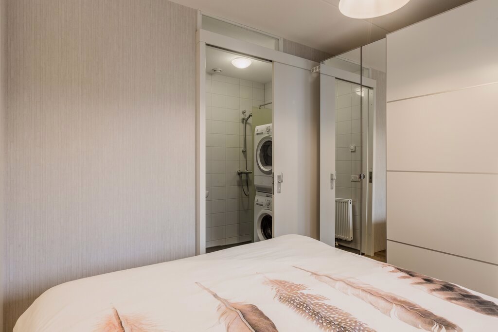 De hal heeft veel vaste kastruimte. Hier bevinden zich ook de technische installaties. De hal geeft toegang tot het toilet en de slaapkamer. Vanuit de royale slaapkamer kom je via de schuifdeur in de badkamer met wastafel en douche. Ook de wasmachine en wasdroger zijn hier te vinden.