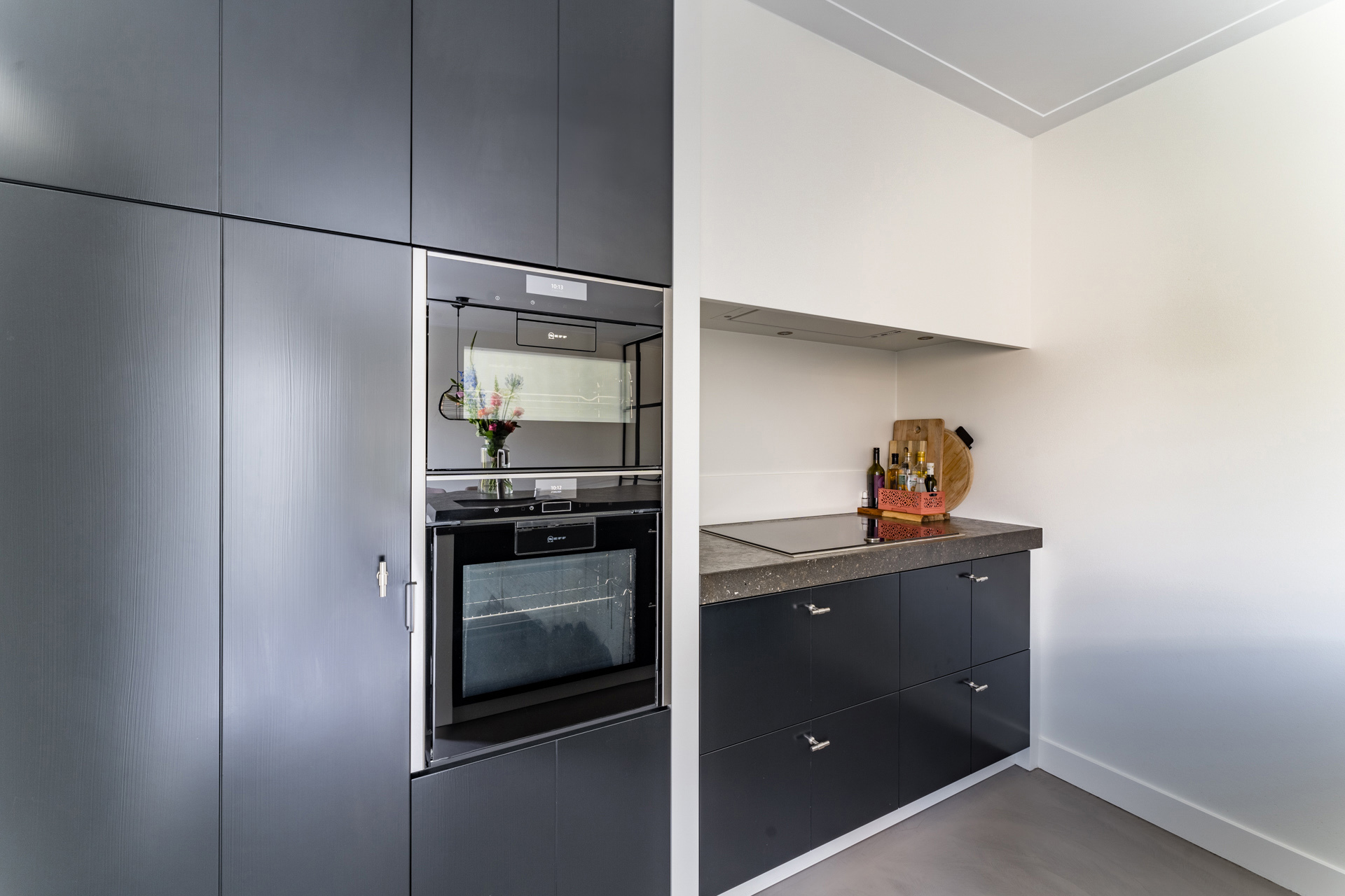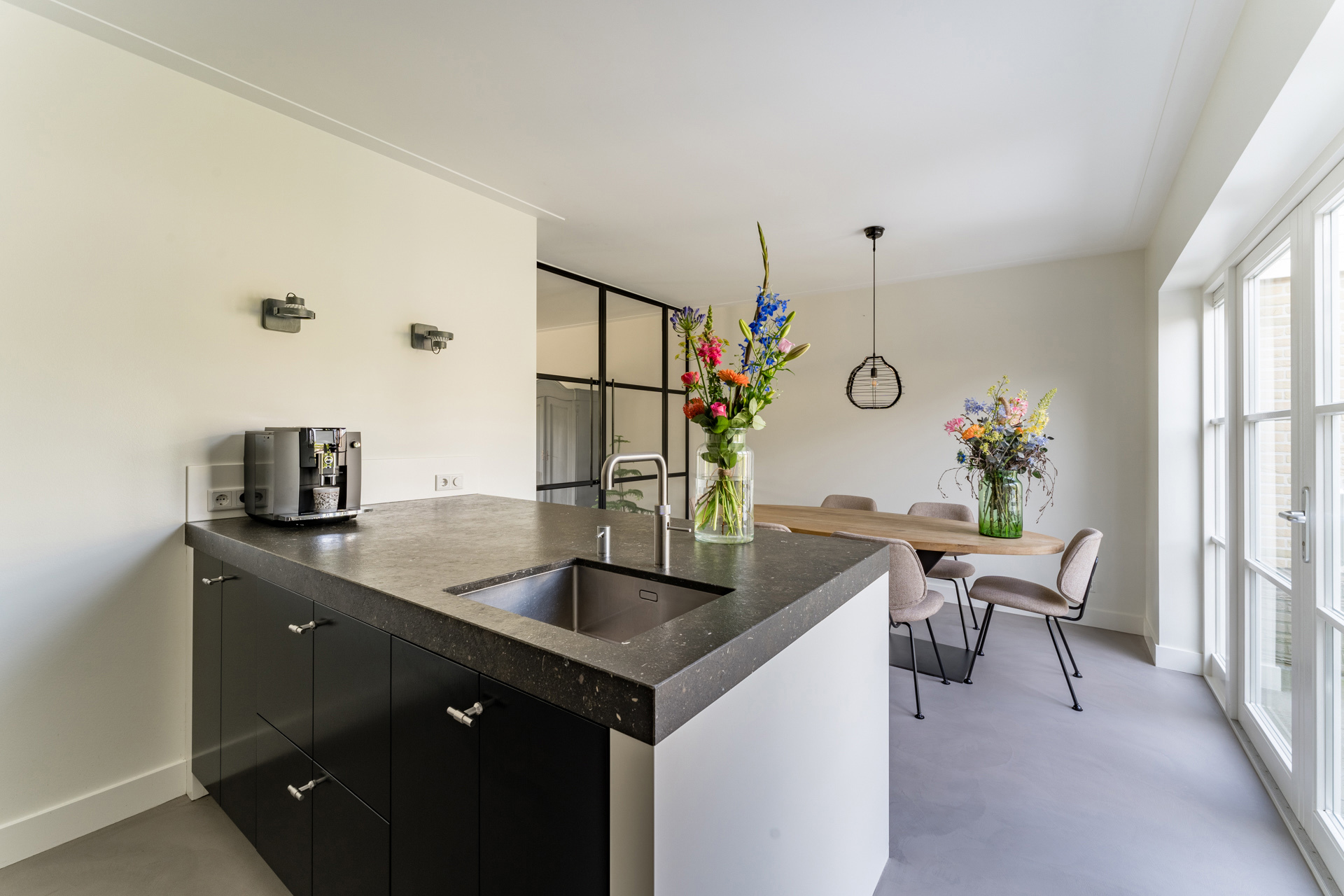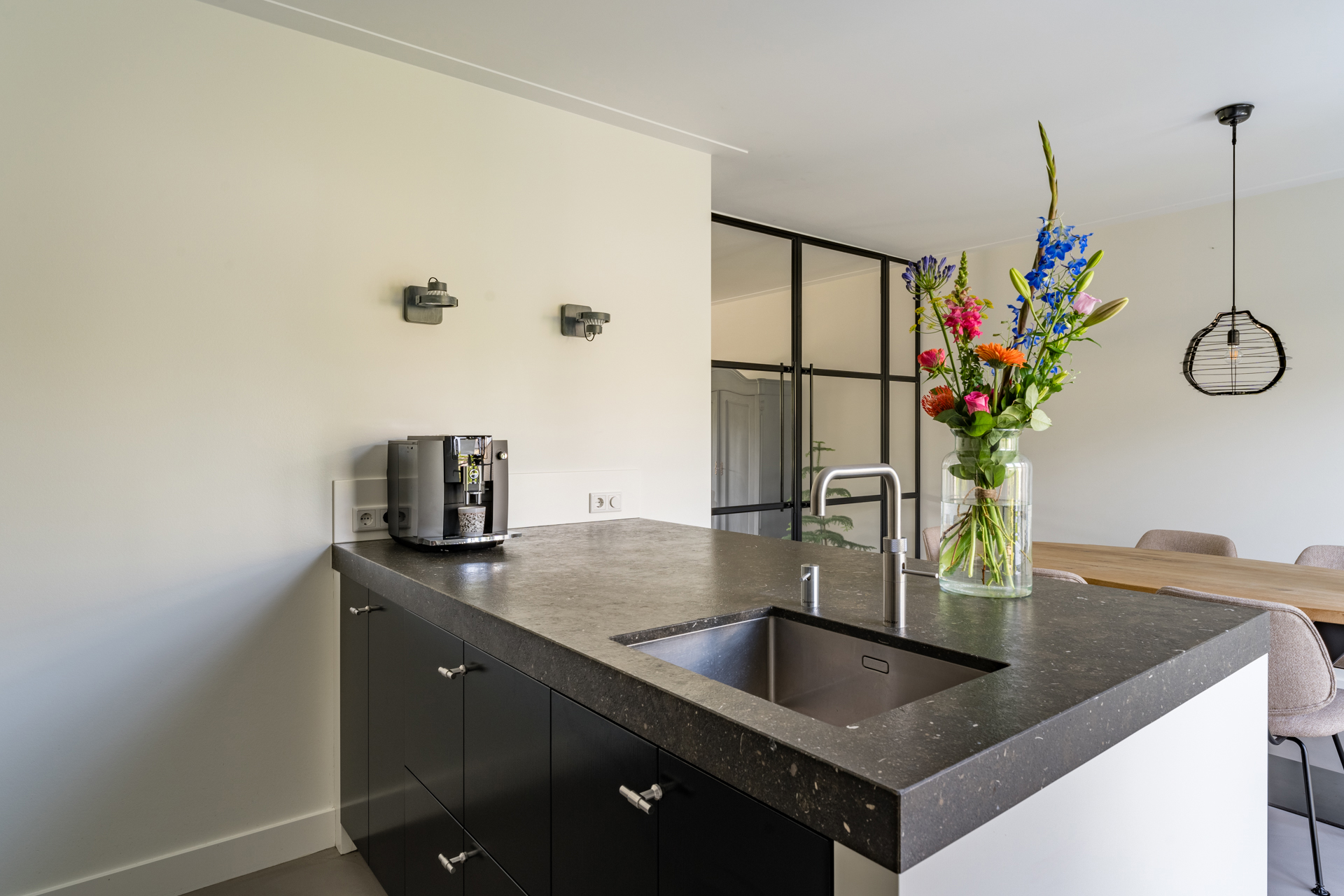 Via de stalen dubbele deuren kom je in de woonkeuken. Ook hier ligt de nieuwe gietvloer. In 2018 zijn er openslaande tuindeuren in de gevel geplaatst en is er een mooie maatwerk keuken geïnstalleerd. De keuken zelf is een droom voor elke kookliefhebber. Helemaal compleet met inbouwapparatuur van het merk Neff waaronder twee (stoom)ovens, koelkast, vriezer, inductiekookplaat, een Novy afzuigkap en een Quooker. Een fijne ruimte die garant staat voor gezellige avonden aan de keukentafel.