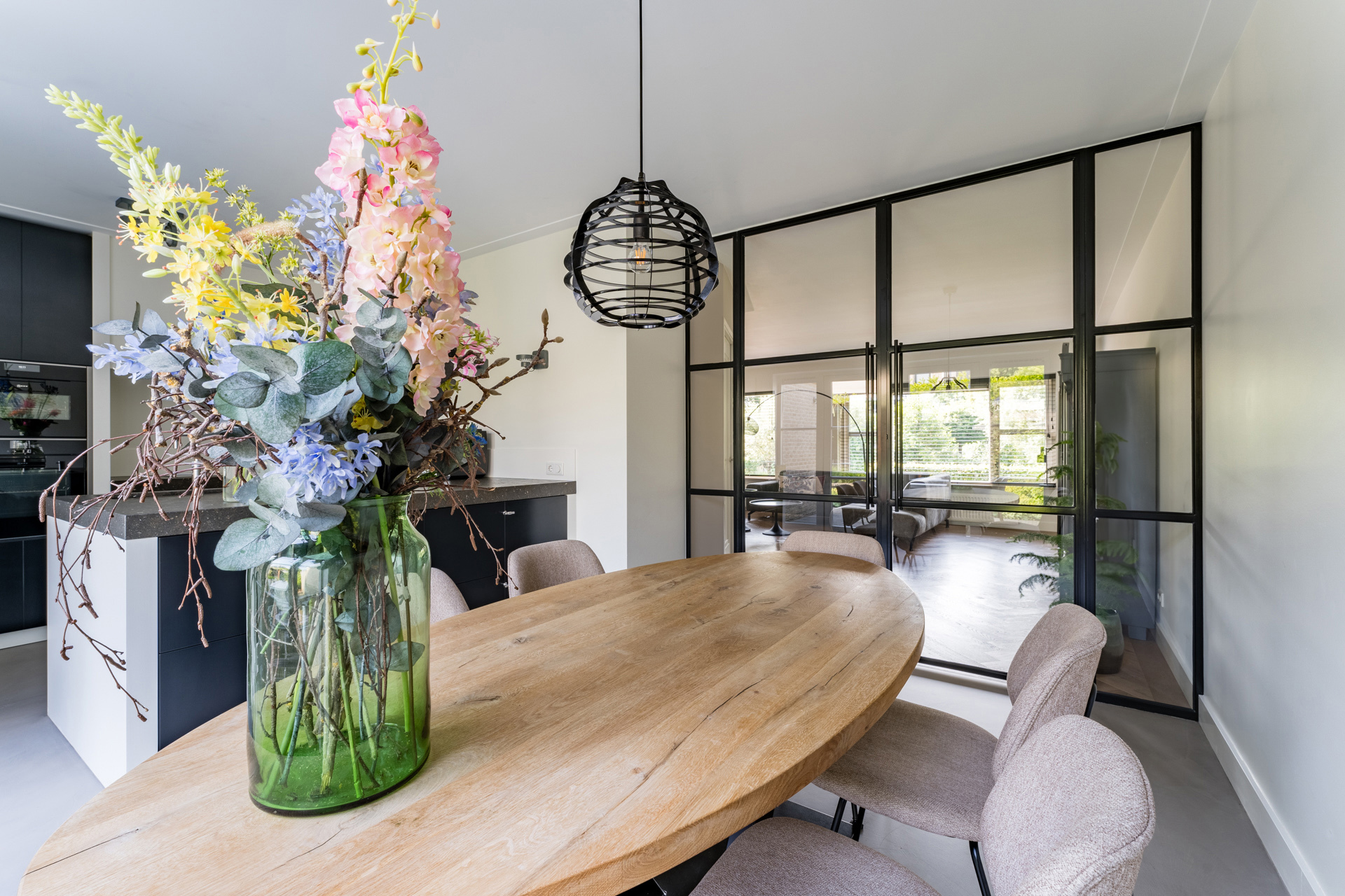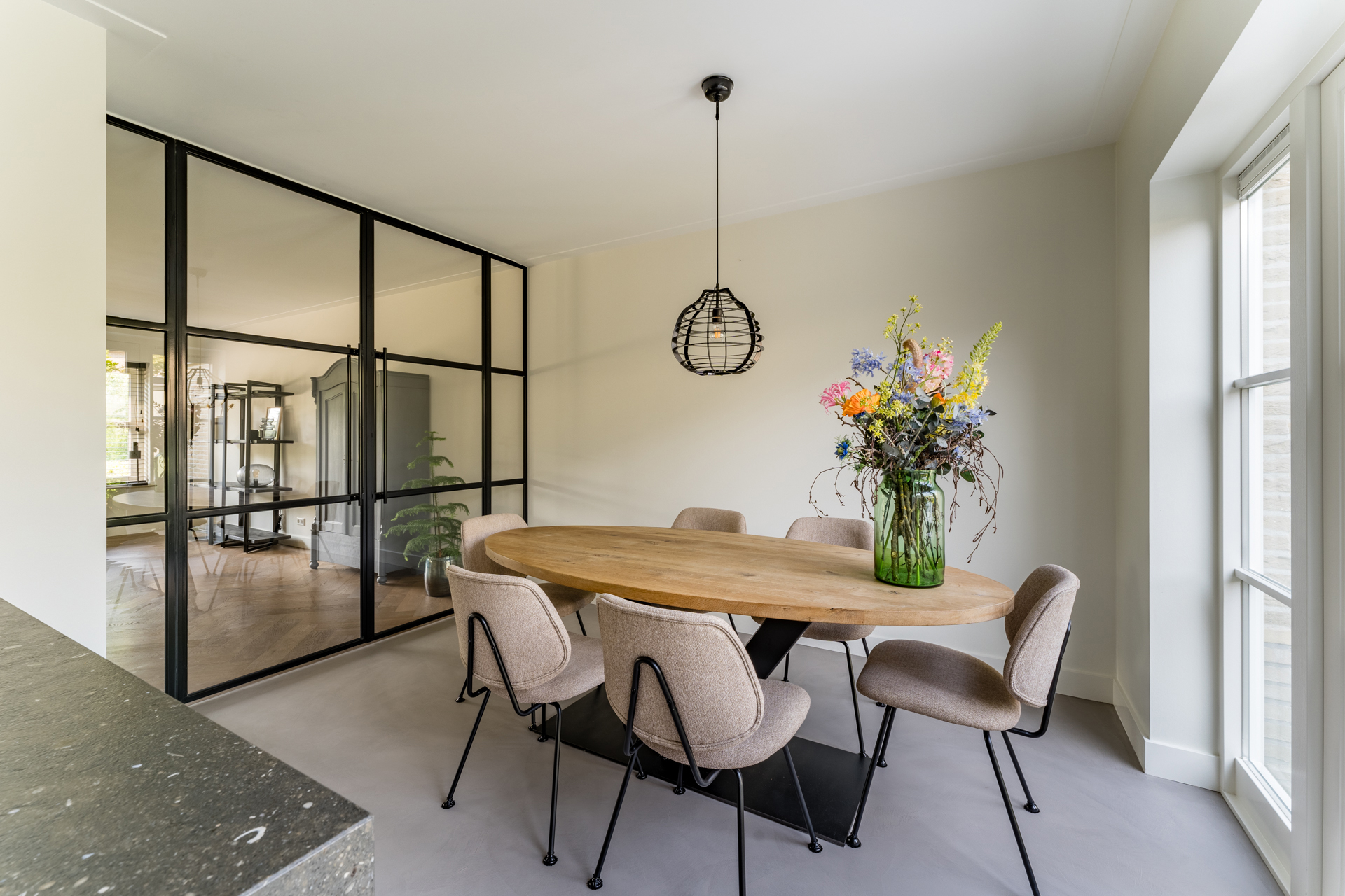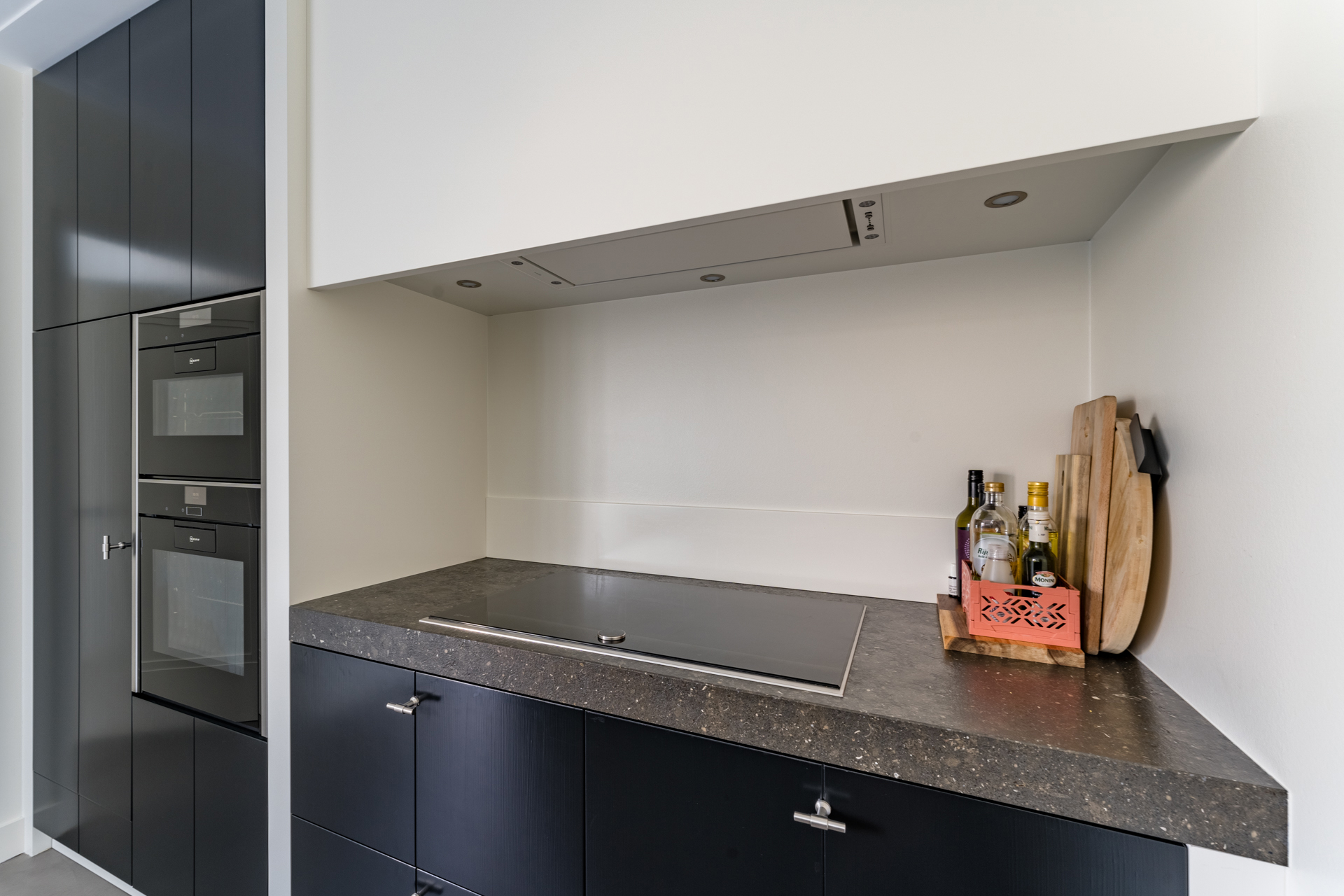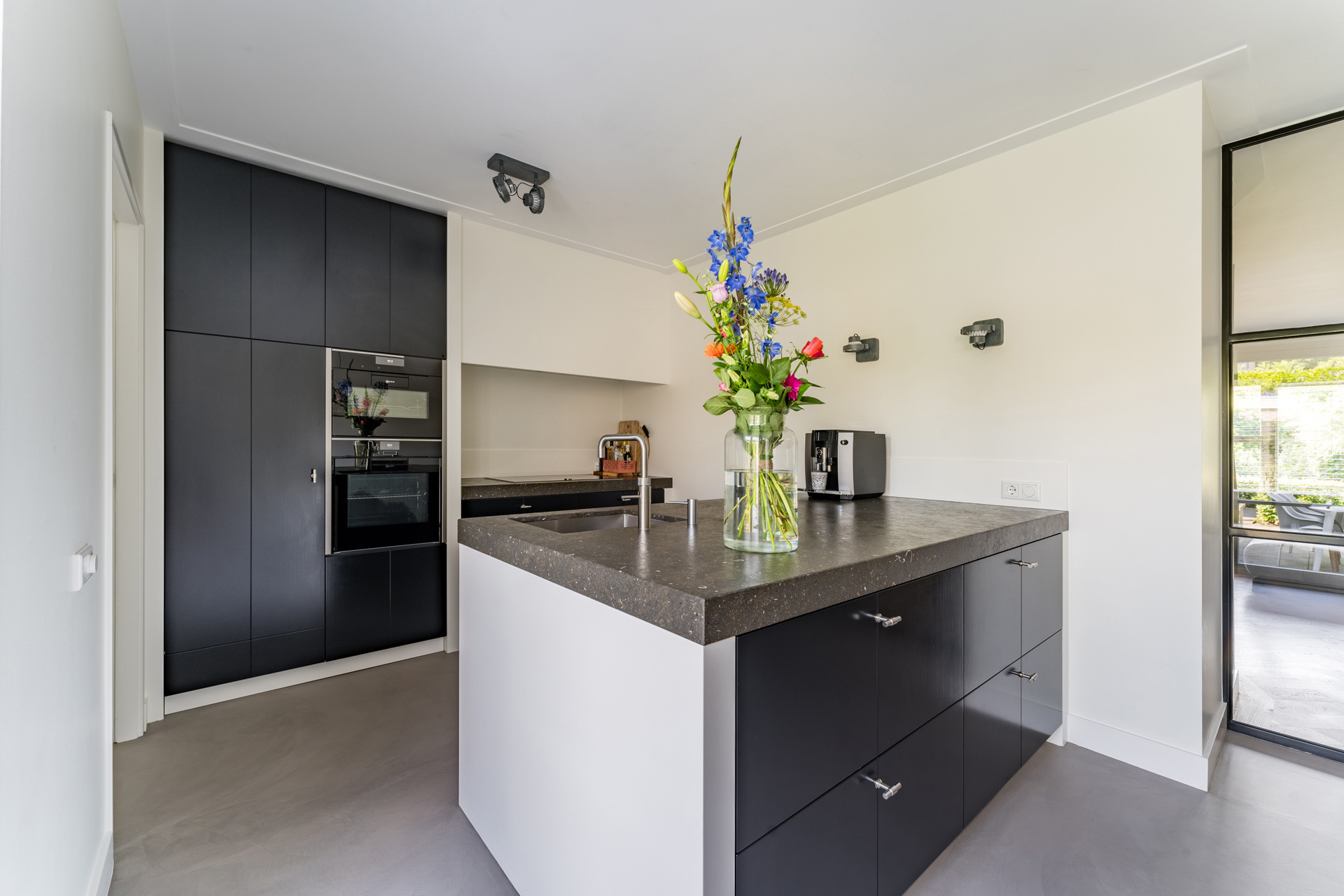 Via de stalen dubbele deuren kom je in de woonkeuken. Ook hier ligt de nieuwe gietvloer. In 2018 zijn er openslaande tuindeuren in de gevel geplaatst en is er een mooie maatwerk keuken geïnstalleerd. De keuken zelf is een droom voor elke kookliefhebber. Helemaal compleet met inbouwapparatuur van het merk Neff waaronder twee (stoom)ovens, koelkast, vriezer, inductiekookplaat, een Novy afzuigkap en een Quooker. Een fijne ruimte die garant staat voor gezellige avonden aan de keukentafel.