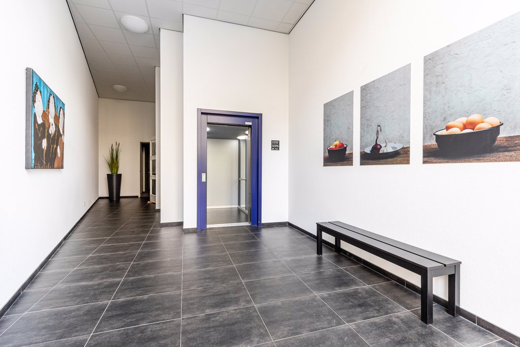 De royale hal van het appartementencomplex biedt toegang tot een lift, het trappenhuis en de bergingen. Aangekomen op de tweede verdieping komen we via de galerij bij het appartement aan, ondertussen genietend van het uitzicht op de daktuin en de kerktoren.