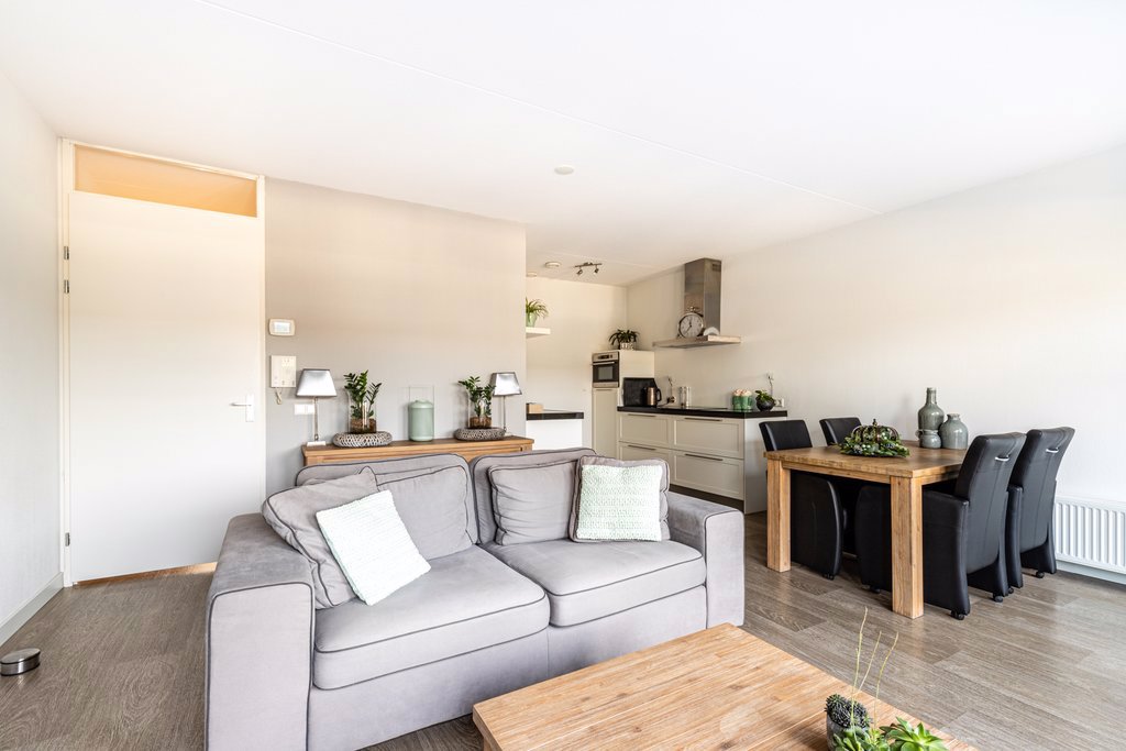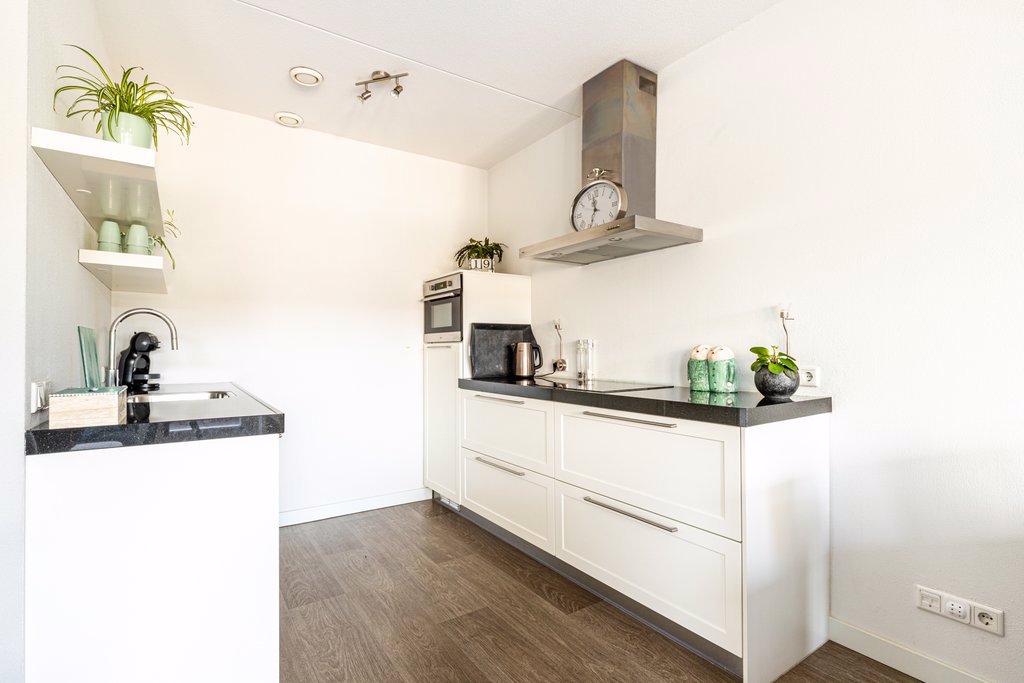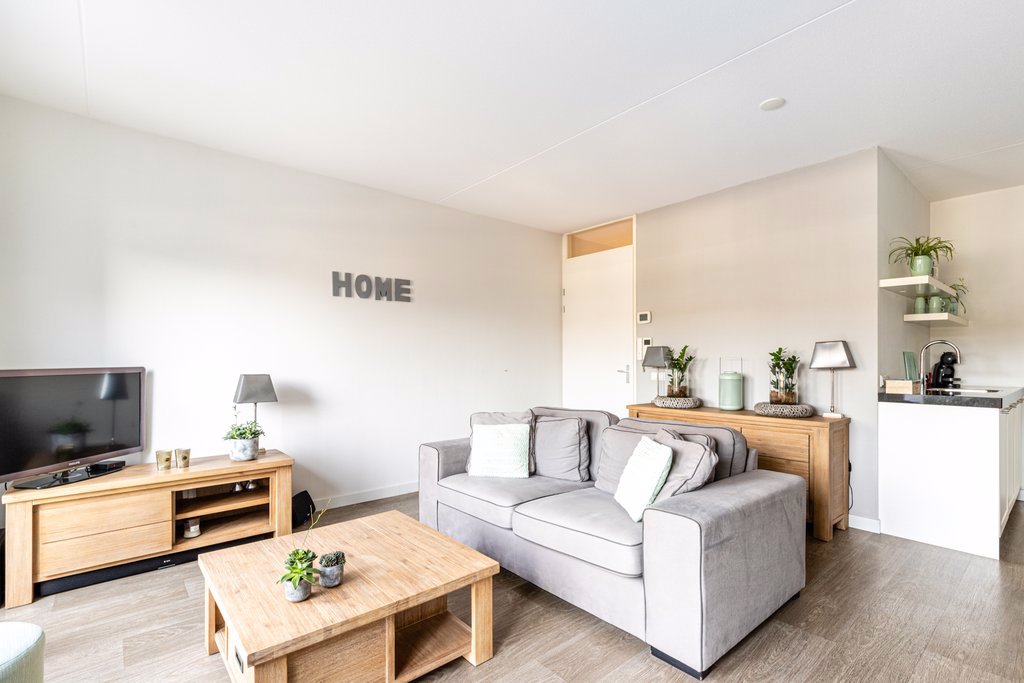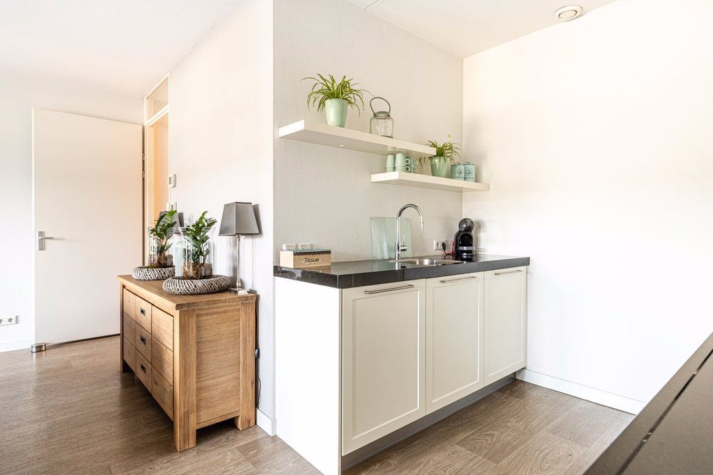 In het appartement, dat gelijkvloers is, voel je je direct thuis. De lichte kleuren en de vloer die overal doorloopt, geven een fijne sfeer. Via de ruime gang, kom je in de woonkamer. Deze is erg licht door de openslaande deuren naar het terras en de grote ramen. De keuken heeft een nieuwe koelkast en is verder uitgerust met een combi-oven, inductiekookplaat, afzuigkap, vrieskast en vaatwasser. Het composieten aanrechtblad geeft een luxe uitstraling aan de keuken.