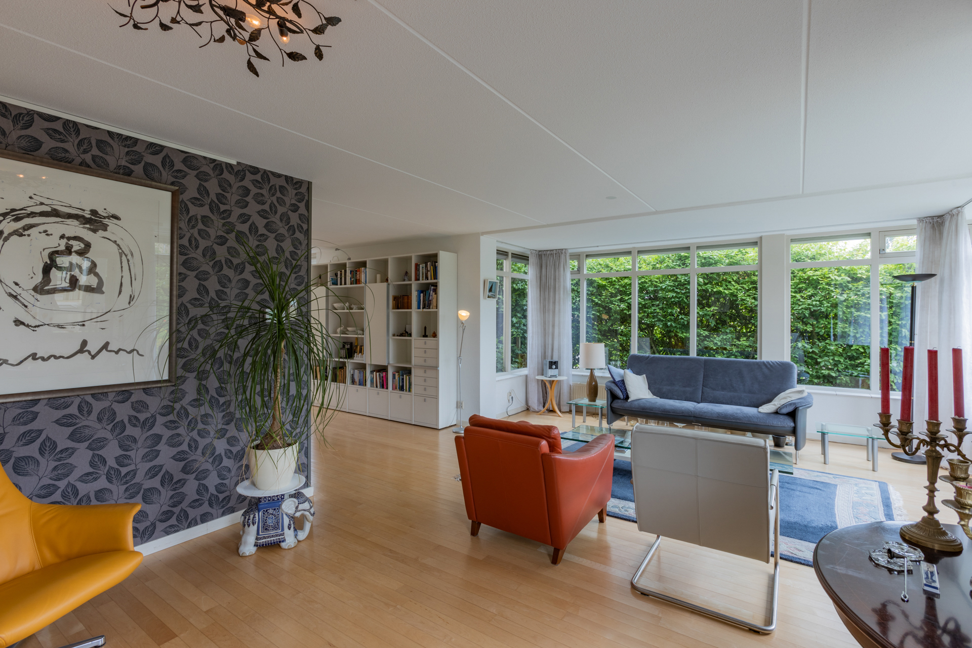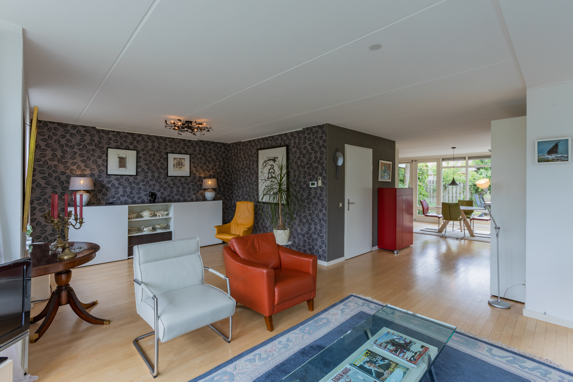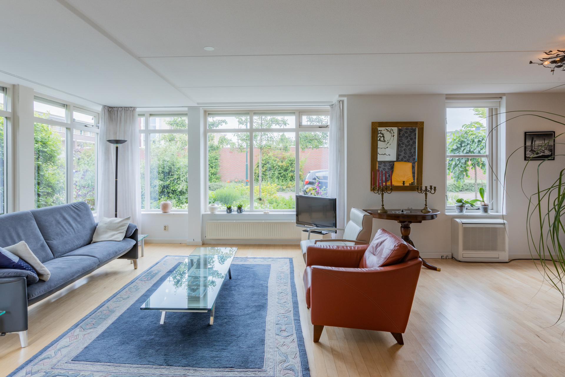 De woonkamer met parketvloer ligt aan de voorzijde van de woning. Door de vele raampartijen in de erker is dit een heerlijke lichte ruimte.