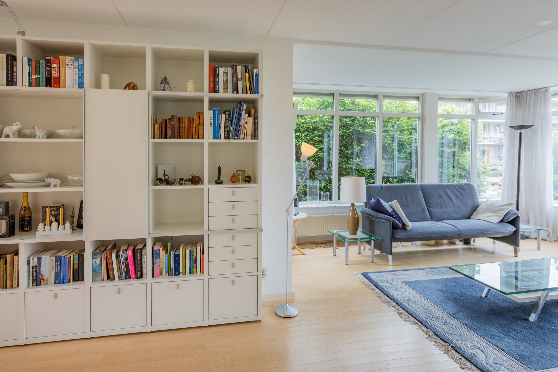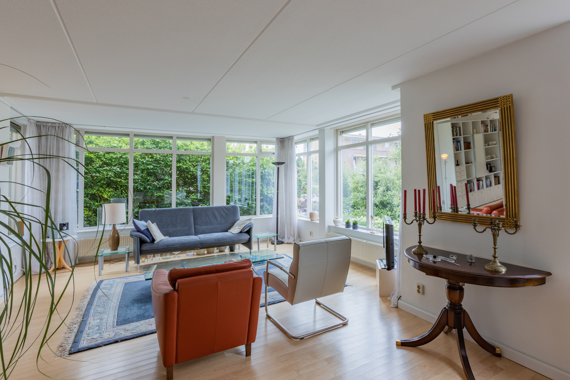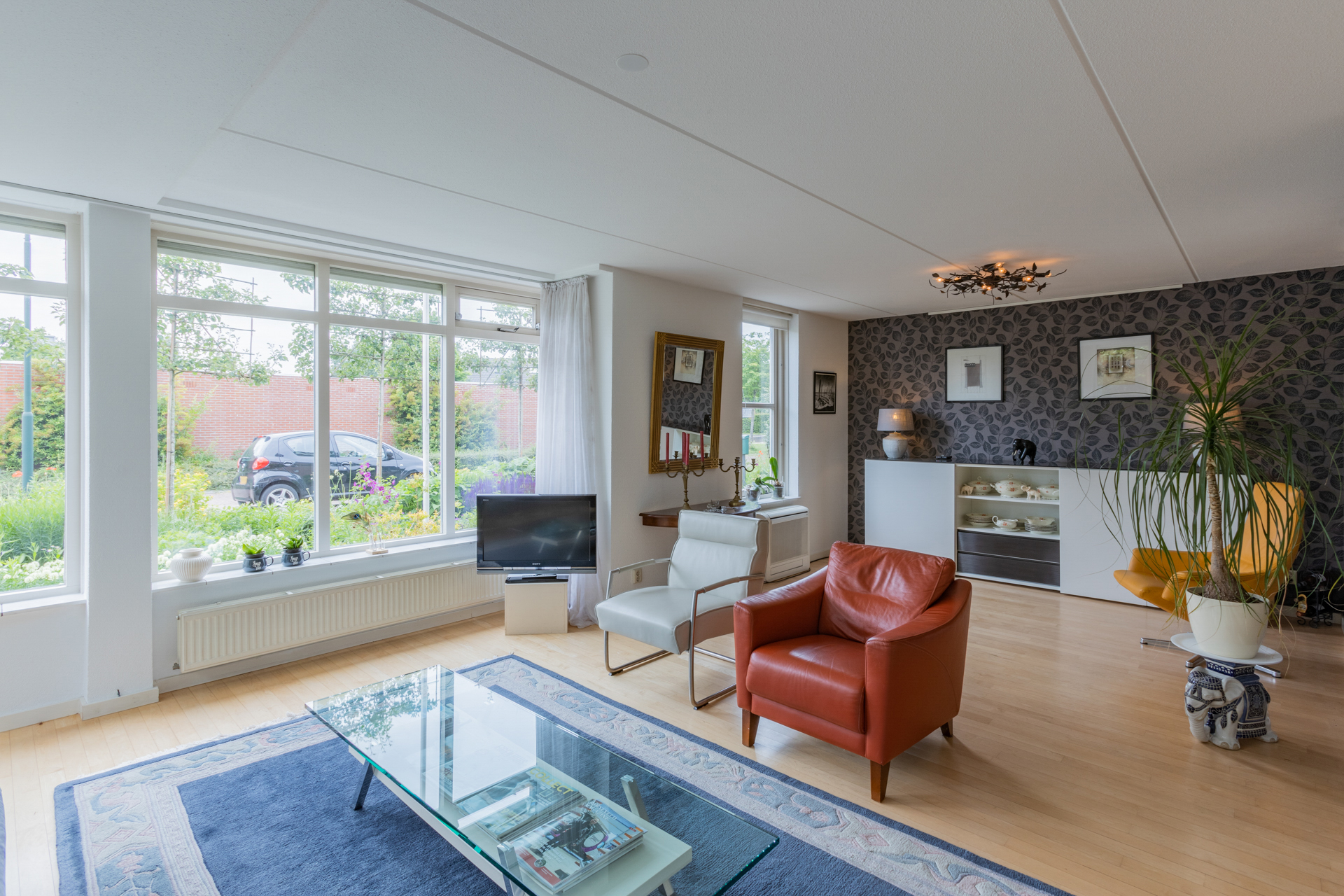 De woonkamer met parketvloer ligt aan de voorzijde van de woning. Door de vele raampartijen in de erker is dit een heerlijke lichte ruimte.