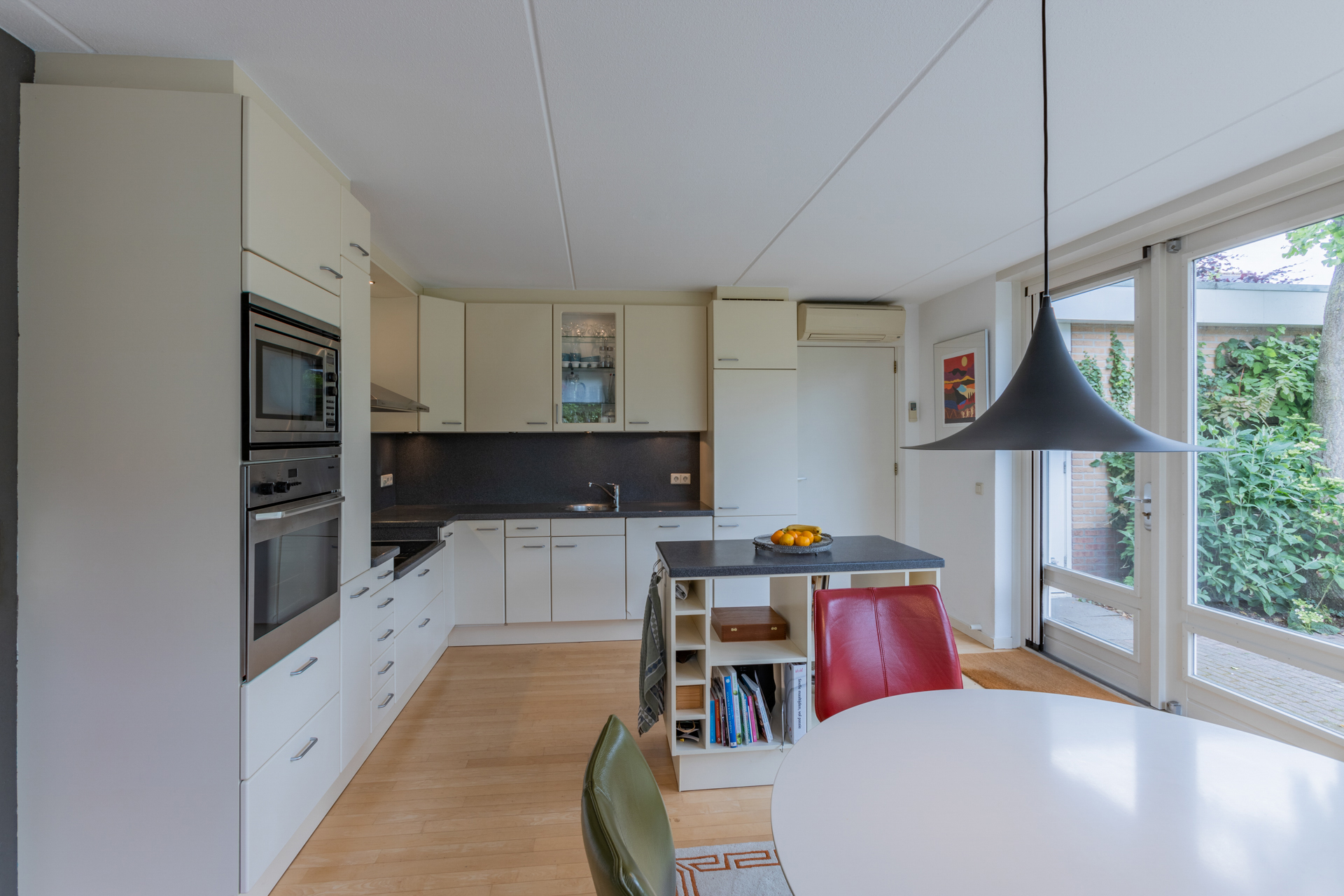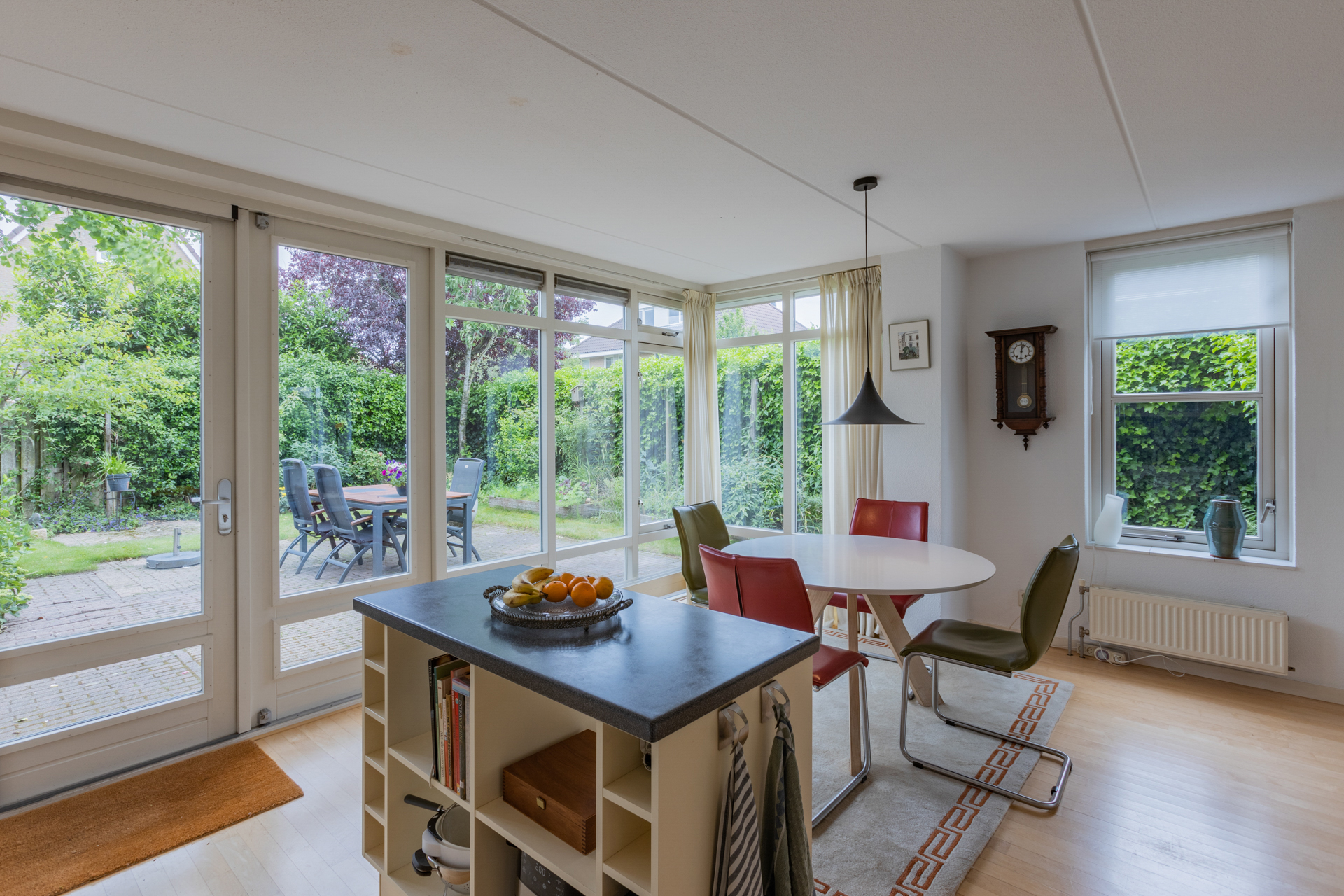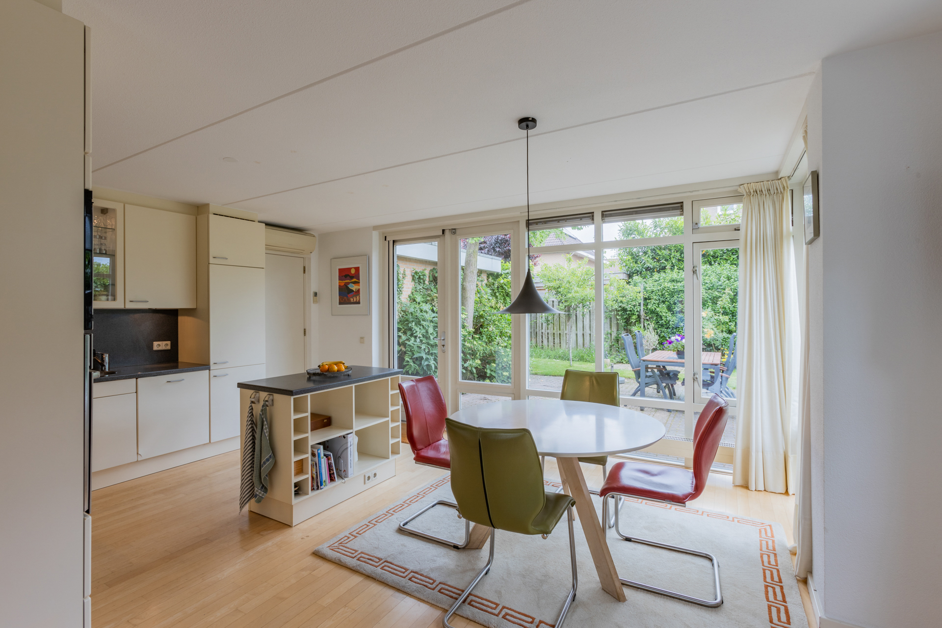 Vanuit de keuken met keukeneiland loop je door openslaande deuren direct de achtertuin in. De hoekkeuken met keukeneiland kijkt uit op de achtertuin.