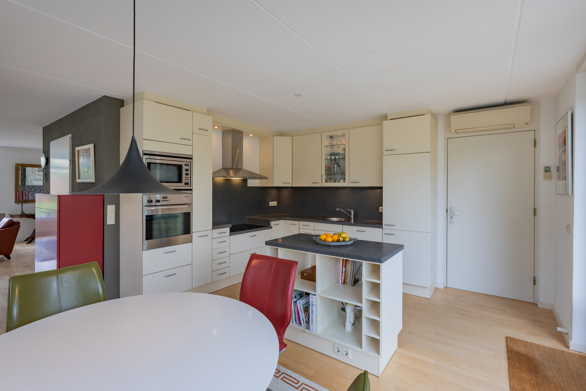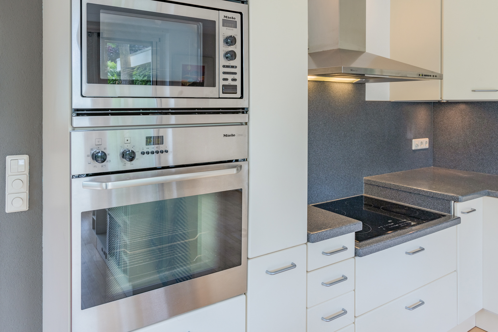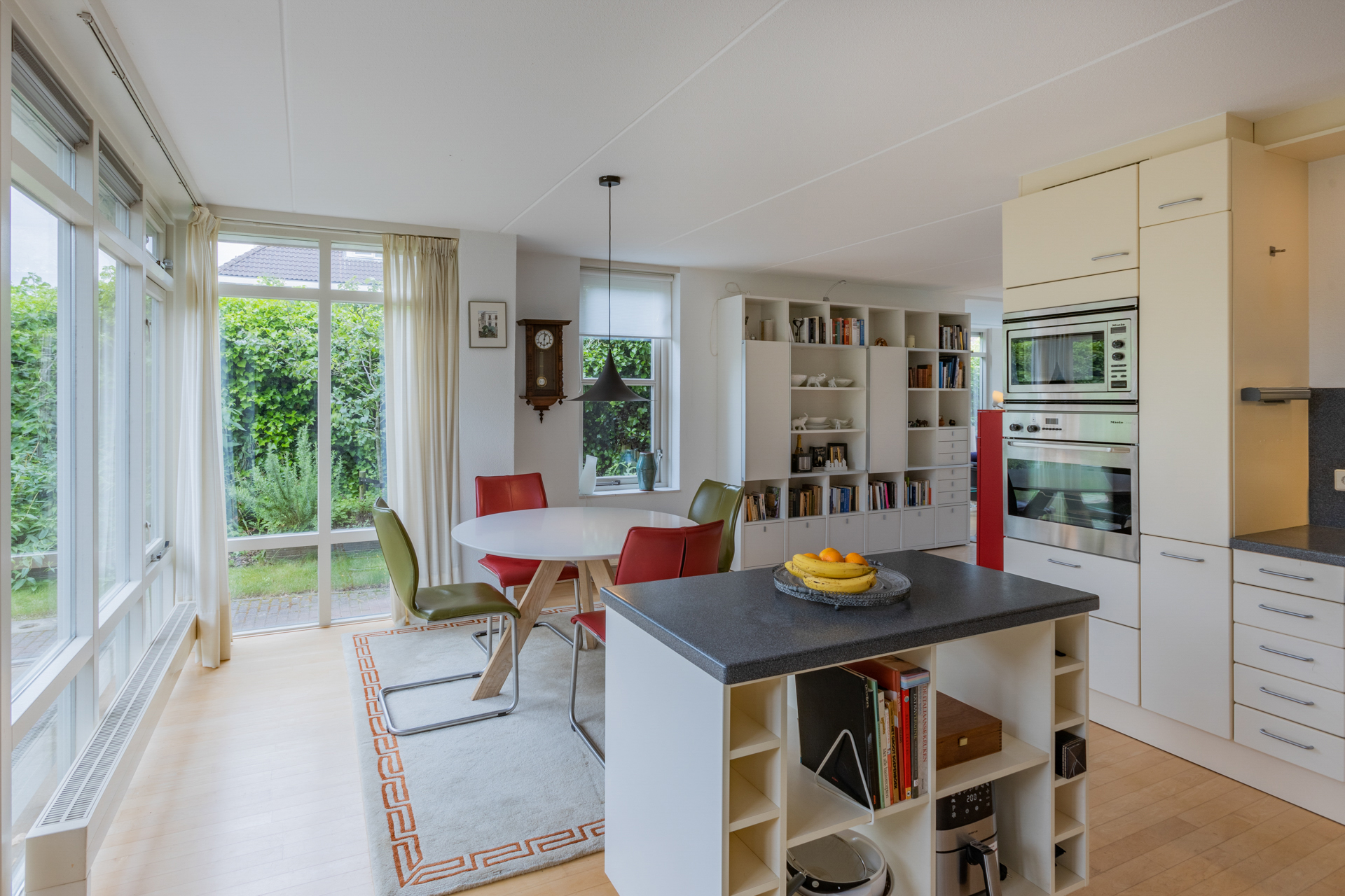 Vanuit de keuken met keukeneiland loop je door openslaande deuren direct de achtertuin in. De hoekkeuken met keukeneiland kijkt uit op de achtertuin.