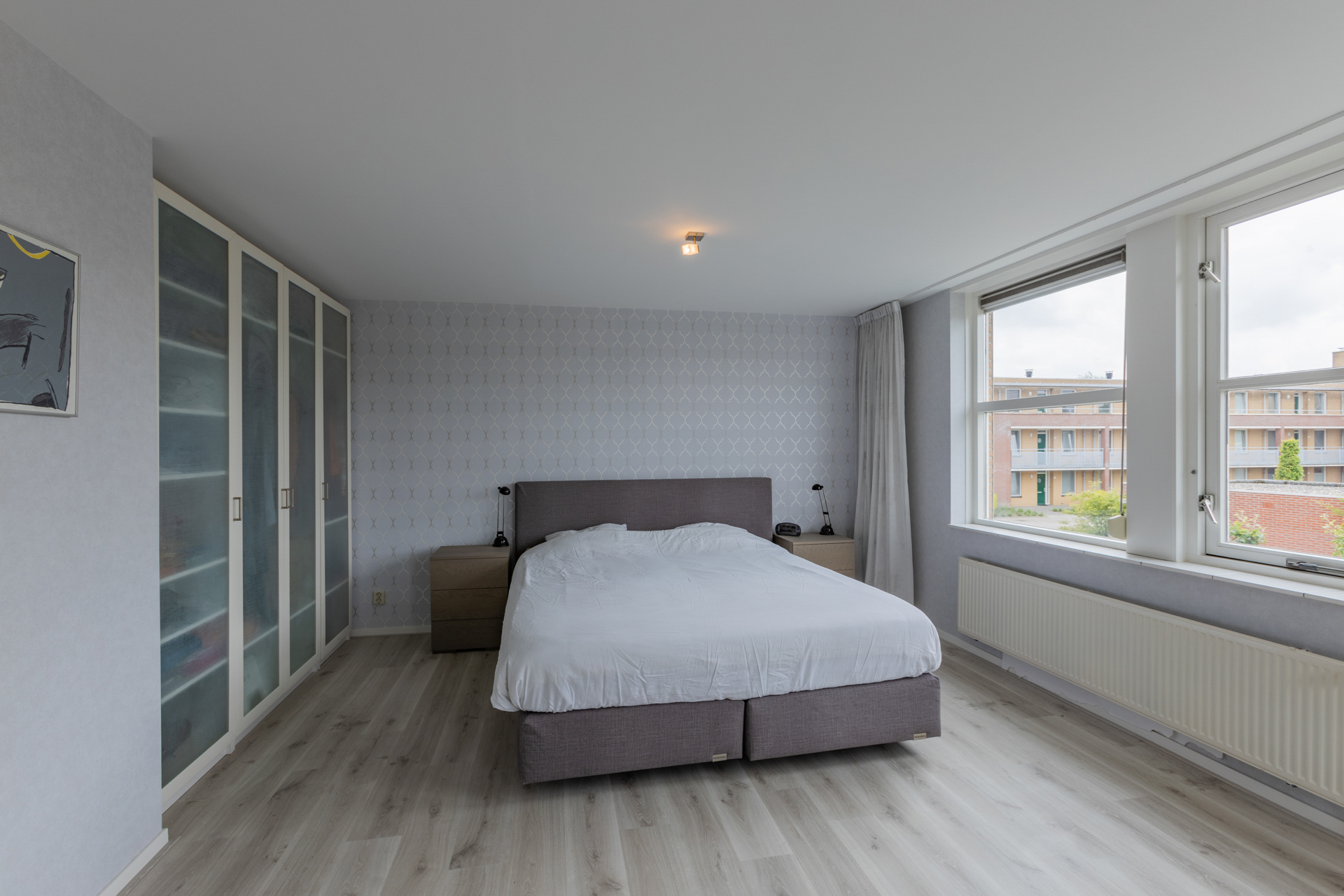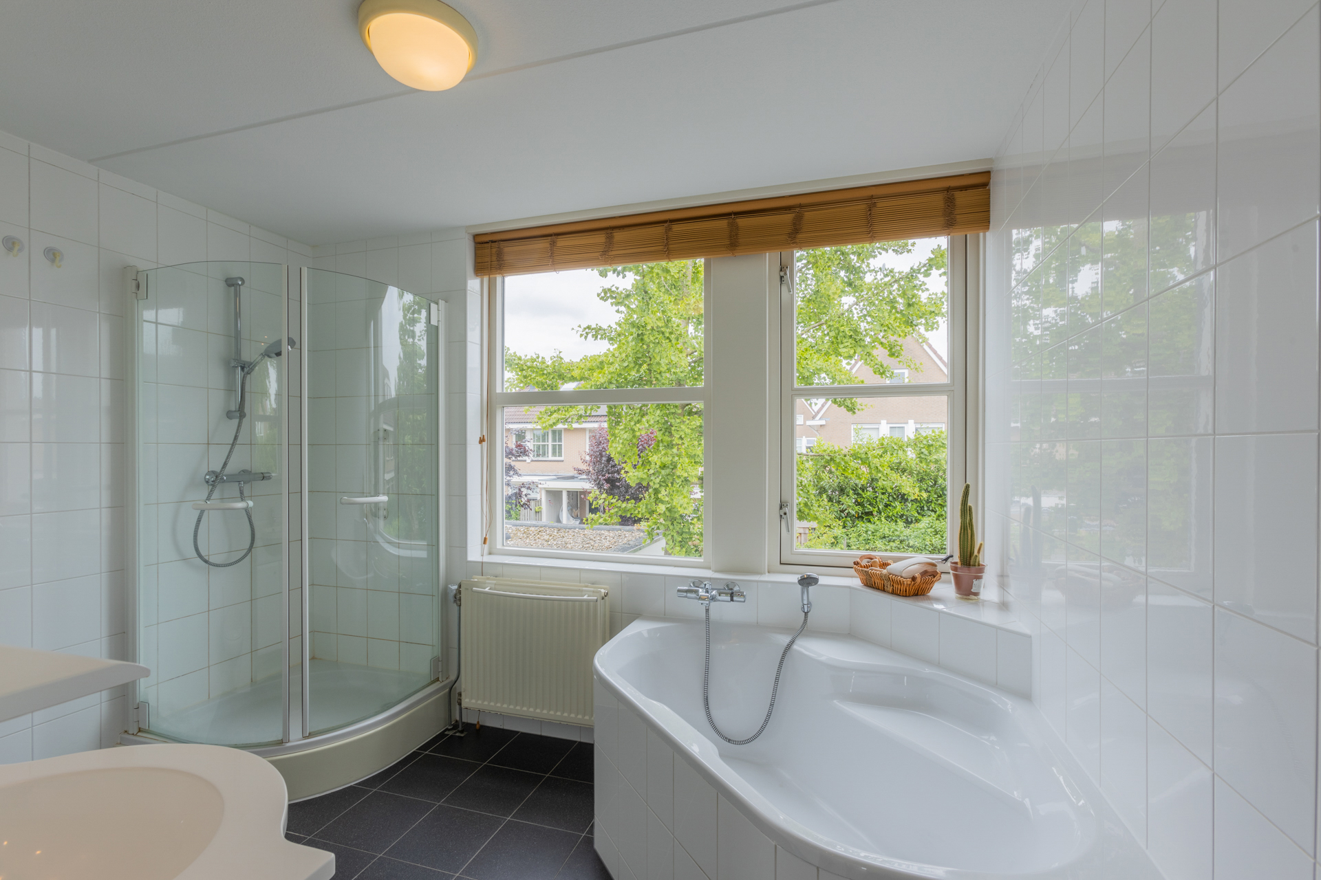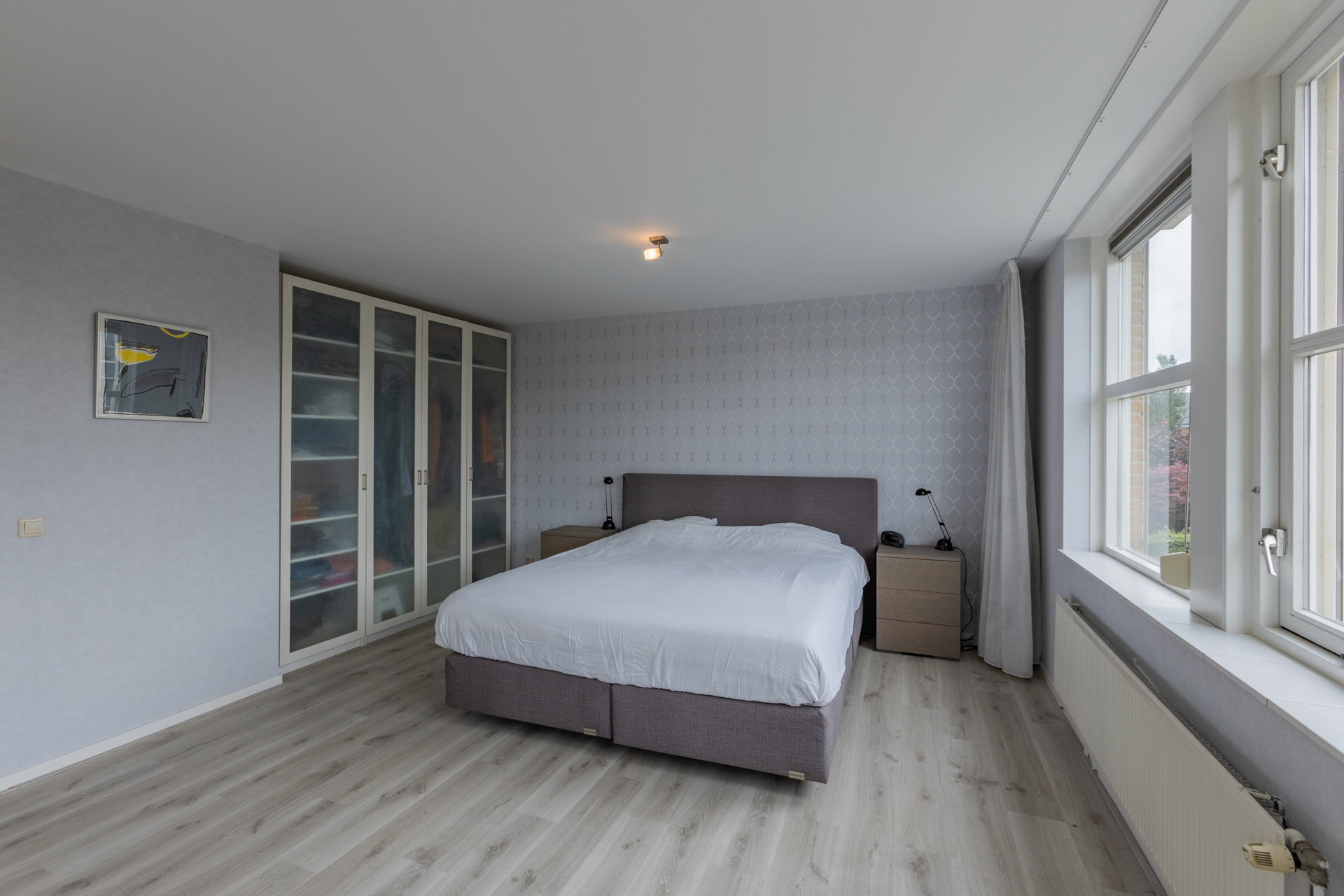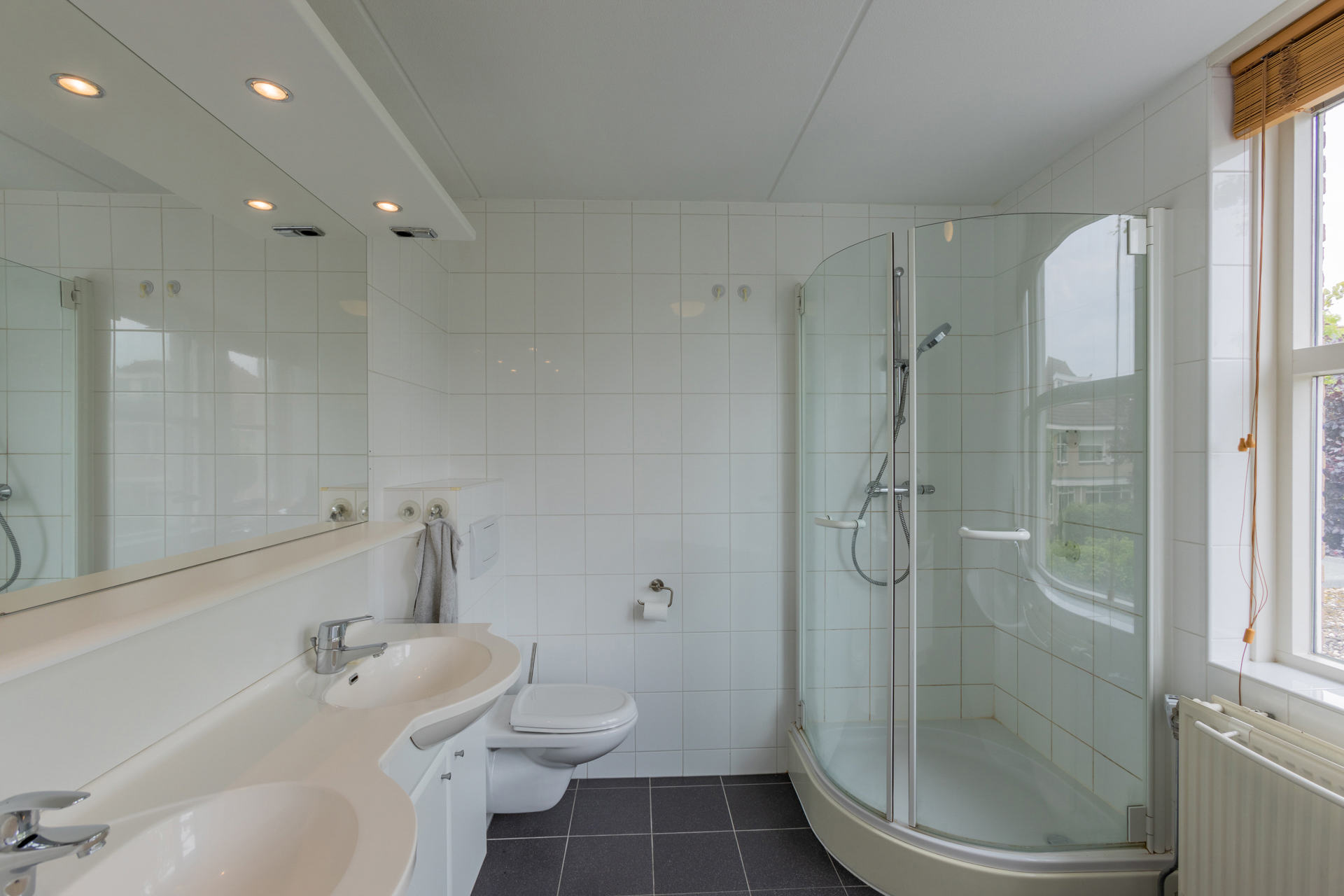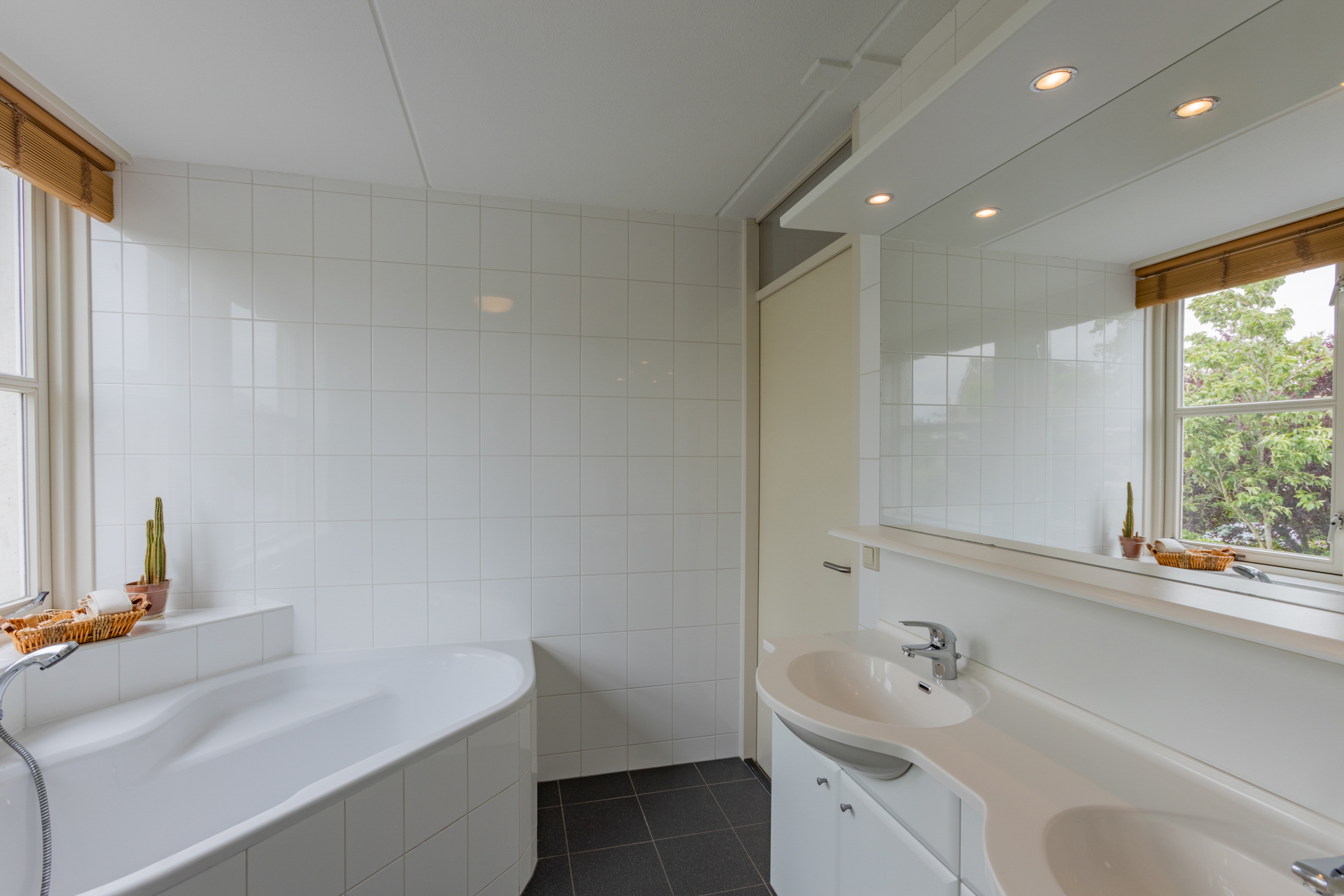 Op de eerste verdieping zijn twee slaapkamers samen gevoegd tot één grote kamer. Desgewenst is het eenvoudig om hier weer twee kamers van te maken; de deur is nog aanwezig. De andere slaapkamer is ook van een mooi formaat. De badkamer in neutrale kleurstelling is voorzien van een badmeubel met dubbele wastafels, bad, douche, en toilet. Het geheel ziet er nog keurig uit. Mocht je echter andere wensen hebben, dan is de ruimte dermate groot en licht dat iedere wellnessdroom hier gerealiseerd kan worden.