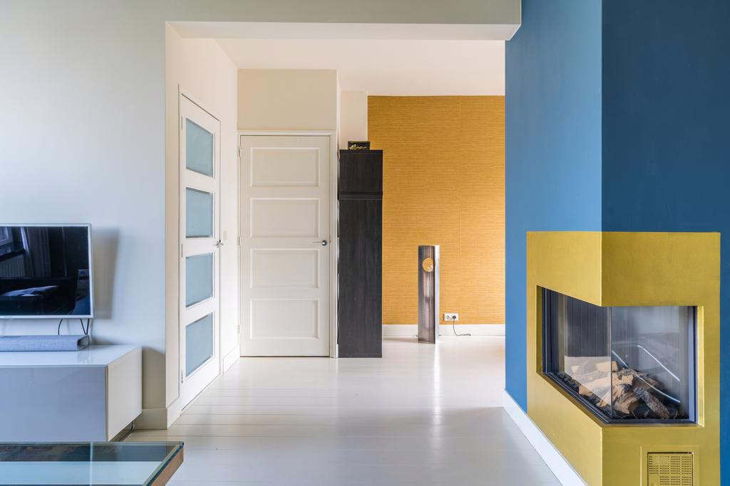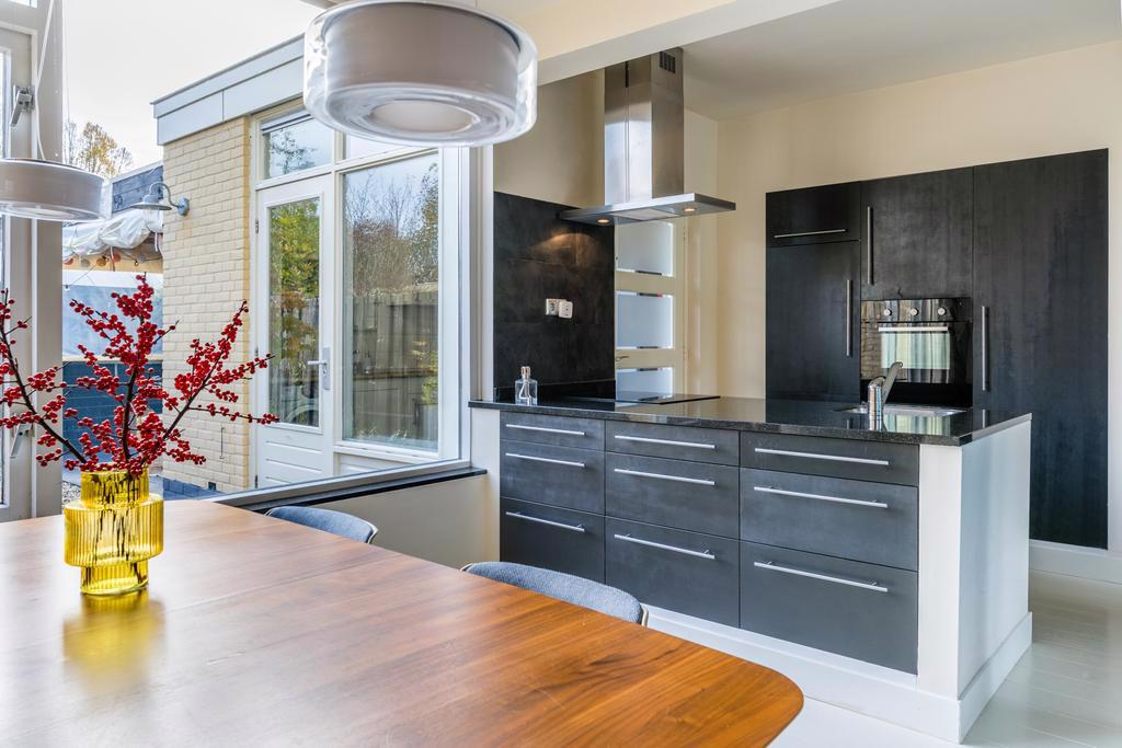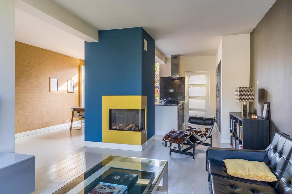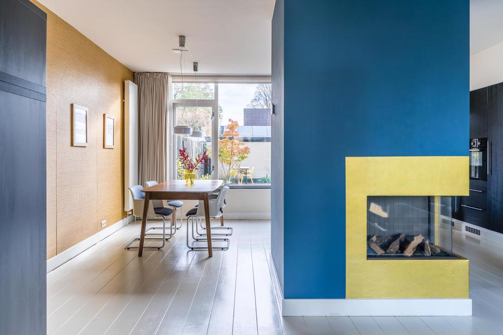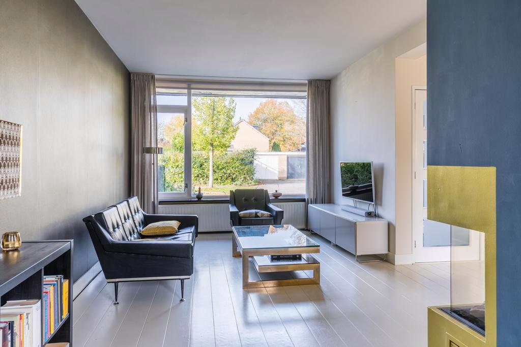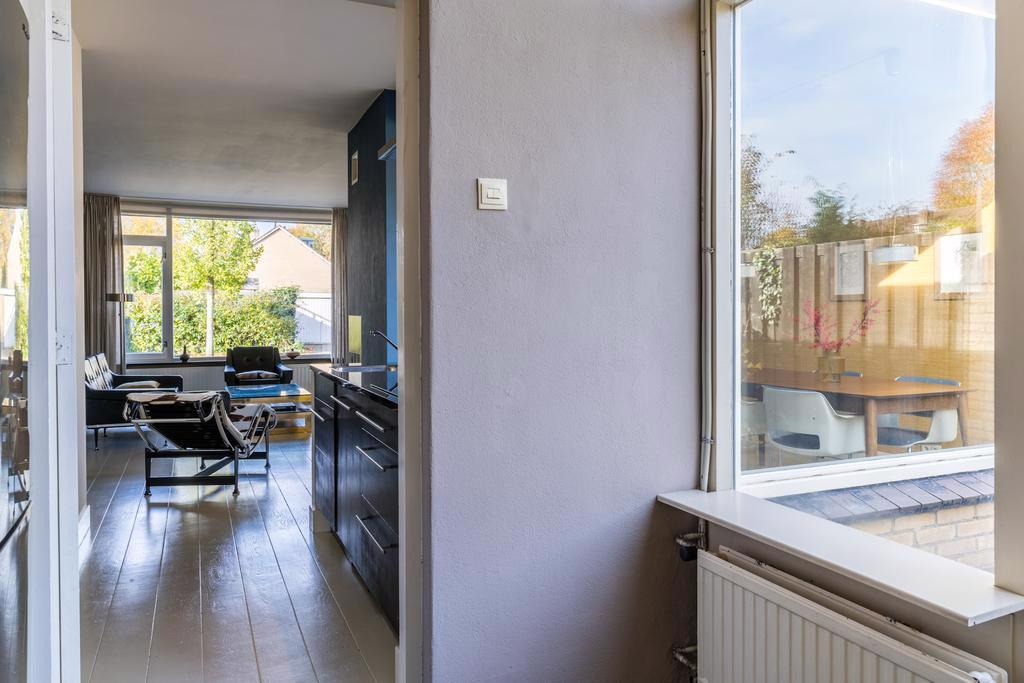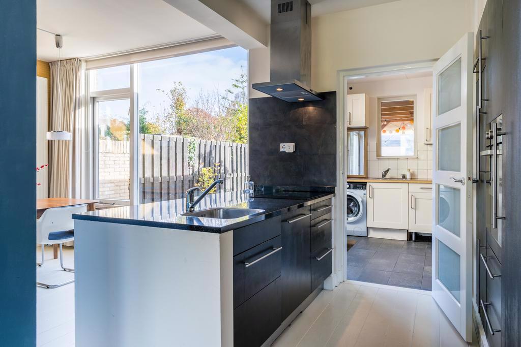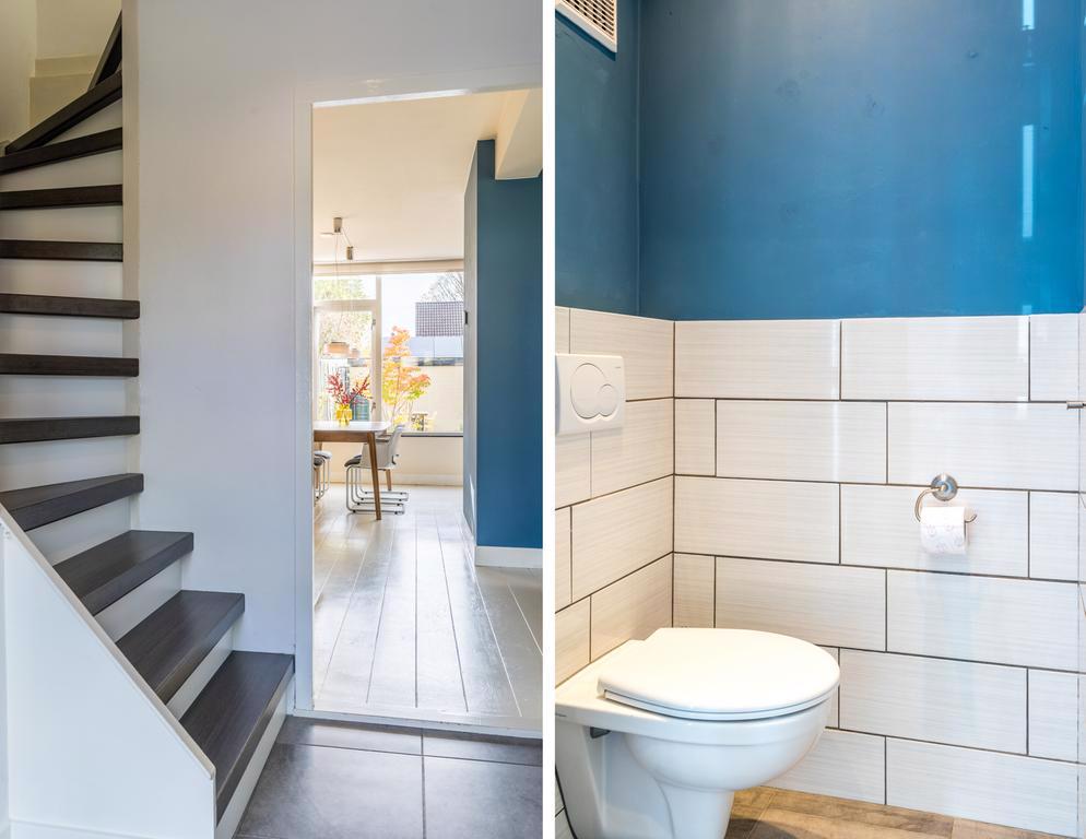 Hal met toilet en strak afgewerkte trap naar de 1e verdieping. De begane grond is voorzien van houten paneeldeuren, hoge plinten en gestucte plafonds. Door de grote raampartijen en wit geschilderde houten vloer is de kamer licht en ruimtelijk. De gashaard geeft je met één druk op de knop warmte en extra sfeer. De keuken heeft aan één zijde een inbouwwand met een oven en veel kastruimte. Het keukeneiland staat met een kant tegen de muur en heeft een natuurstenen aanrechtblad, vaatwasser en een inductiekookplaat.