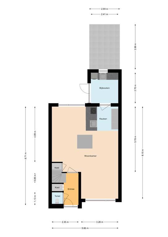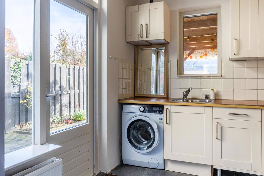 In de praktische bijkeuken is ruimte voor een koelkast, de wasmachine en is er extra bergruimte in de keukenkastjes.