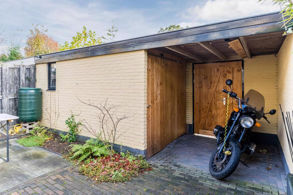 In de berging is voldoende ruimte voor fietsen en tuingereedschap. De extra brede poortdeur en schuurdeur zijn vervangen, zodat ook een motor goed naar binnen kan.