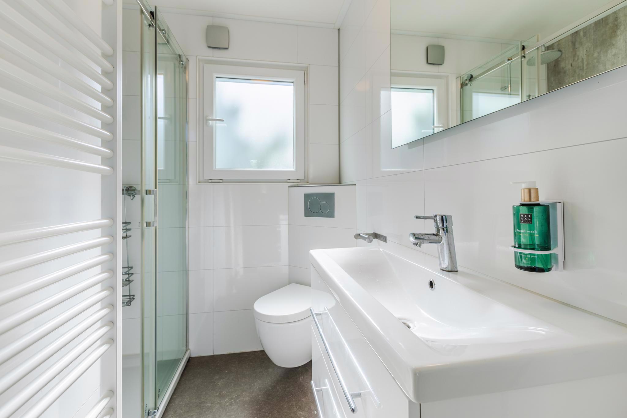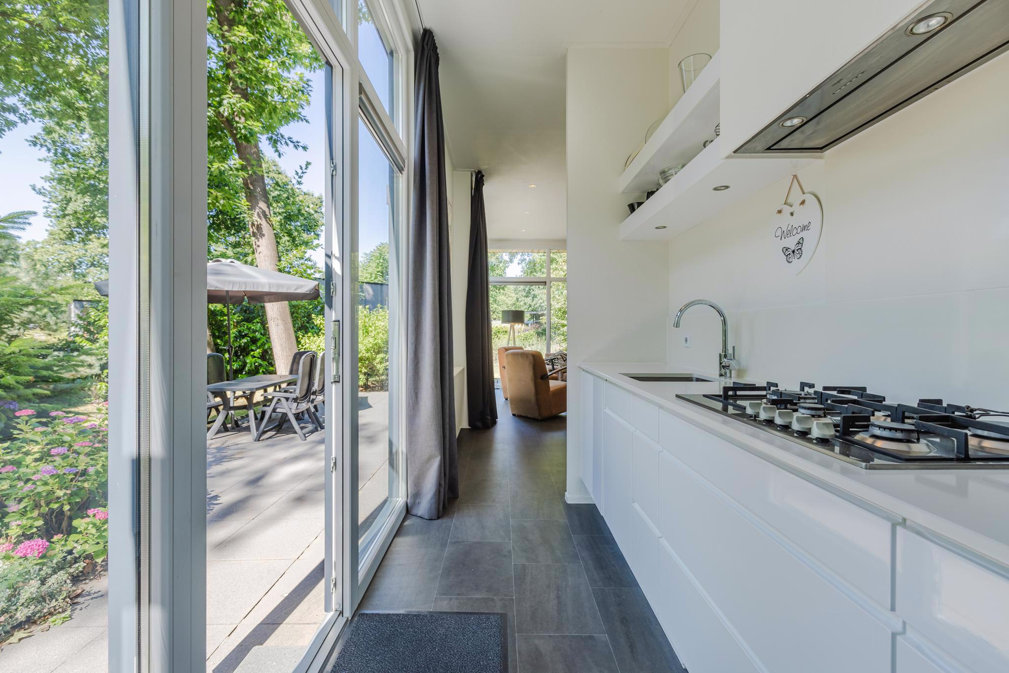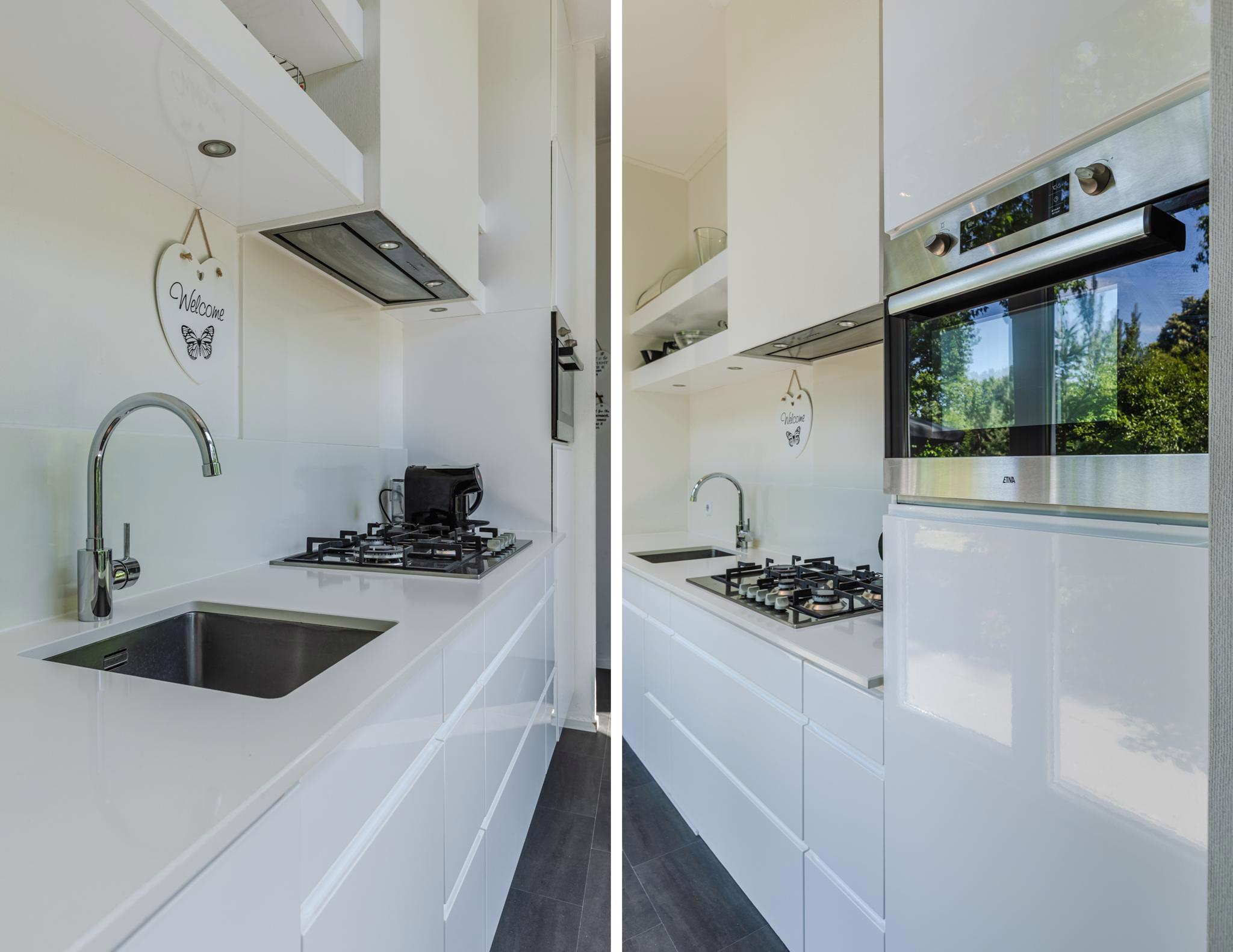 Bij binnenkomst valt het hoge plafond met inbouwspots op, wat zorgt voor een ruimtelijk gevoel. De moderne hoogglans keuken in witte kleurstelling is voorzien van een 5-pits gaskookplaat, afzuigkap, vaatwasser, combi-magnetron en een koelkast met vriesvak; alles wat je nodig hebt is aanwezig. De lichte en gezellige woonkamer met uitzicht op het water heeft een gezellige zithoek en eettafel met stoelen. De tv, stoelen en bankstel zijn in 2023 vernieuwd. Vanuit de woonkamer heb je zicht op het water en via de schuifdeur loop je direct het terras op.