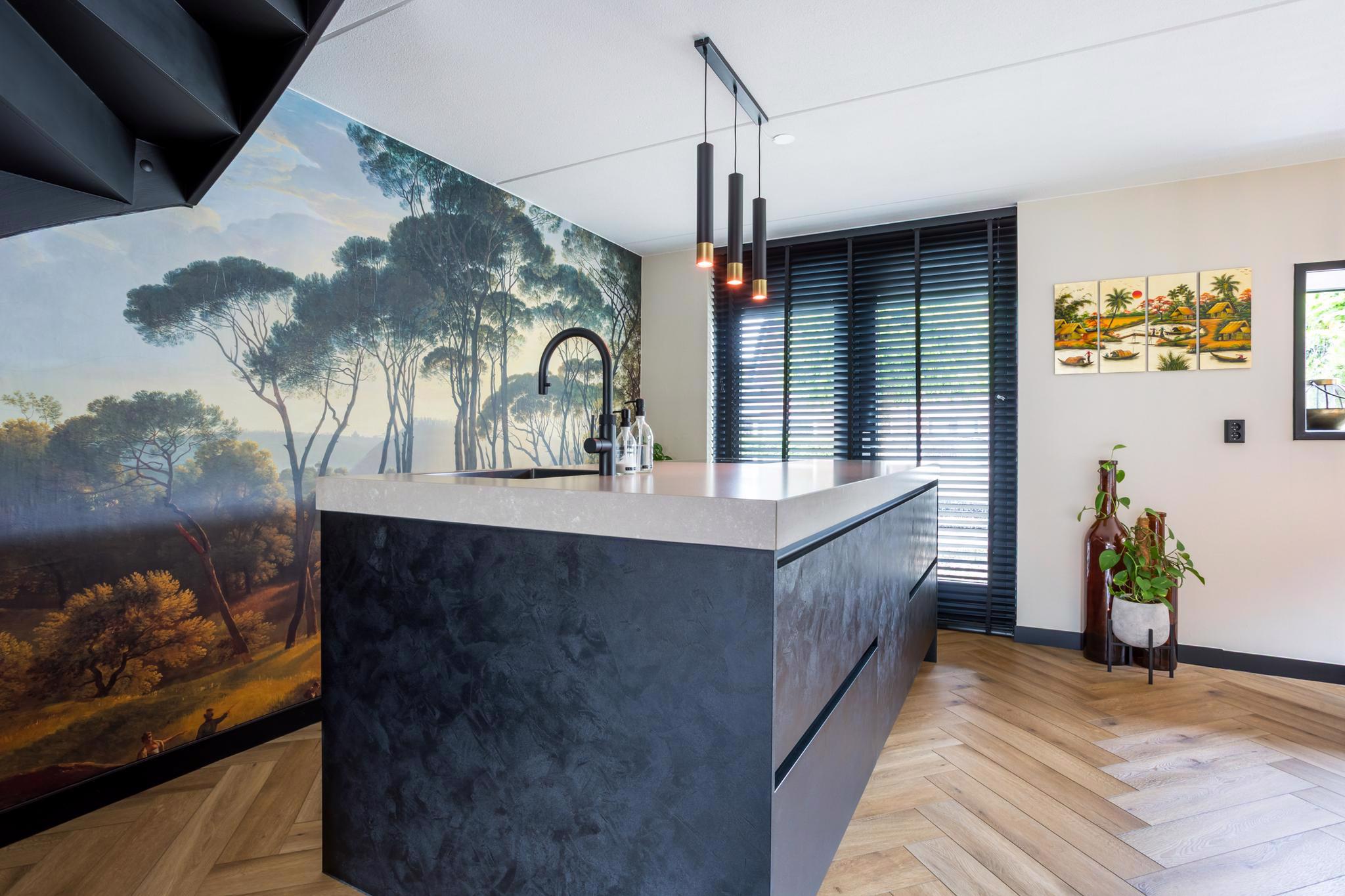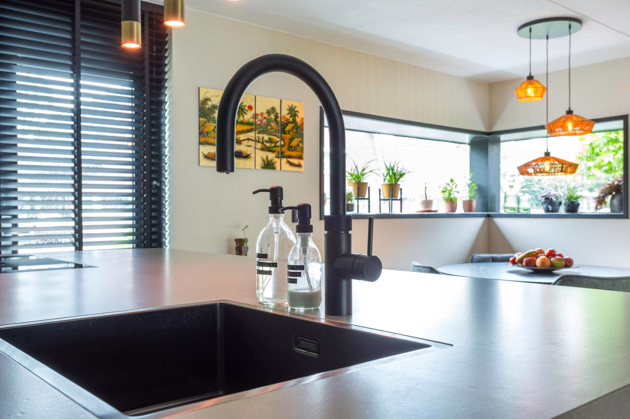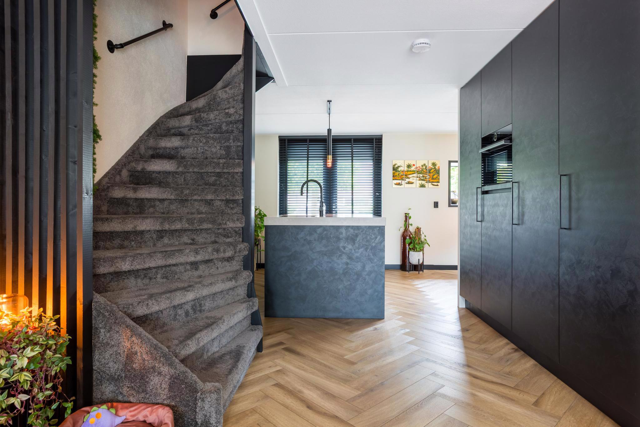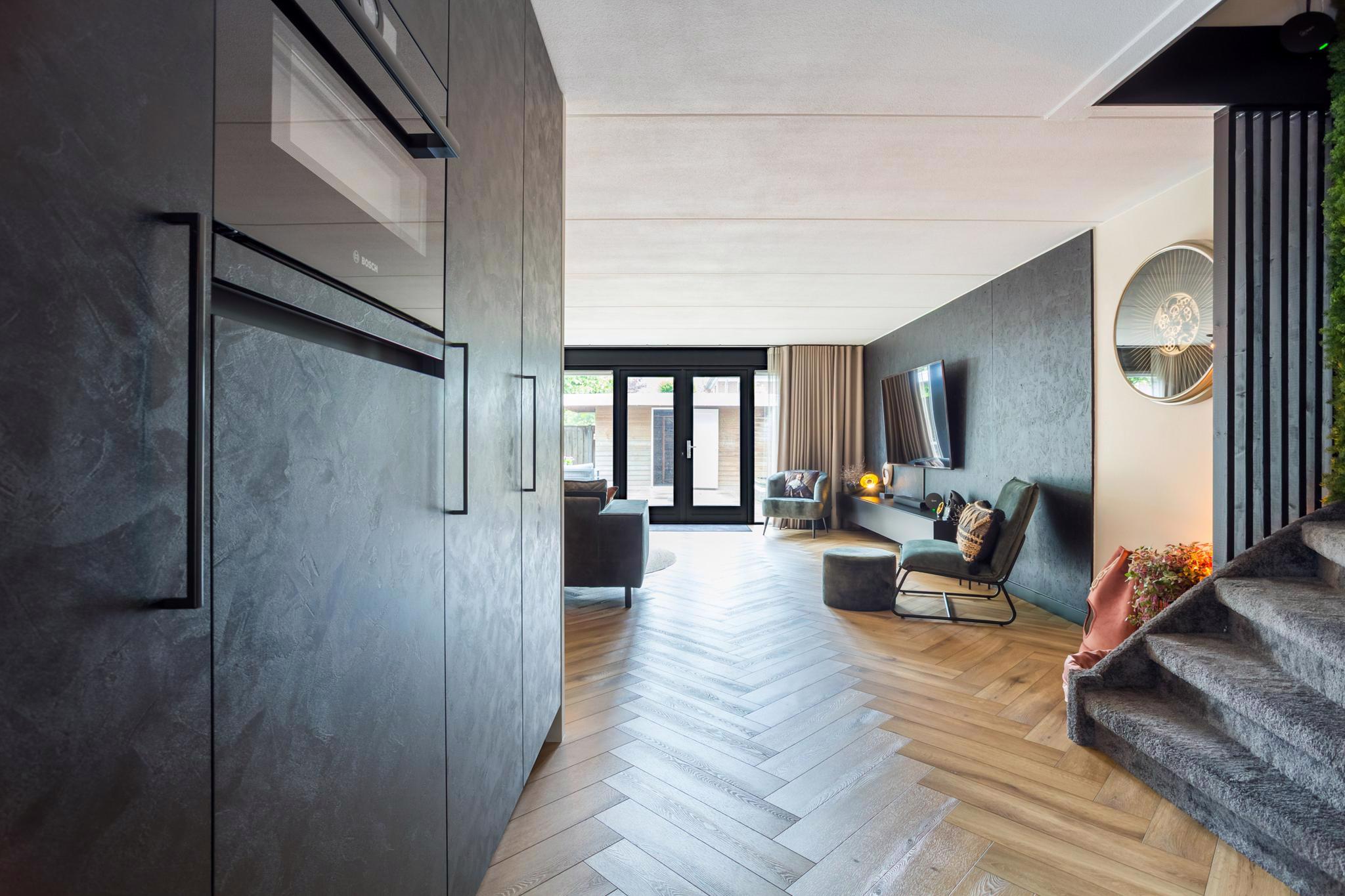Je komt binnen in een ruime hal met toilet en trapopgang. Via de glazen deur met stalen look kom je in de uitgebouwde woonkamer. Hier is ontzettend veel ruimte en heeft zowel aan de voor- als achterkant openslaande deuren naar de tuin. De PVC visgraatvloer geeft de ruimte een moderne en sfeervolle uitstraling. De open keuken ligt aan de voorzijde van de woning en is een ware eyecatcher: voorzien van een kook/spoeleiland met inductiekookplaat met afzuiging, Quooker en een vaatwasser. In de kastenwand van de keuken vind je een grote koelkast, vriezer en een combi-oven. Kookliefhebbers kunnen zich hier helemaal uitleven!