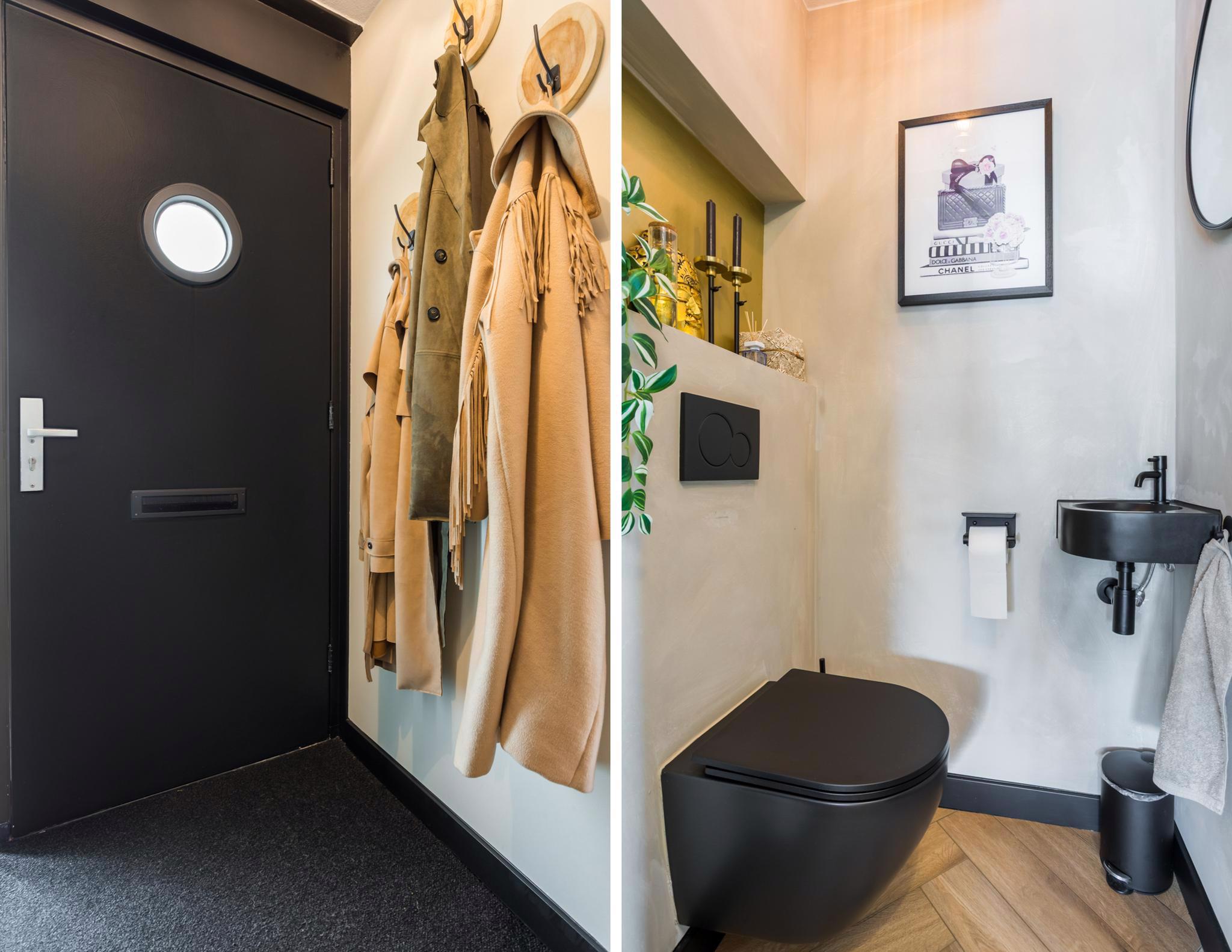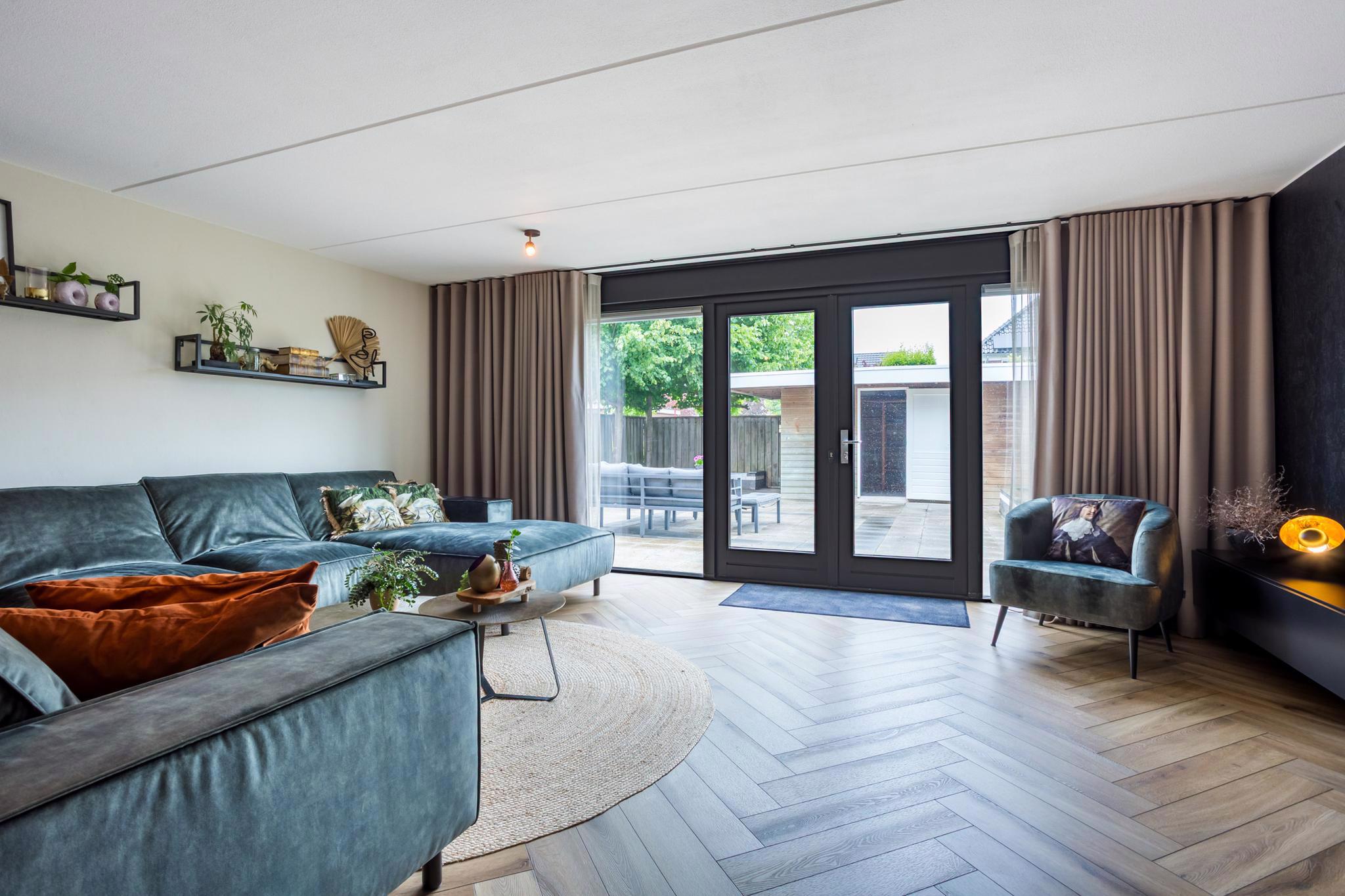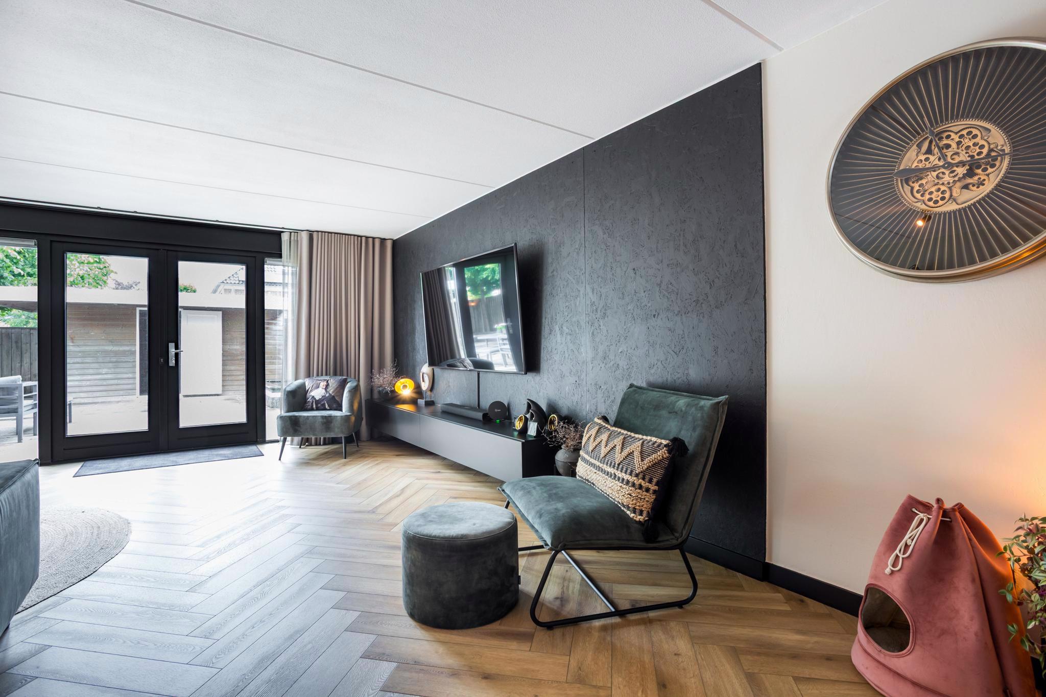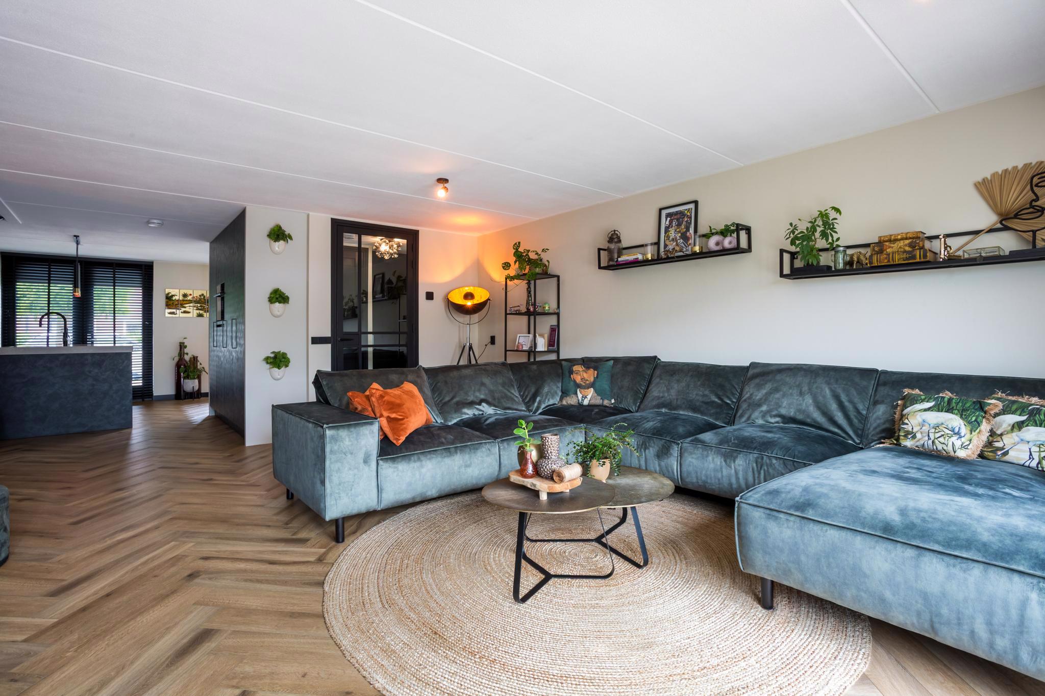 Je komt binnen in een ruime hal met toilet en trapopgang. Via de glazen deur met stalen look kom je in de uitgebouwde woonkamer. Hier is ontzettend veel ruimte en heeft zowel aan de voor- als achterkant openslaande deuren naar de tuin. De PVC visgraatvloer geeft de ruimte een moderne en sfeervolle uitstraling. De open keuken ligt aan de voorzijde van de woning en is een ware eyecatcher: voorzien van een kook/spoeleiland met inductiekookplaat met afzuiging, Quooker en een vaatwasser. In de kastenwand van de keuken vind je een grote koelkast, vriezer en een combi-oven. Kookliefhebbers kunnen zich hier helemaal uitleven!