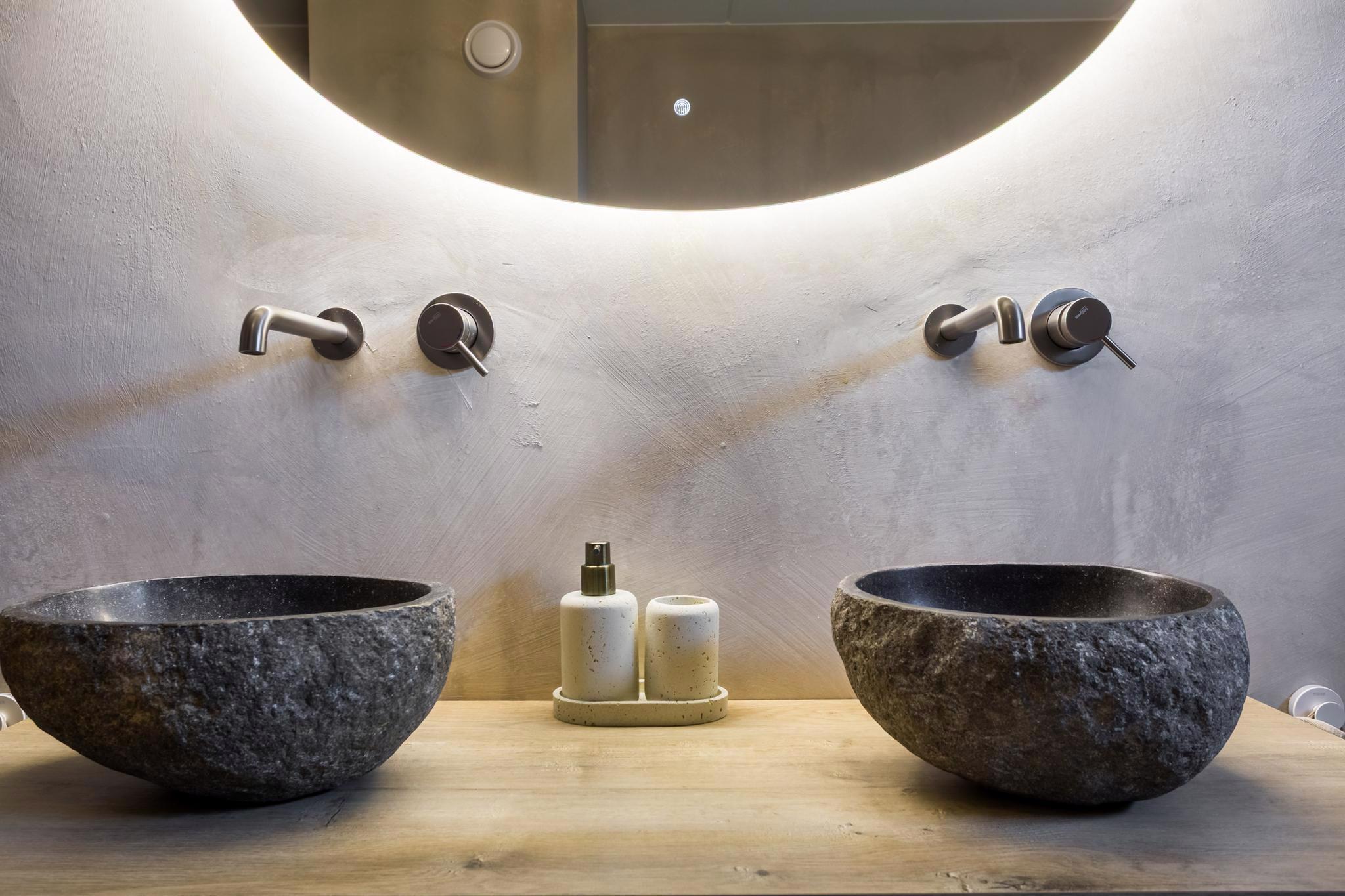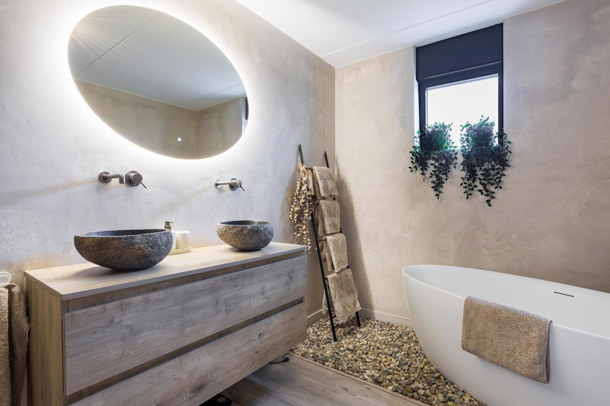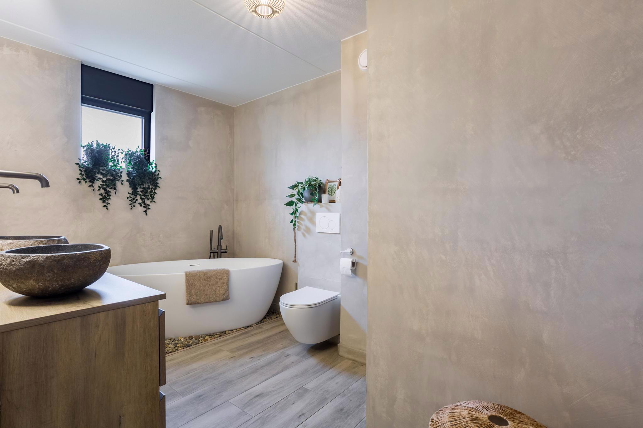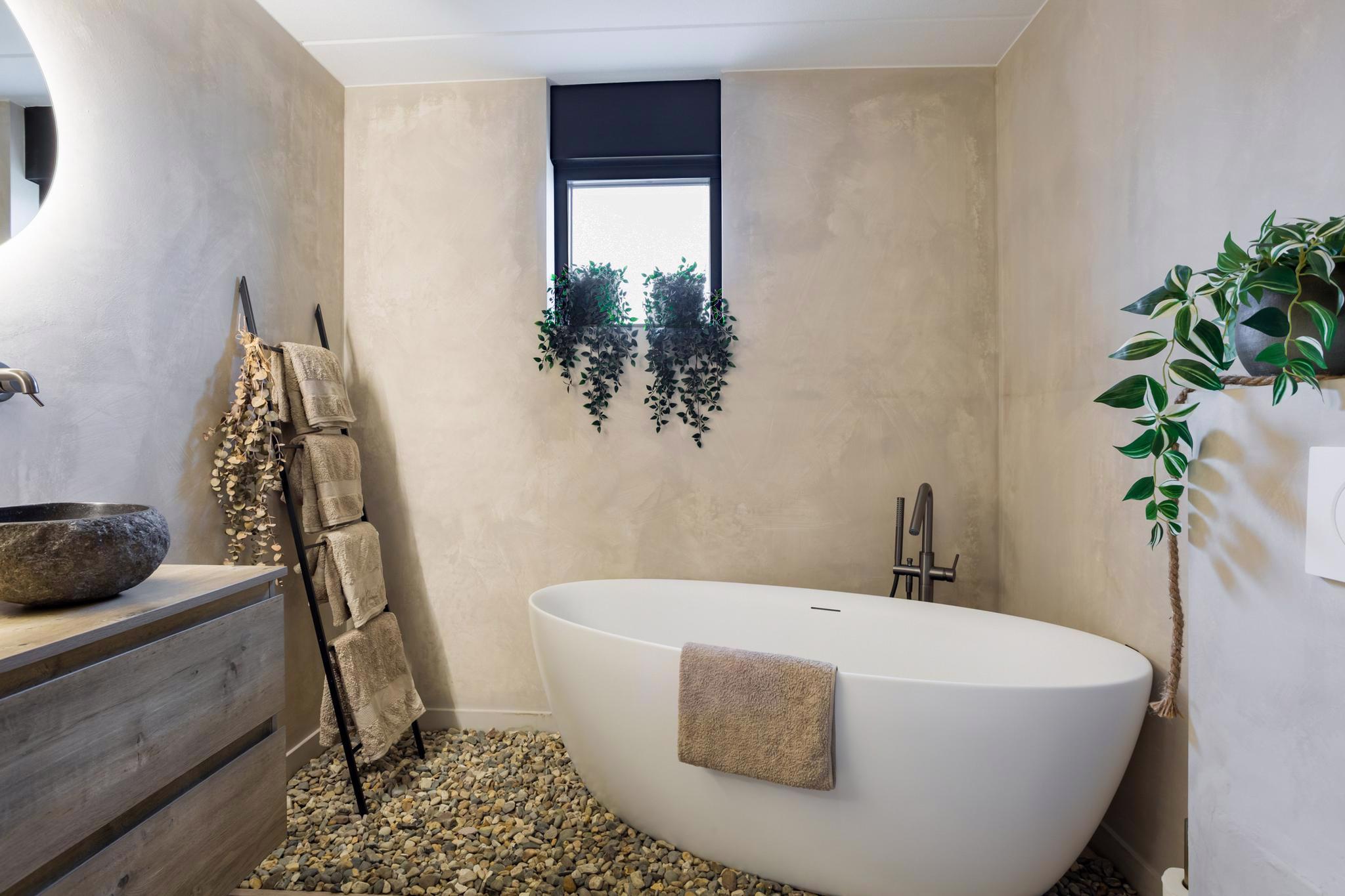 Ook hier is alles aangepakt en tot in de puntjes verzorgd! Je kunt relaxen in deze droombadkamer met een vrijstaand bad, badmeubel met twee waskommen, een toilet en inloopdouche. Met de gestucte wanden, tegels in houtlook en de kiezelstenen rond het bad is hier een fijne wellness-sfeer gecreëerd. Op deze verdieping vind je verder drie slaapkamers met heerlijke comfortabele vloerbedekking die ook is doorgelegd op de trap.