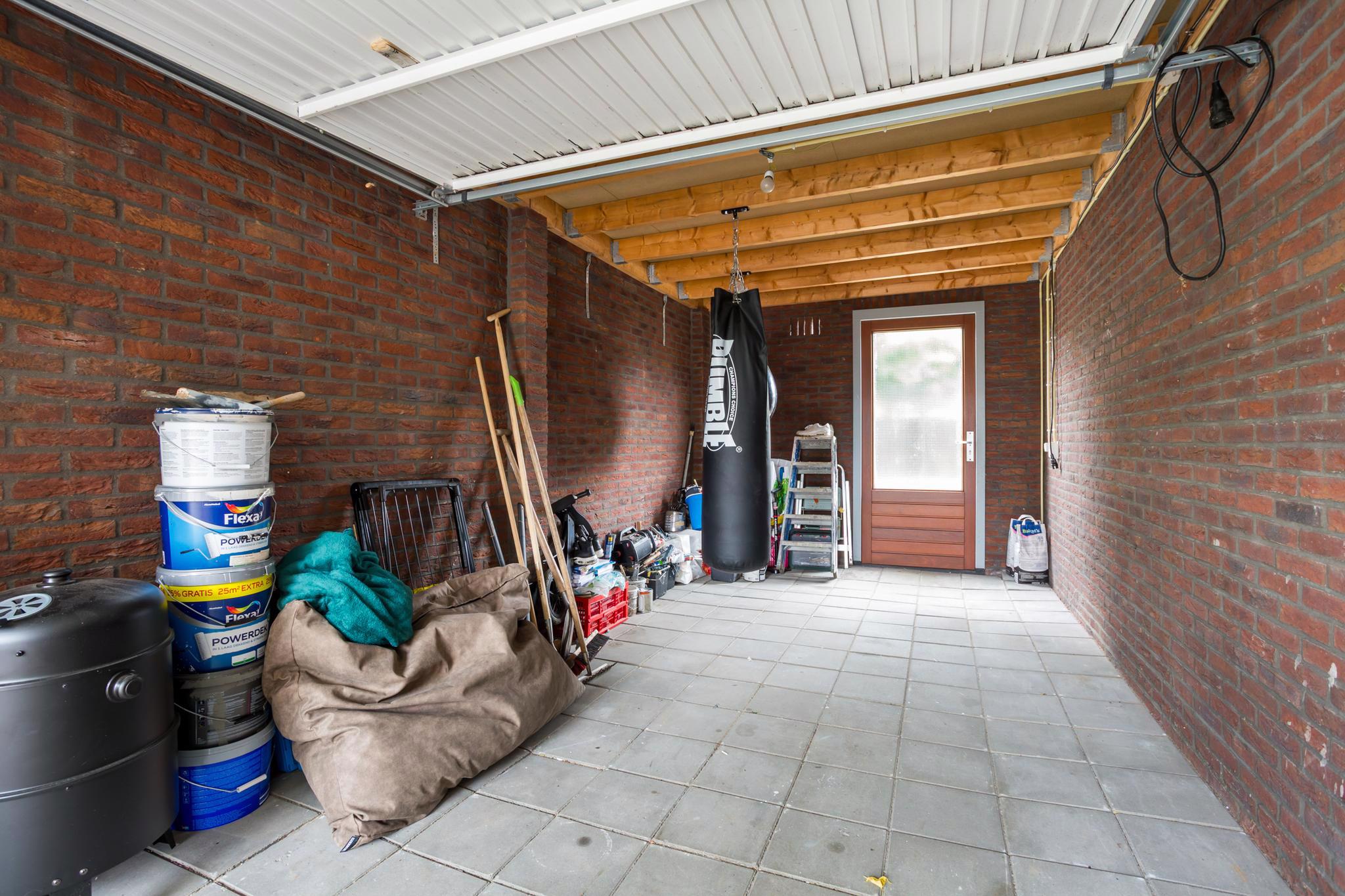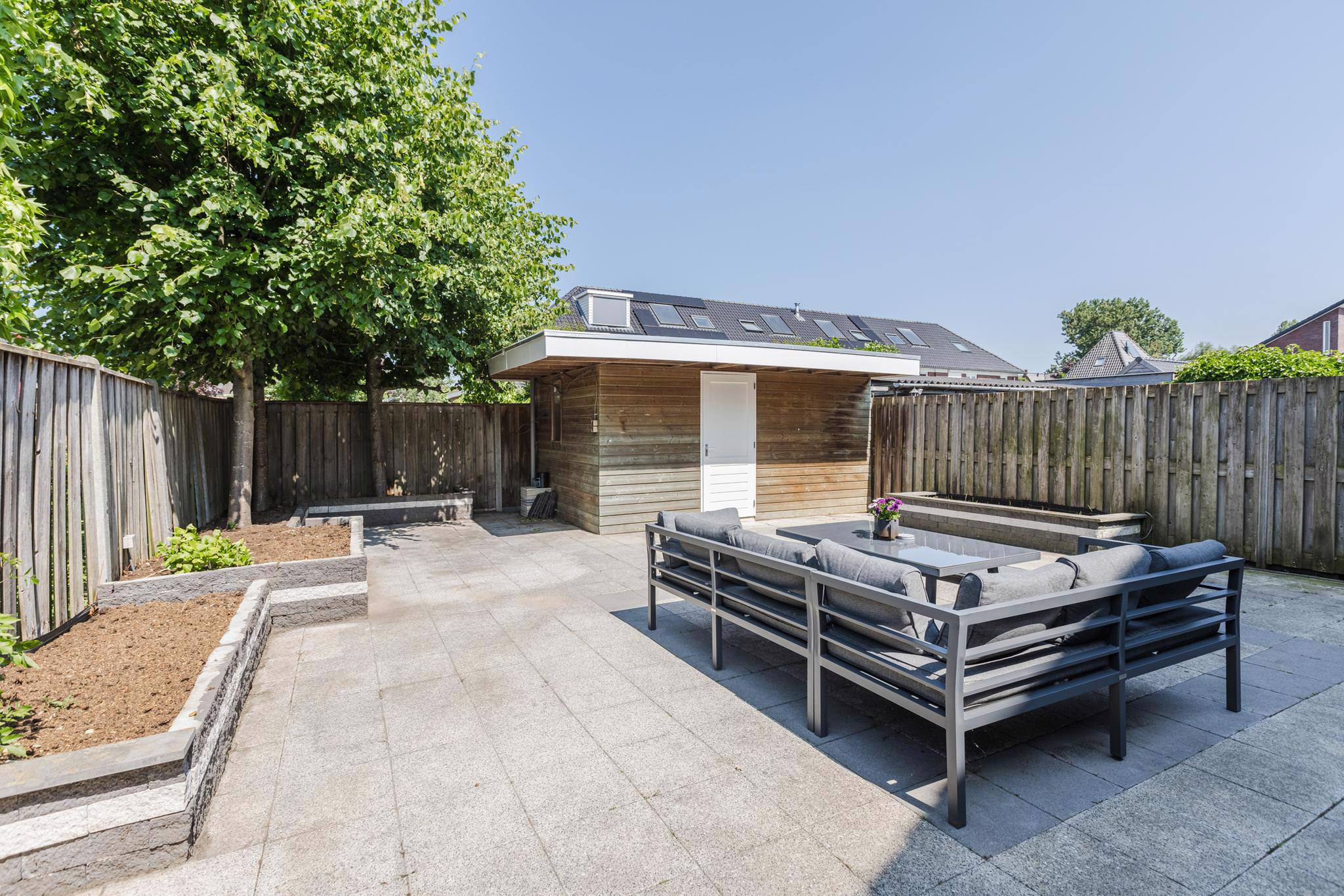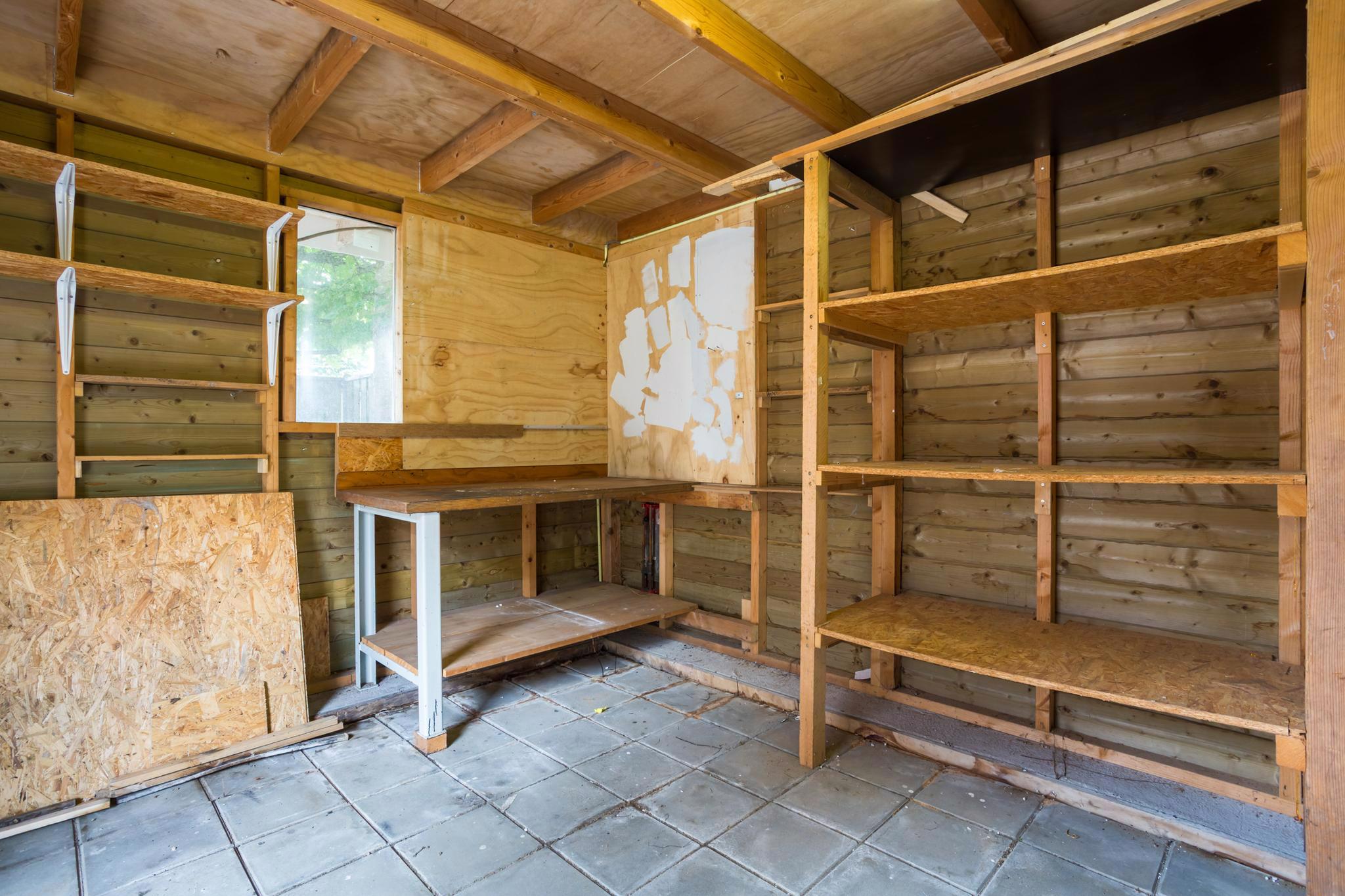 De achtertuin ligt op het noordwesten en is bereikbaar via een poortdeur. Er is een grote houten berging aanwezig. De aangebouwde stenen garage is voorzien van een garagedeur en een loopdeur naar de achtertuin. Je kunt de auto op je eigen oprit kwijt, maar er is ook voldoende parkeergelegenheid langs de weg.