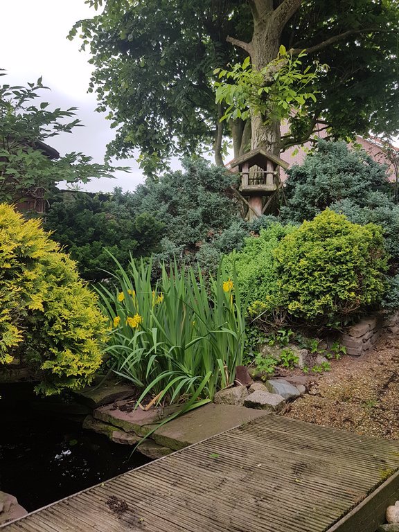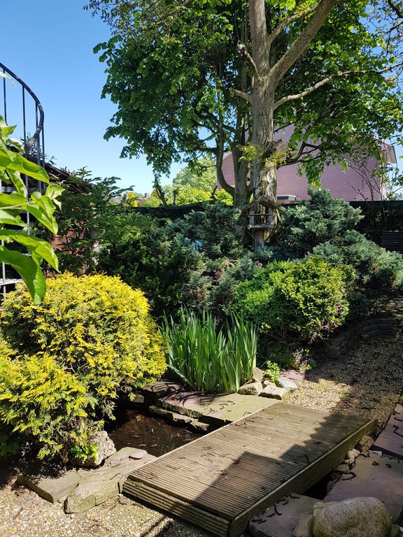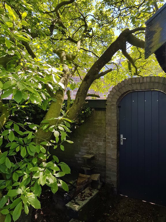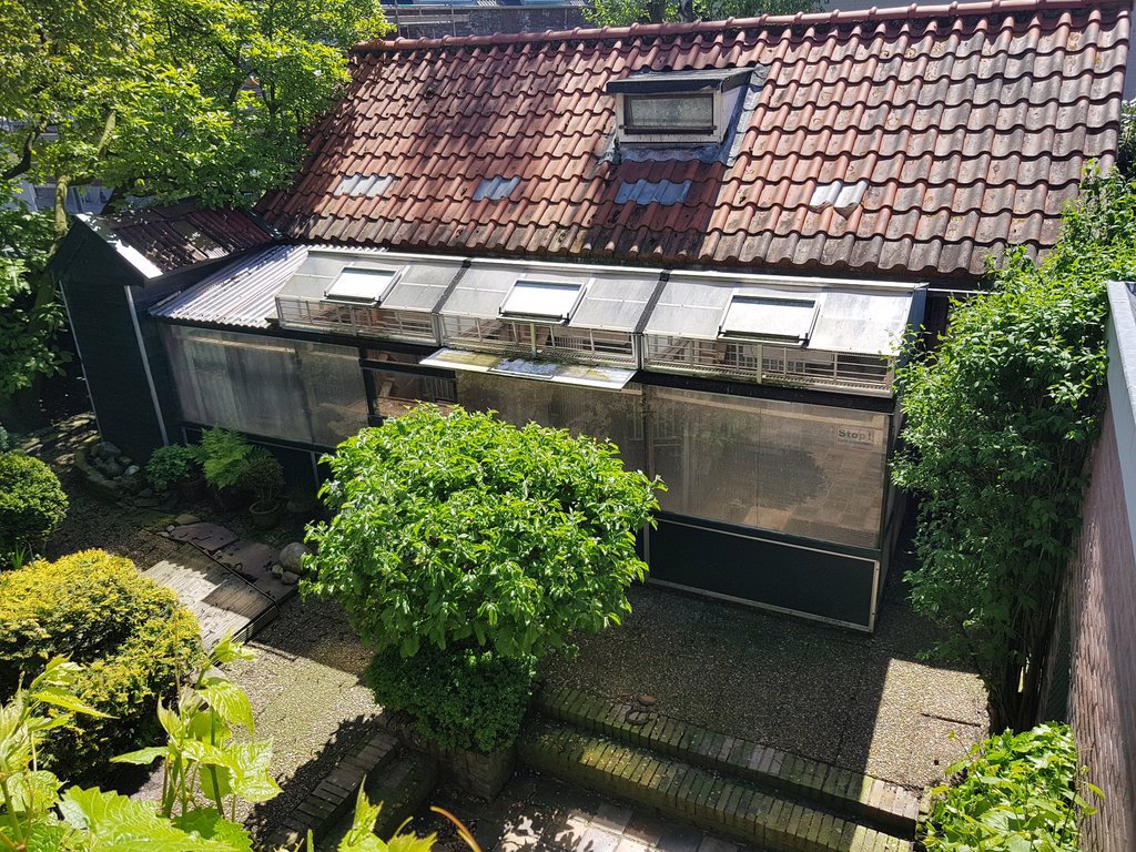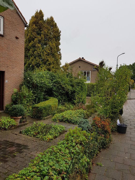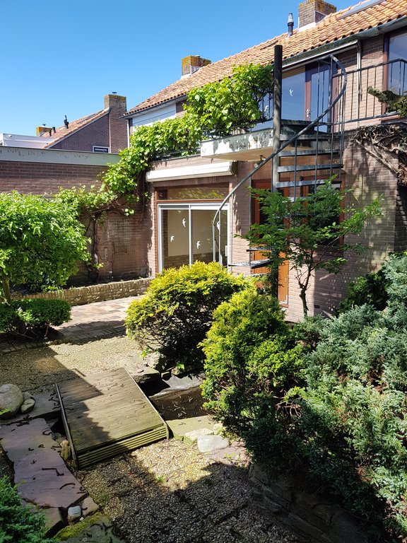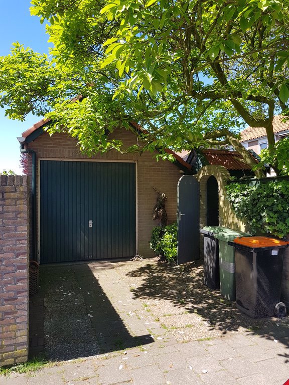 De ruime tuin is gelegen op het zuiden met garage en een aangebouwde stenen schuur. Eén parkeerplek op eigen grond.