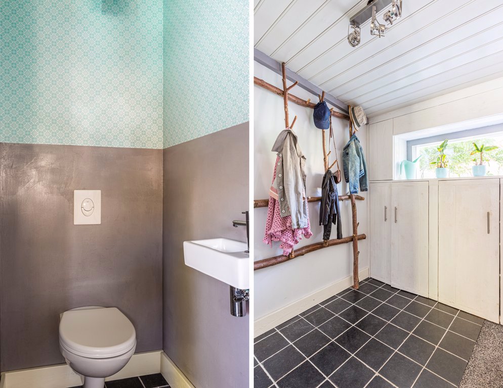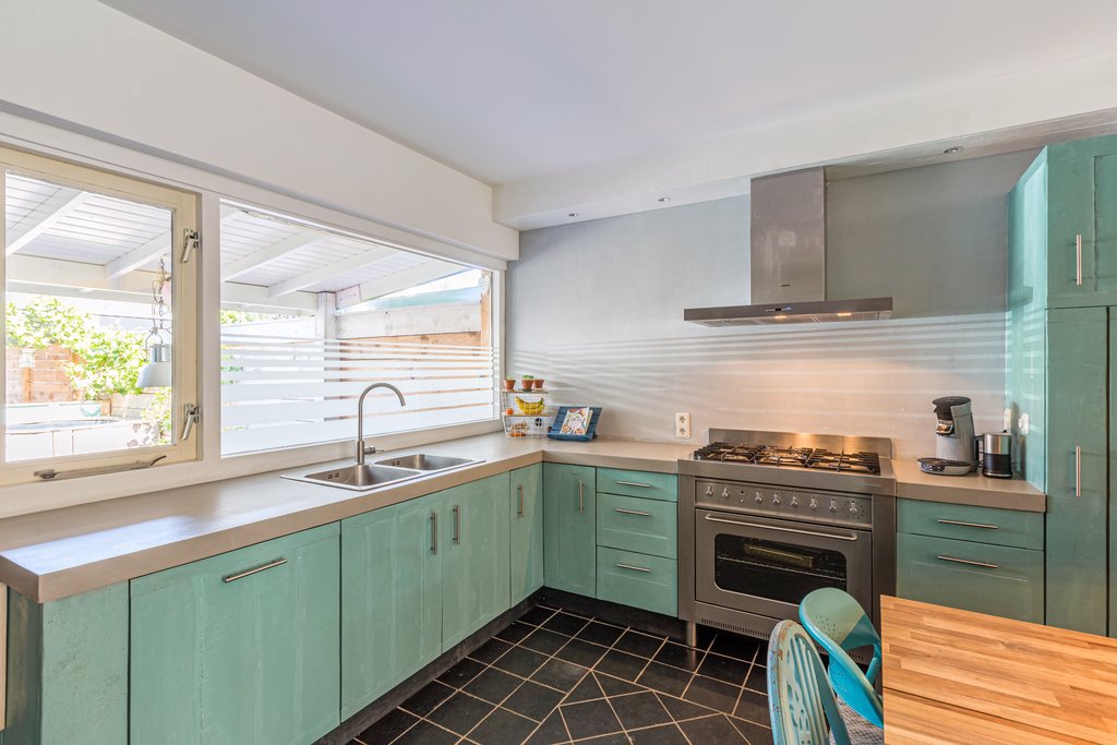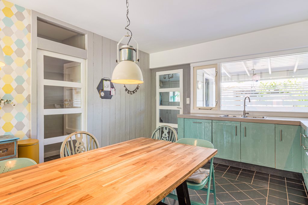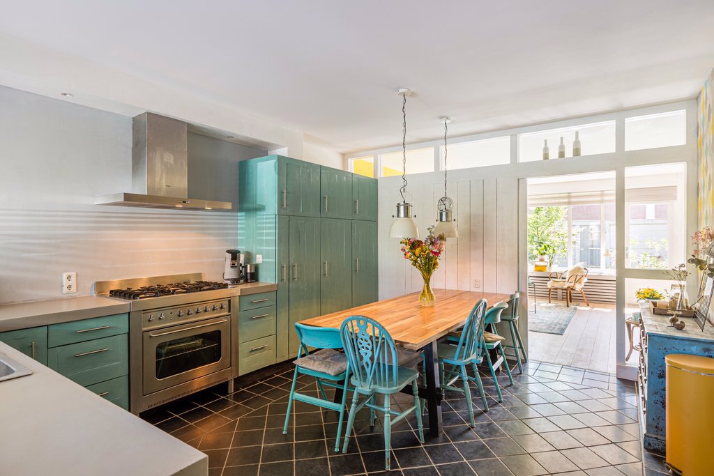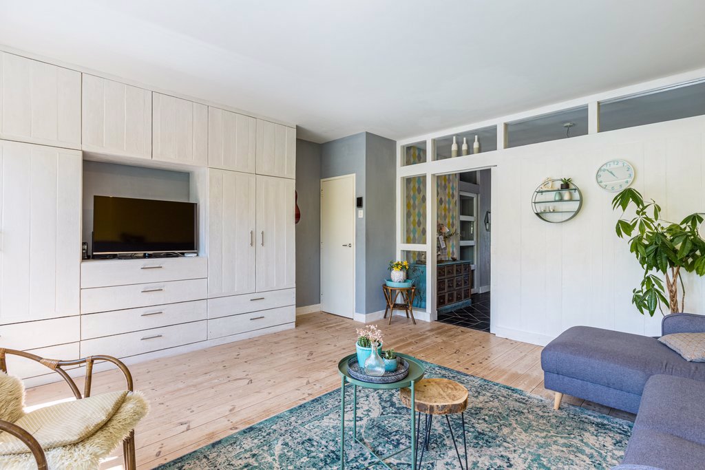 Dit is nog eens een woonkeuken! Wat een heerlijke ruimte is er gecreëerd door de woning aan de voorzijde uit te bouwen. De natuurstenen vloer met vloerverwarming, de houten deurtjes en het aanrechtblad met betonnen afwerking geven je gelijk een warm welkom! De keuken beschikt over een 5-pits gasfornuis met oven, afzuigkap, koelkast met vriesvak en een afwasmachine. Via een schuifdeur komen we in de lichte woonkamer met houten vloer en een grote op maat gemaakte wandkast.