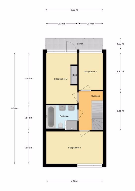 Op de eerste verdieping zijn 3 ruime slaapkamers met aan de achterzijde een balkon. De nette badkamer is tot bovenaan betegeld en voorzien van een bad, douche, toilet en een meubel met dubbele wastafel.