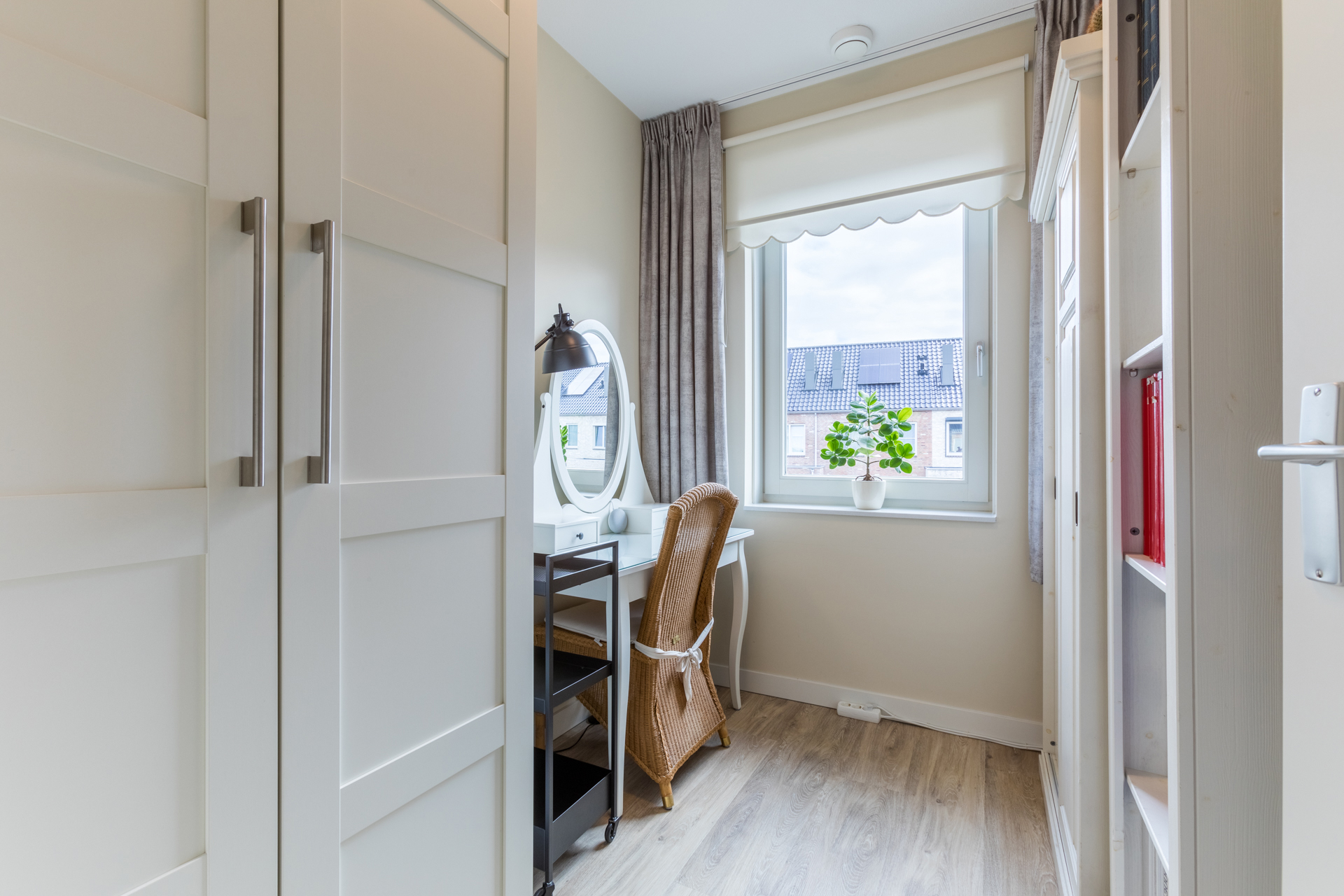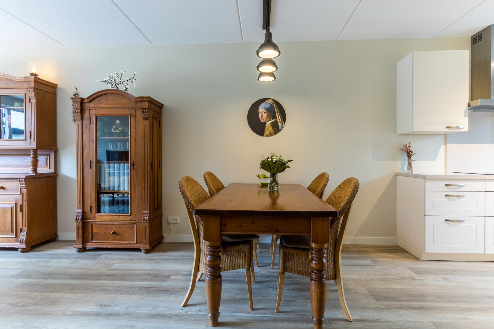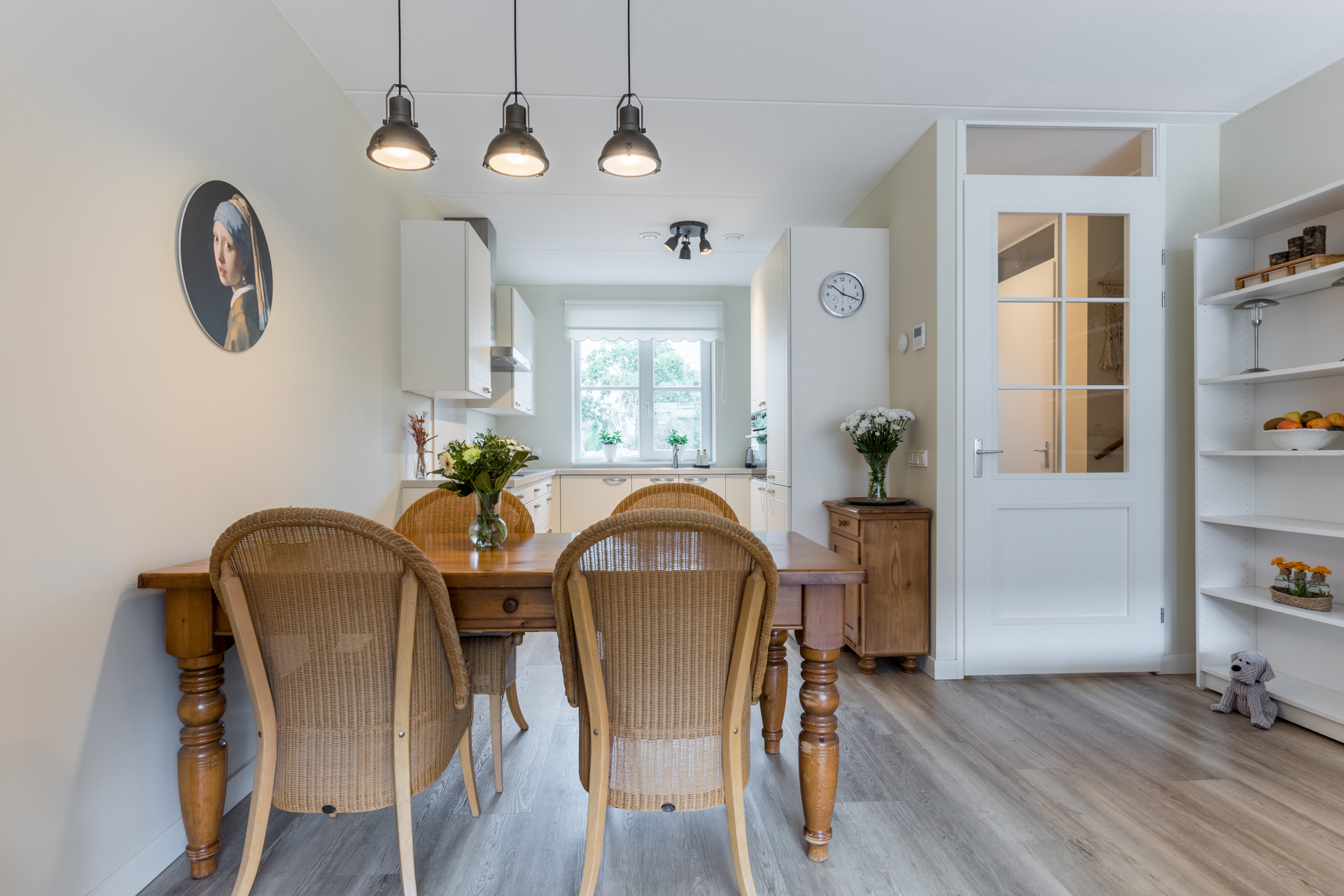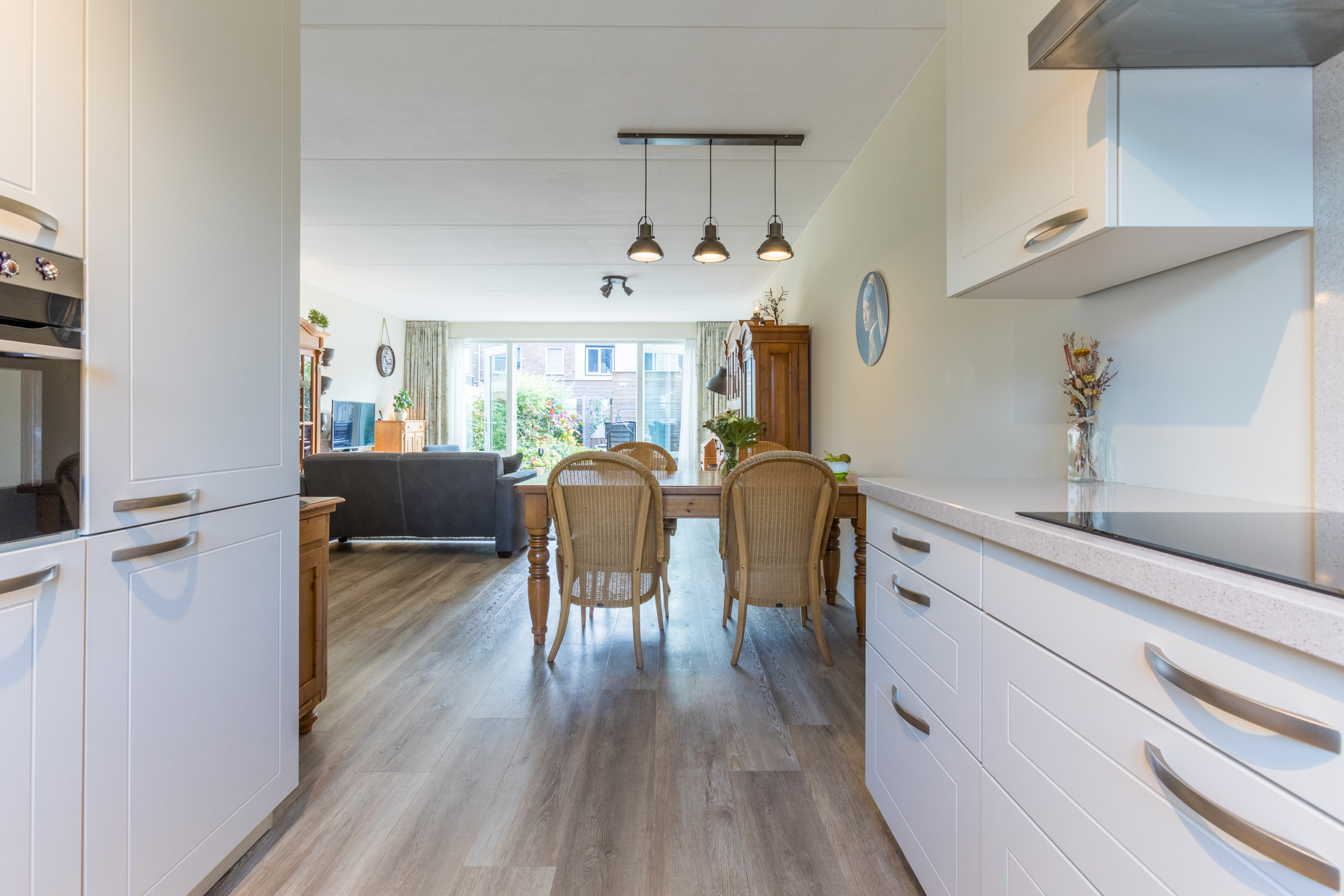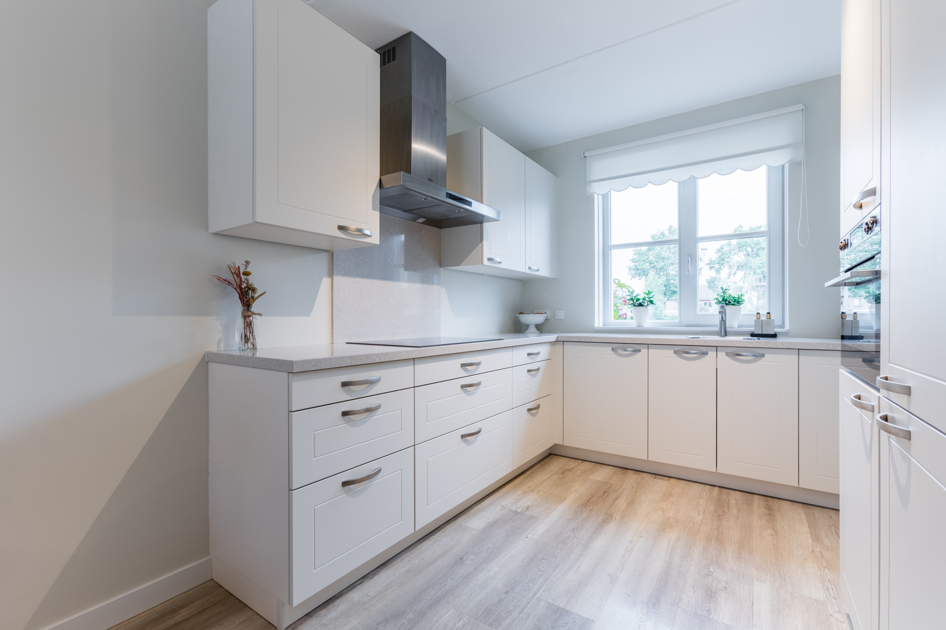 Vanuit de keuken, gelegen aan de voorkant van de woning, heb je een mooi vrij uitzicht. Het composieten werkblad is in dezelfde lichte kleurstelling als de fronten. Dit zorgt voor een rustig en ruim geheel. Met een inductiekookplaat, RVS afzuigkap, vaatwasser, koelkast met vriesvak en een combi-oven is deze keuken van alle gemakken voorzien.