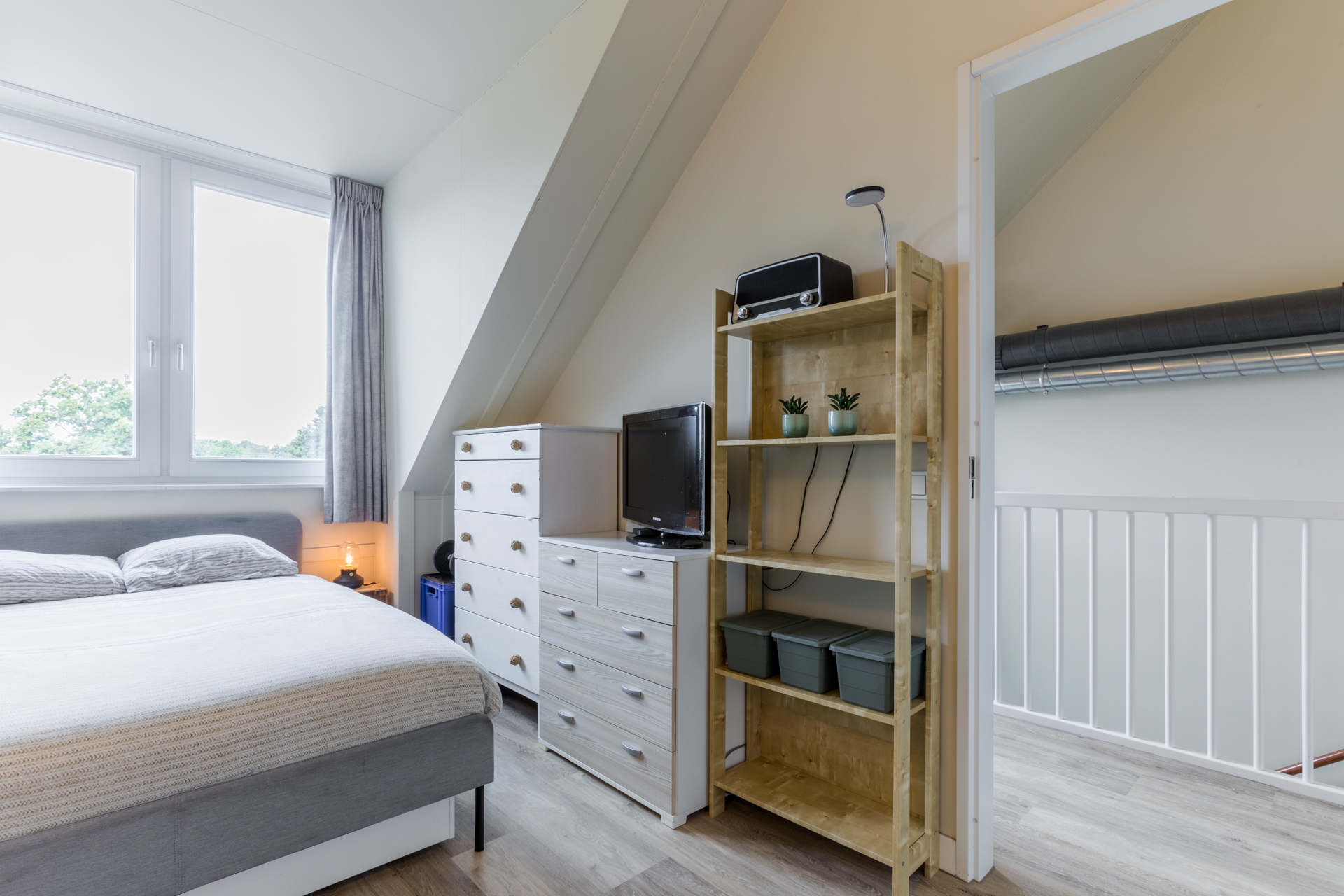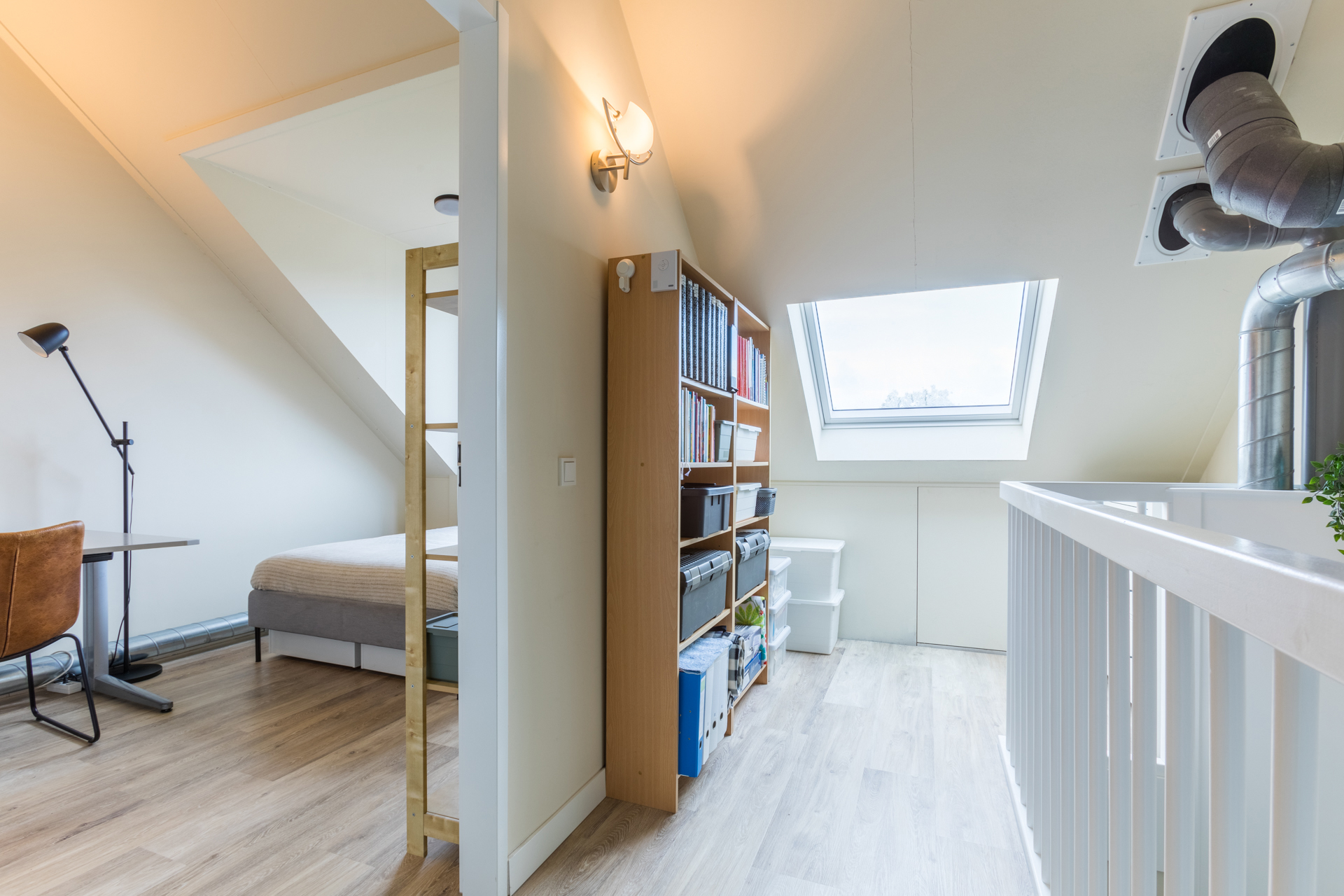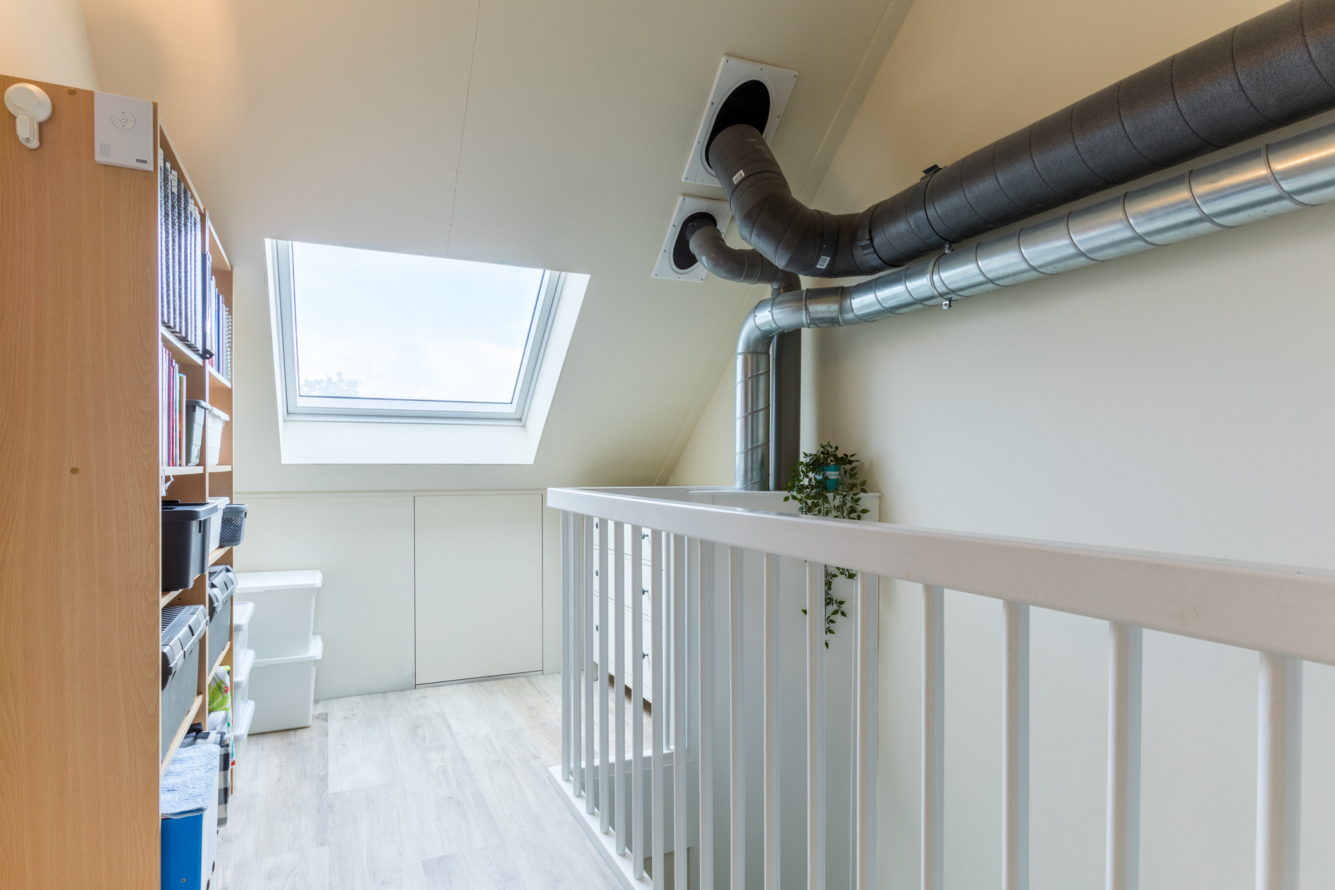 De 2e verdieping heeft een voorzolder met een dakraam. Er is een ruime vierde slaapkamer gerealiseerd met een grote dakkapel. Daarnaast bevindt zich op deze verdieping een aparte technische ruimte waar de warmtepomp, WTW-installatie, wasmachine en wasdroger opgesteld zijn. Extra bergruimte is achter de knieschotten te vinden.