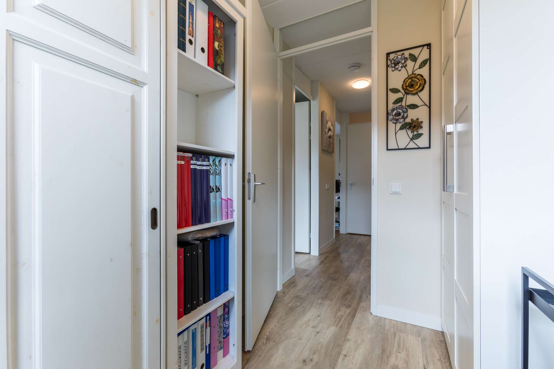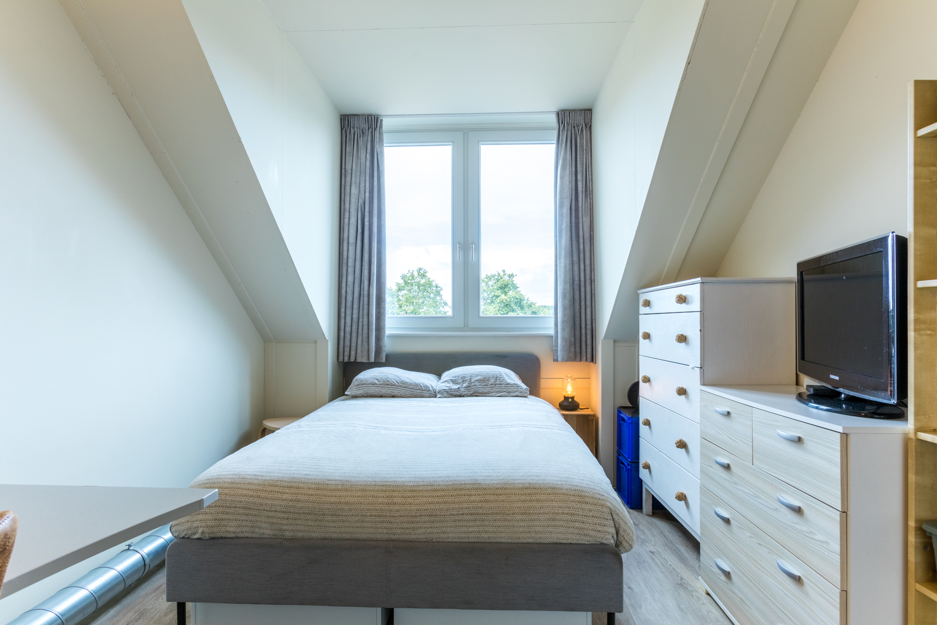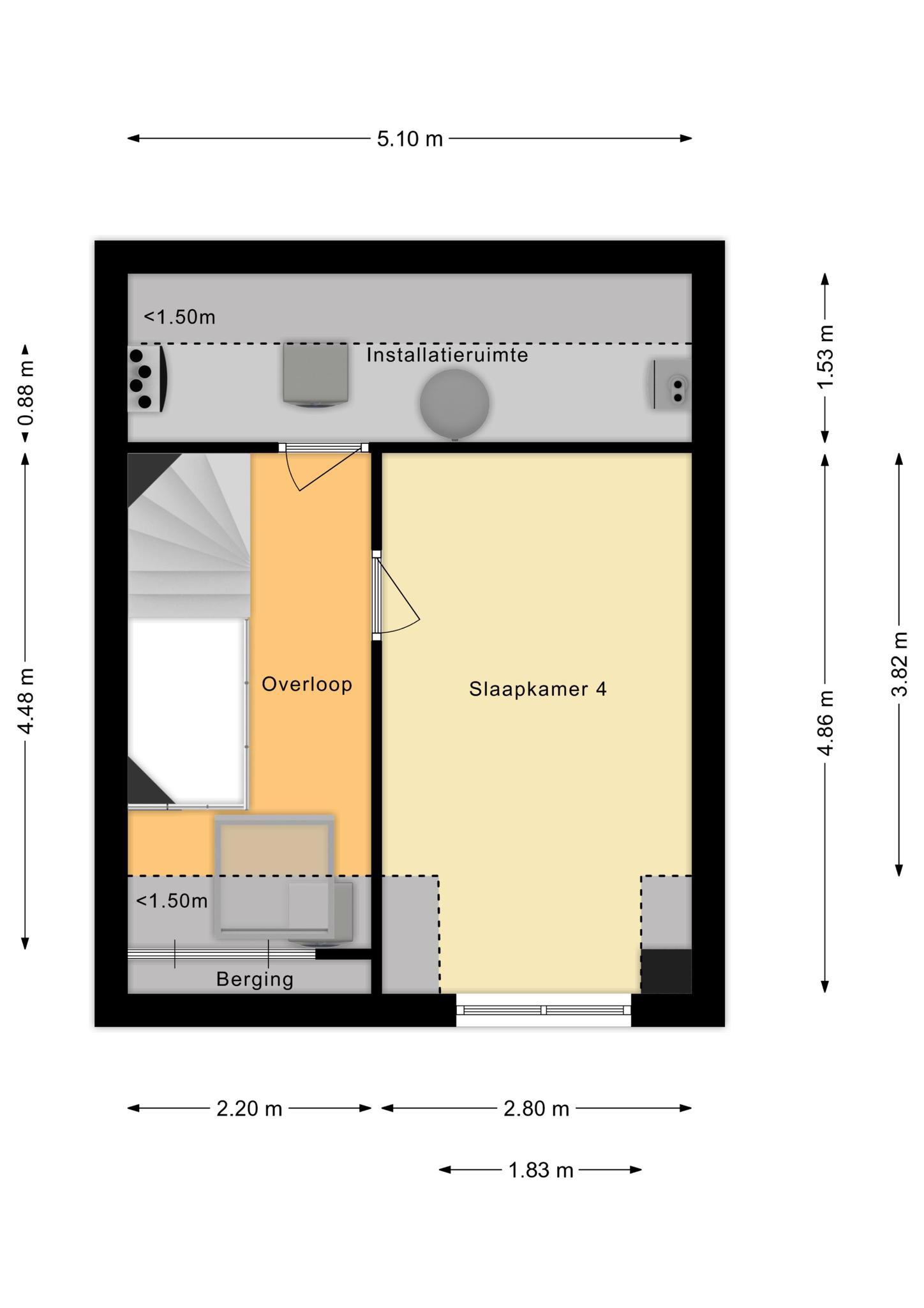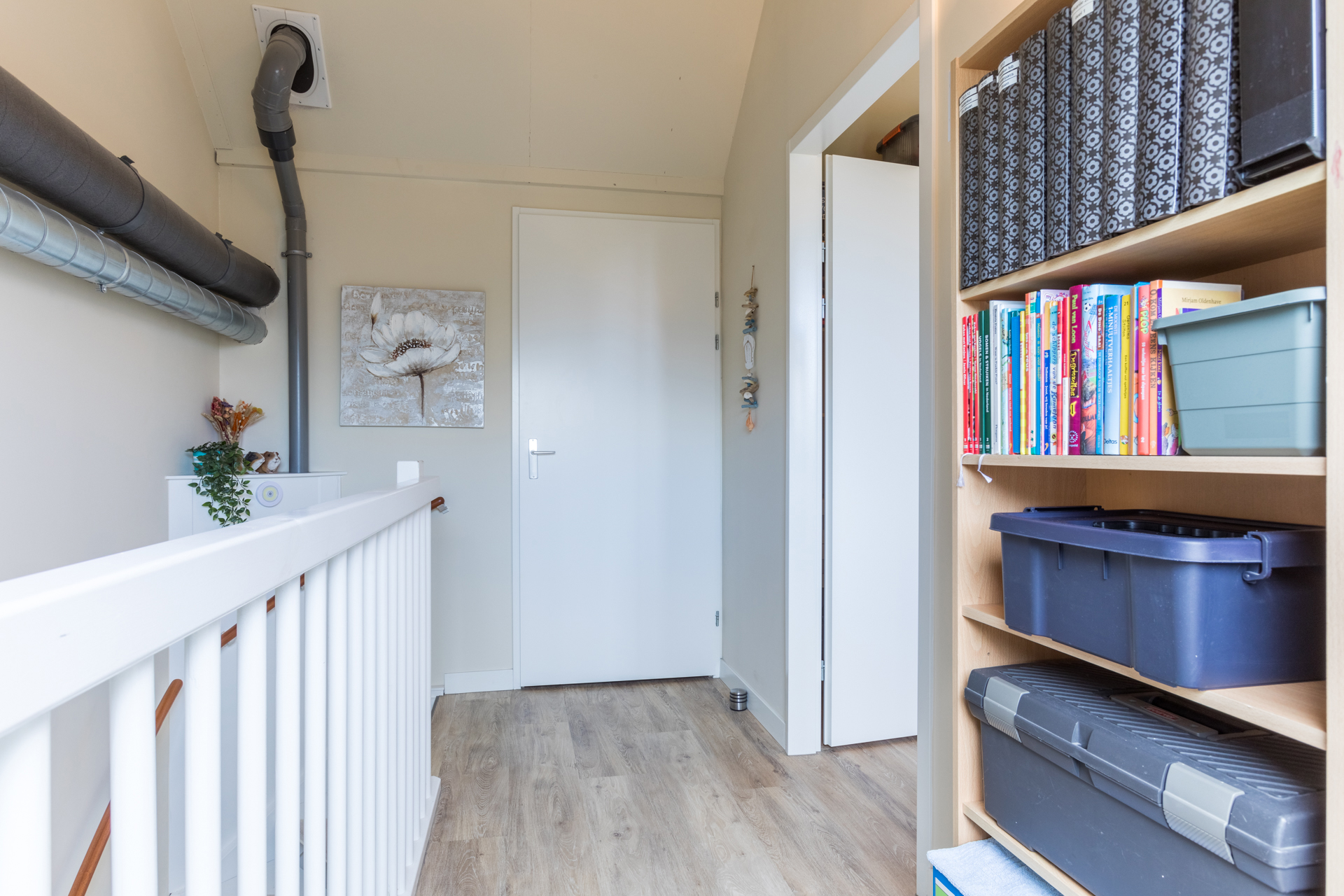 De 2e verdieping heeft een voorzolder met een dakraam. Er is een ruime vierde slaapkamer gerealiseerd met een grote dakkapel. Daarnaast bevindt zich op deze verdieping een aparte technische ruimte waar de warmtepomp, WTW-installatie, wasmachine en wasdroger opgesteld zijn. Extra bergruimte is achter de knieschotten te vinden.