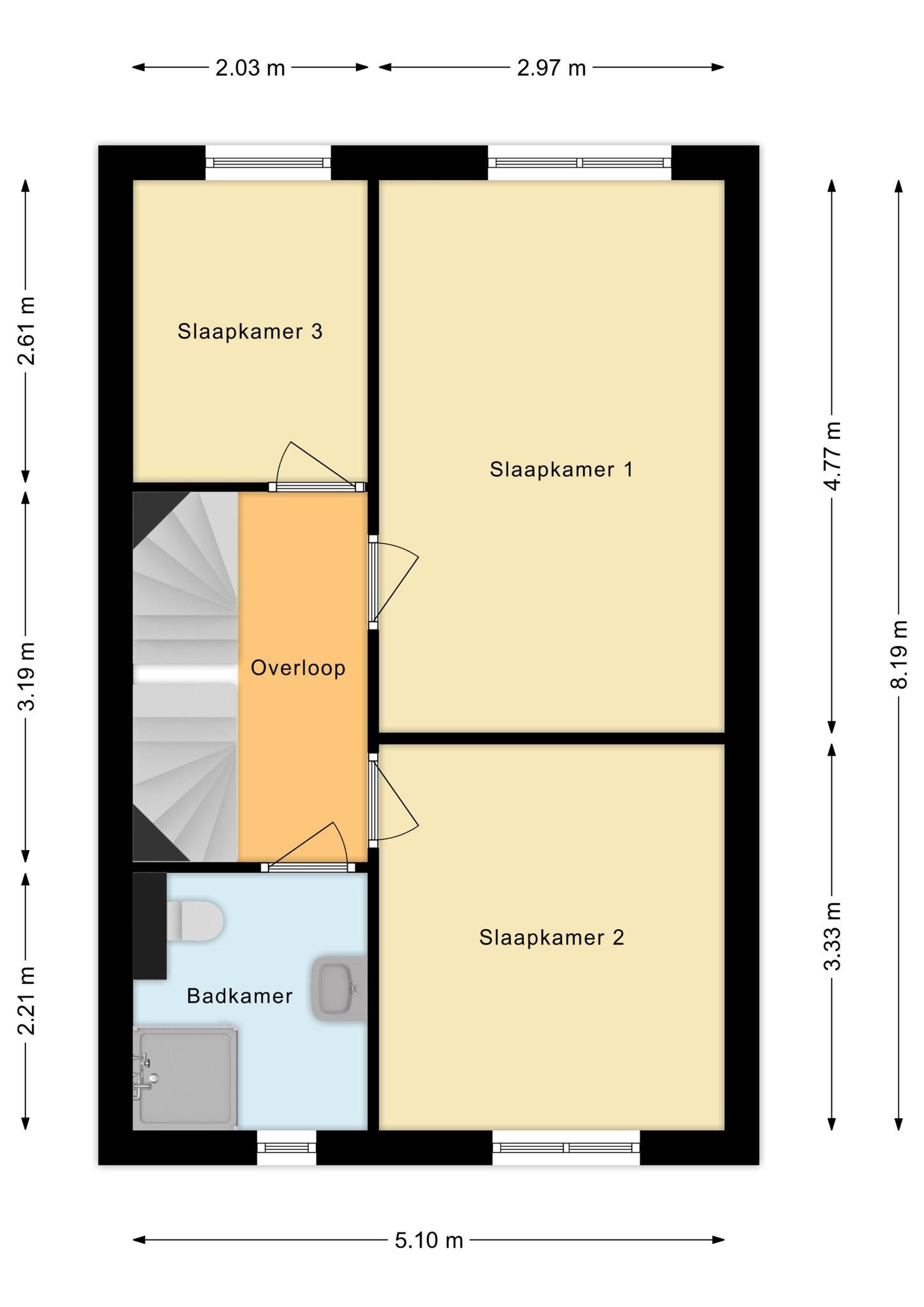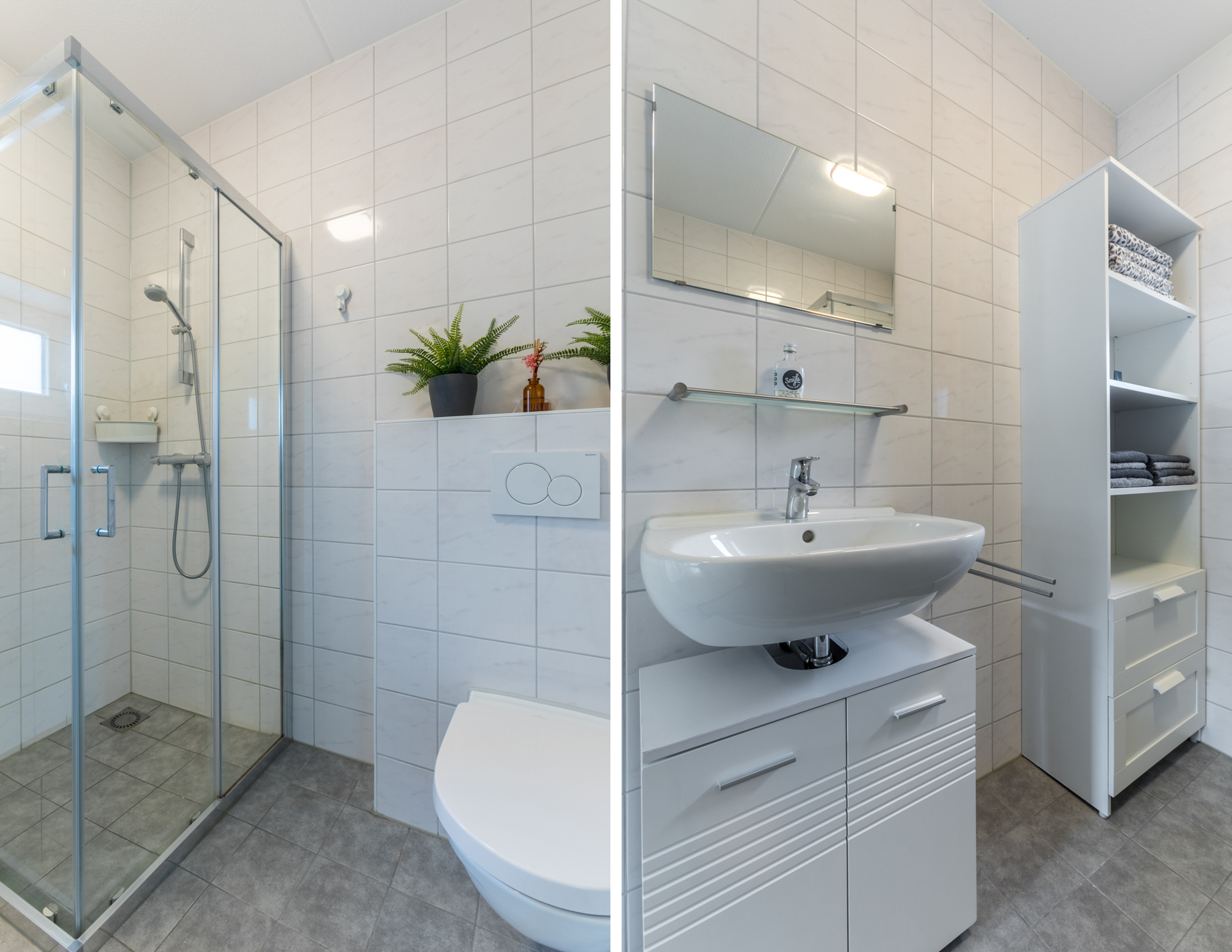 Op de 1e verdieping zijn 3 royale slaapkamers en de badkamer te vinden. De badkamer met toilet, douche en wastafel is tot bovenaan betegeld. Je hebt hier geen last van koude voeten, want ook hier is vloerverwarming aanwezig.