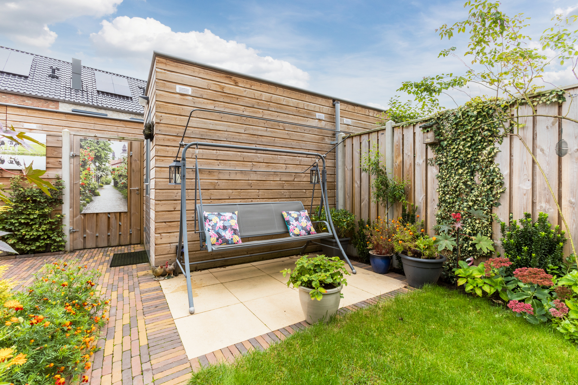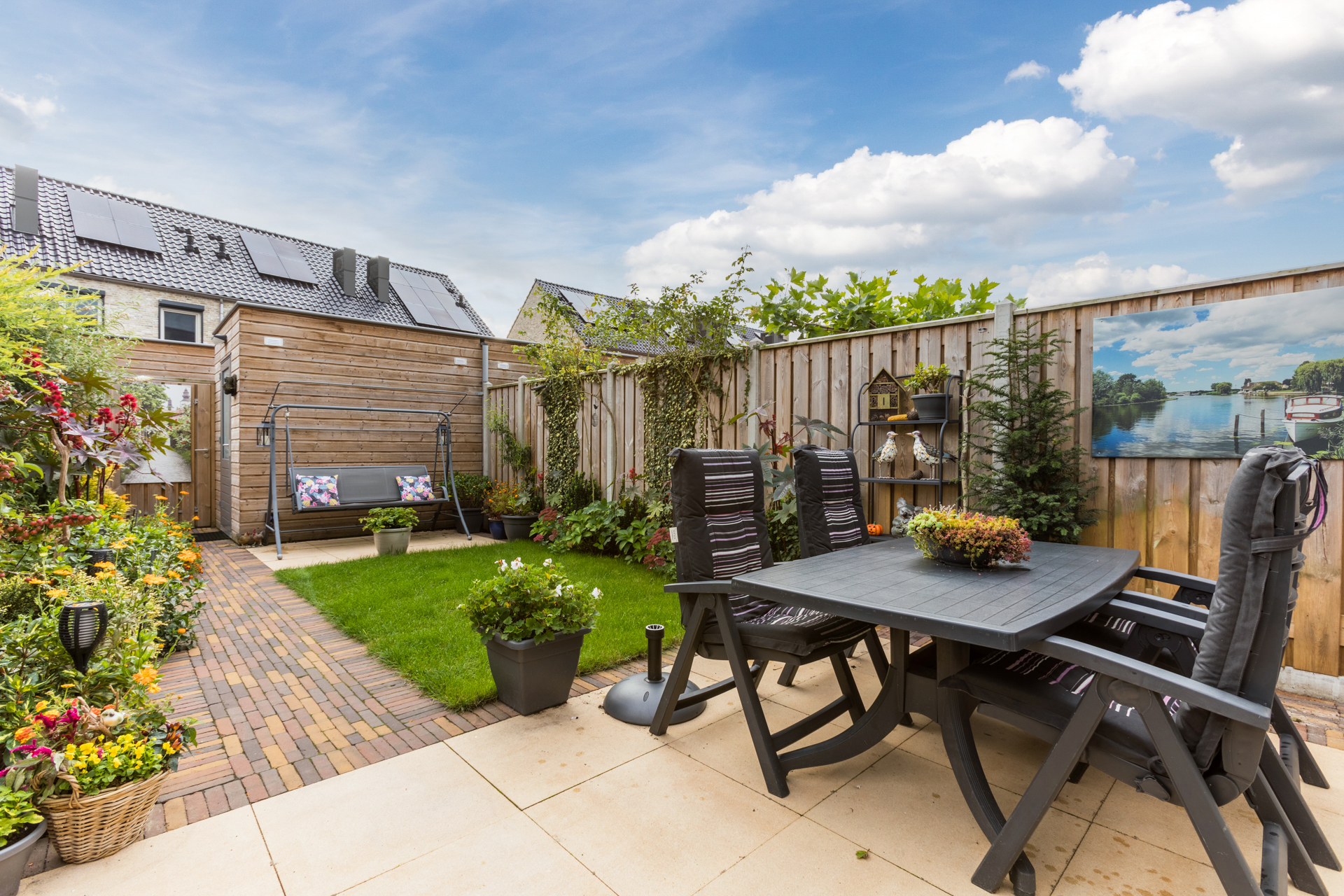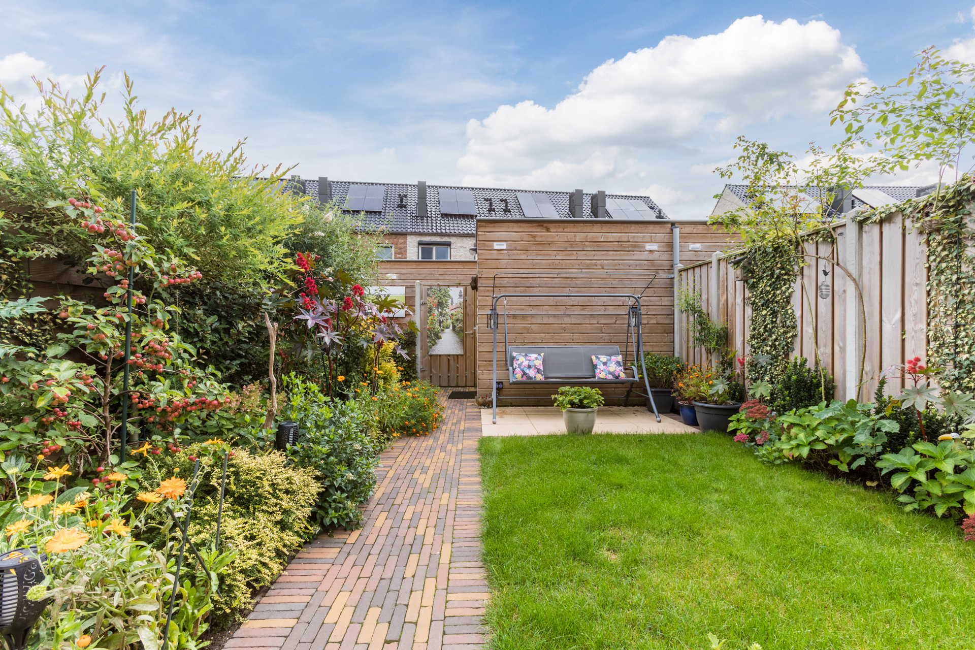 De achtertuin ligt op het oosten en is verzorgd aangelegd met beplanting, een gazon, twee terrassen en een houten berging.
