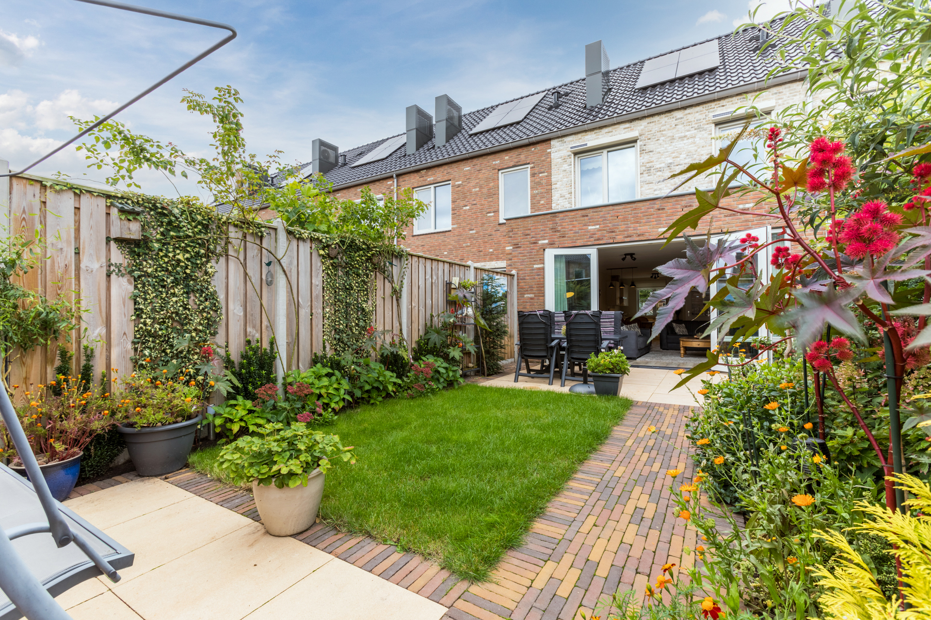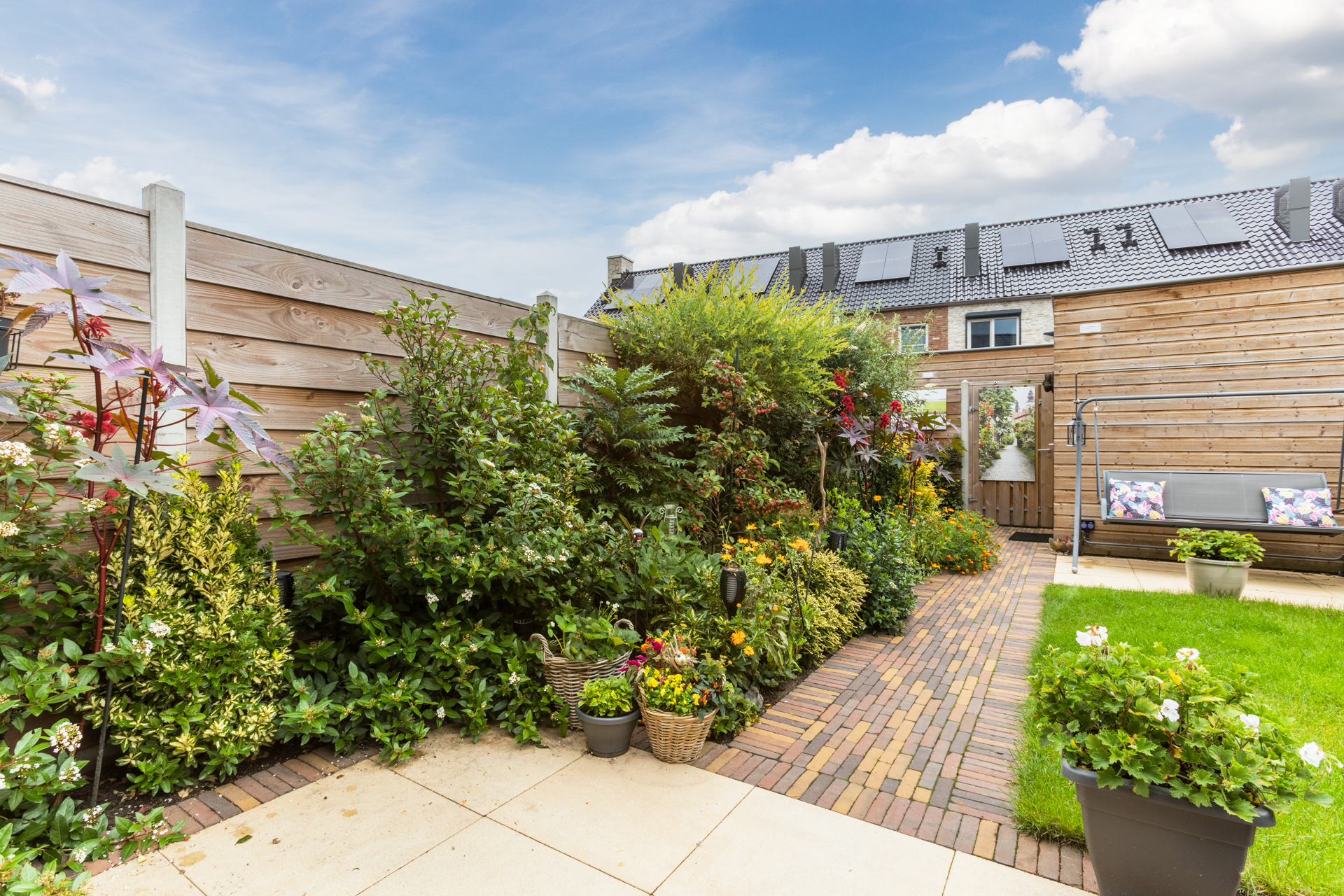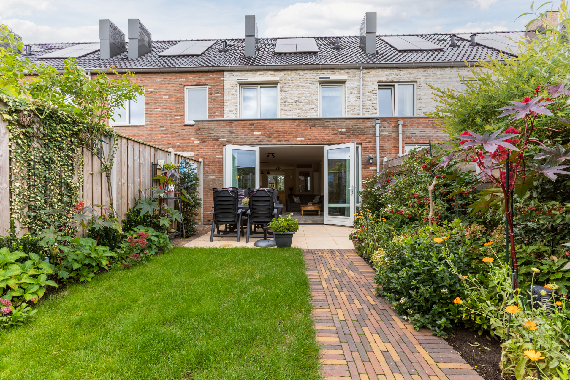 De achtertuin ligt op het oosten en is verzorgd aangelegd met beplanting, een gazon, twee terrassen en een houten berging.