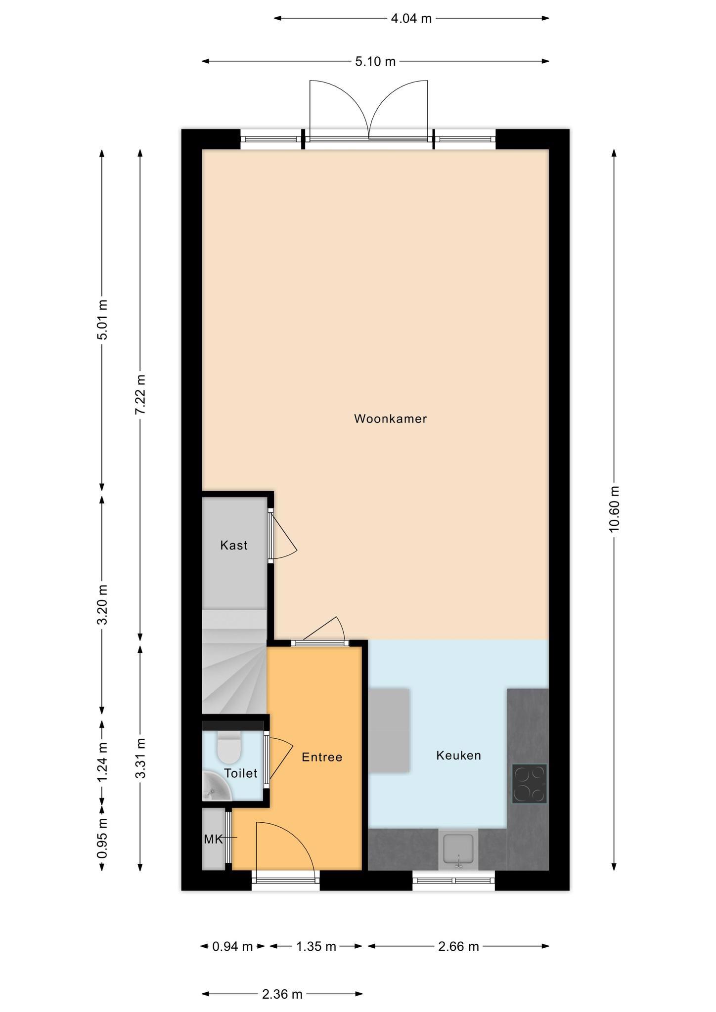 Door de uitbouw aan de achterzijde is een ruime woonkamer ontstaan. Er komt veel licht binnen door de grote ramen en de openslaande deuren naar de tuin. Onder de trap zit een praktische provisiekast.