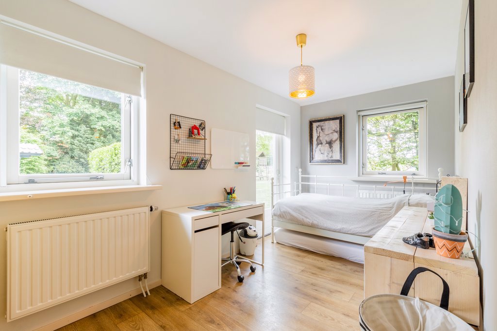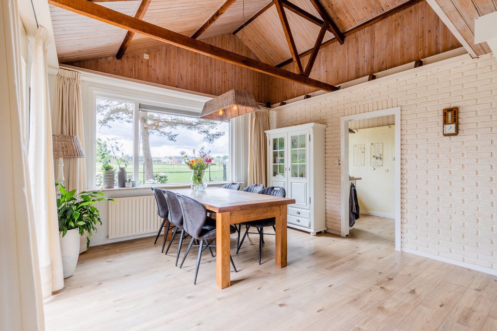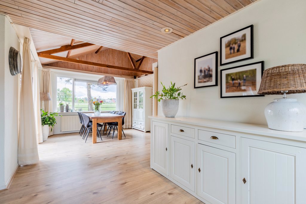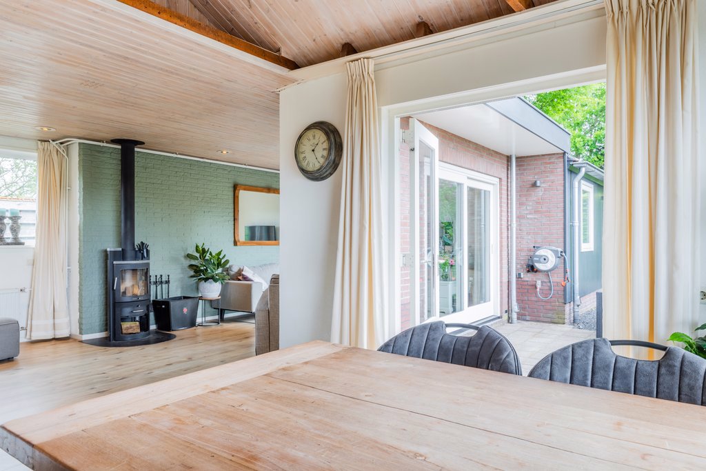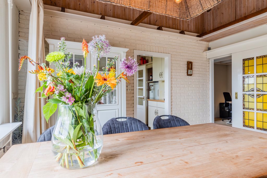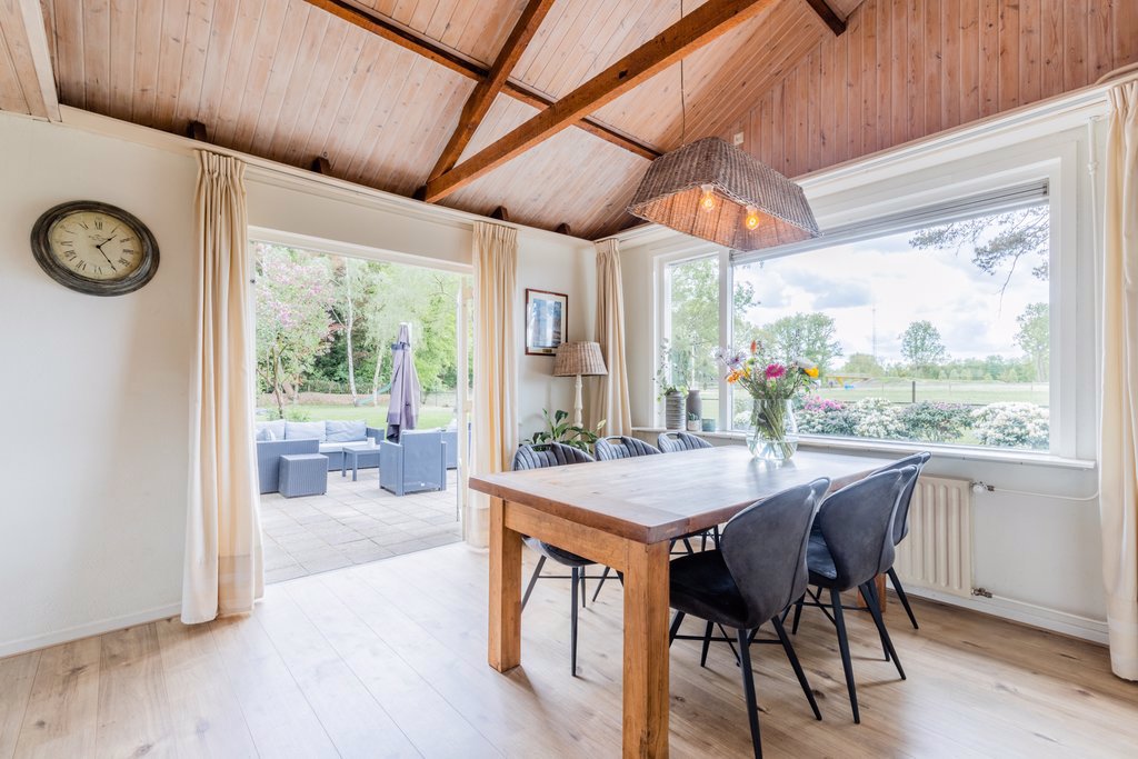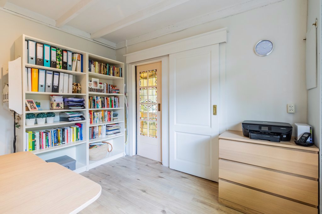 Wat een verrassing als je bij deze woning arriveert. De grote groene tuin ademt rust en ruimte uit. Als we het charmante huis binnengaan, komen we eerst in de hal, met toilet en vaste kast. We lopen door naar de keuken met vaatwasser, 4-pits gastoestel, oven, koelkast en magnetron. In het eetgedeelte heb je een mooi zicht op de fraaie tuin en daarachter de paarden die in de wei lopen. Er komt veel licht binnen in het eetgedeelte door het grote raam en door de openslaande deuren. Een glas-in-lood schuifdeur geeft toegang tot de ruimte die nu is ingericht als kantoor. Dit deel kan ook goed gebruikt worden als speel- of hobbykamer of als 5e slaapkamer. Hierboven zit een zolder voor extra bergruimte.