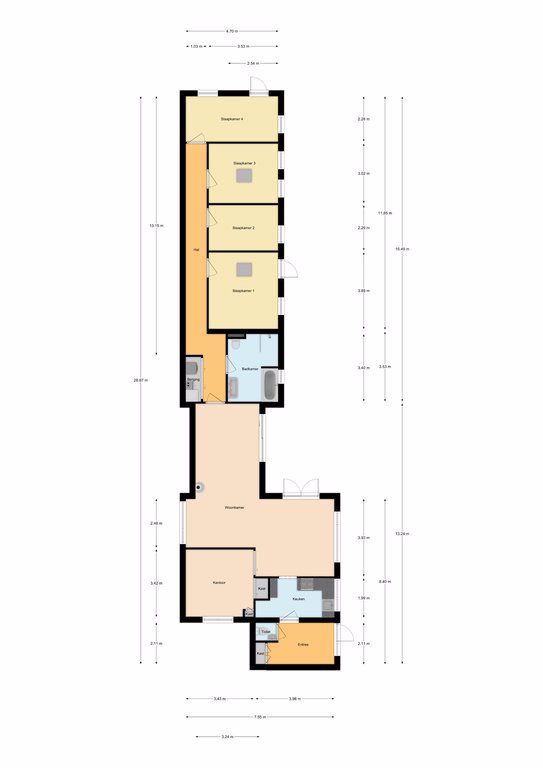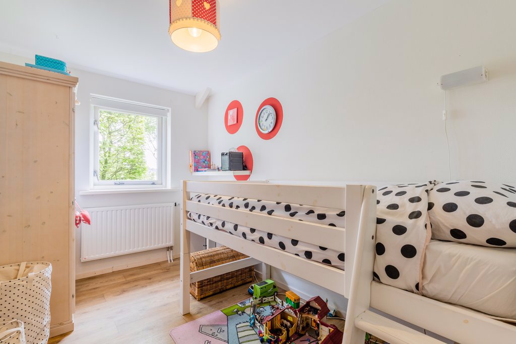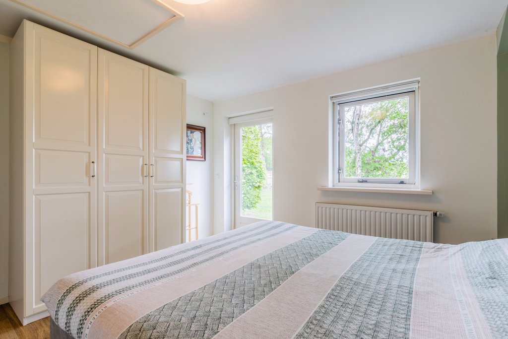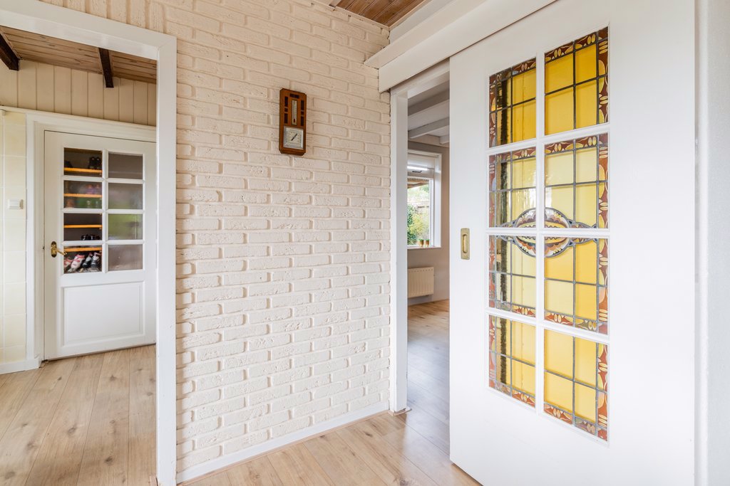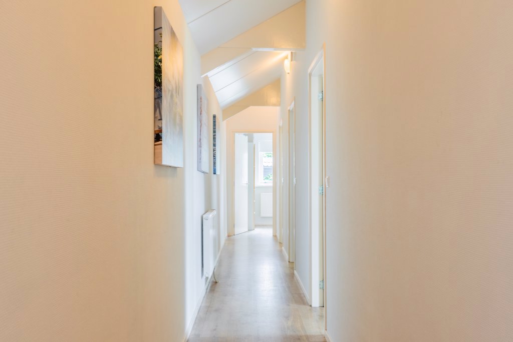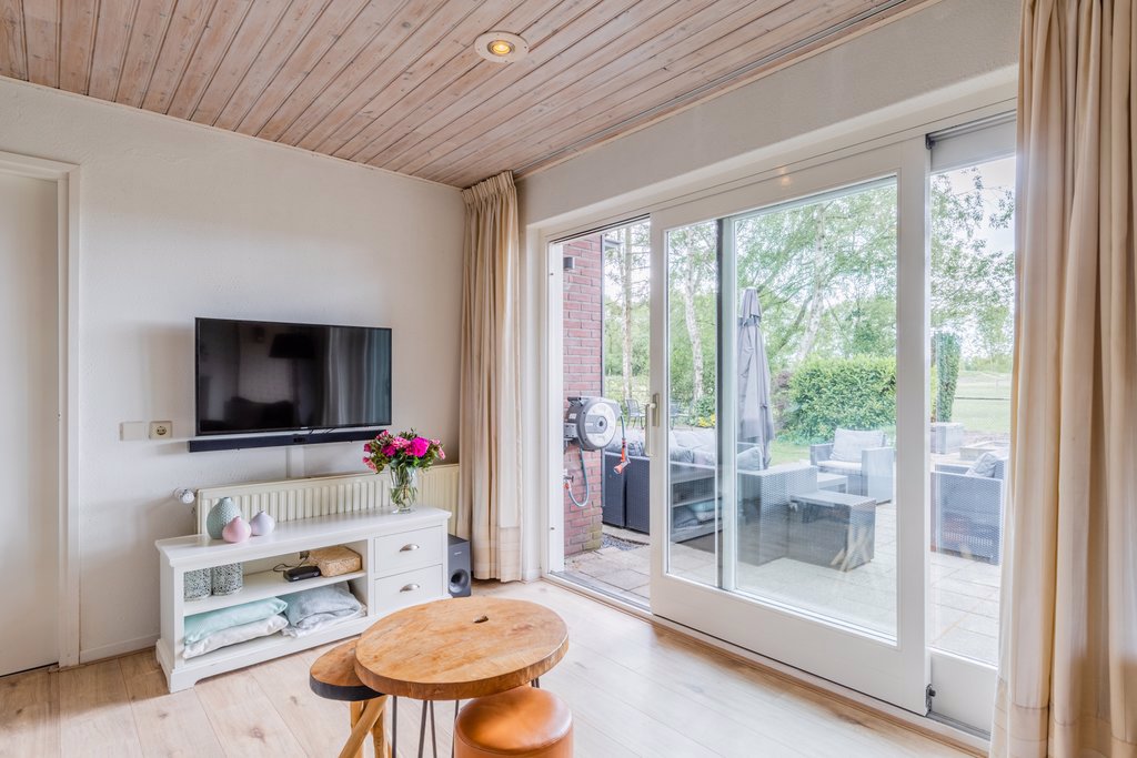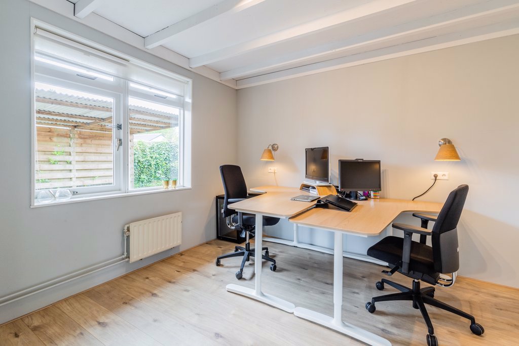 Wat een verrassing als je bij deze woning arriveert. De grote groene tuin ademt rust en ruimte uit. Als we het charmante huis binnengaan, komen we eerst in de hal, met toilet en vaste kast. We lopen door naar de keuken met vaatwasser, 4-pits gastoestel, oven, koelkast en magnetron. In het eetgedeelte heb je een mooi zicht op de fraaie tuin en daarachter de paarden die in de wei lopen. Er komt veel licht binnen in het eetgedeelte door het grote raam en door de openslaande deuren. Een glas-in-lood schuifdeur geeft toegang tot de ruimte die nu is ingericht als kantoor. Dit deel kan ook goed gebruikt worden als speel- of hobbykamer of als 5e slaapkamer. Hierboven zit een zolder voor extra bergruimte.