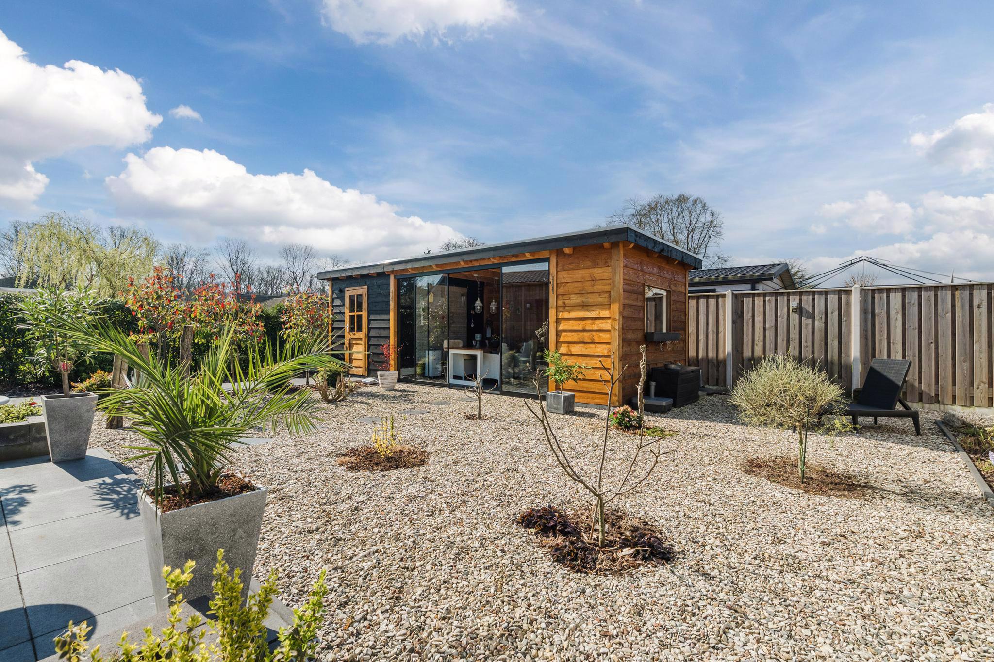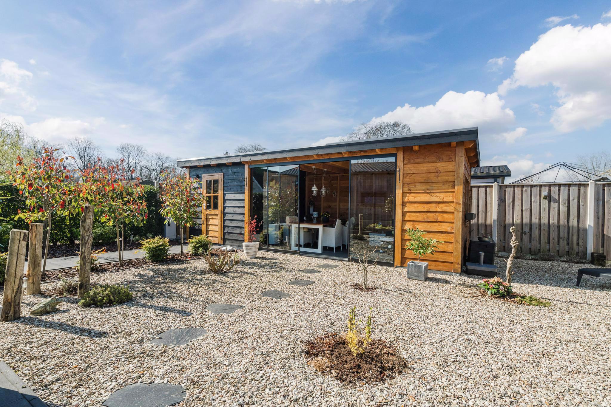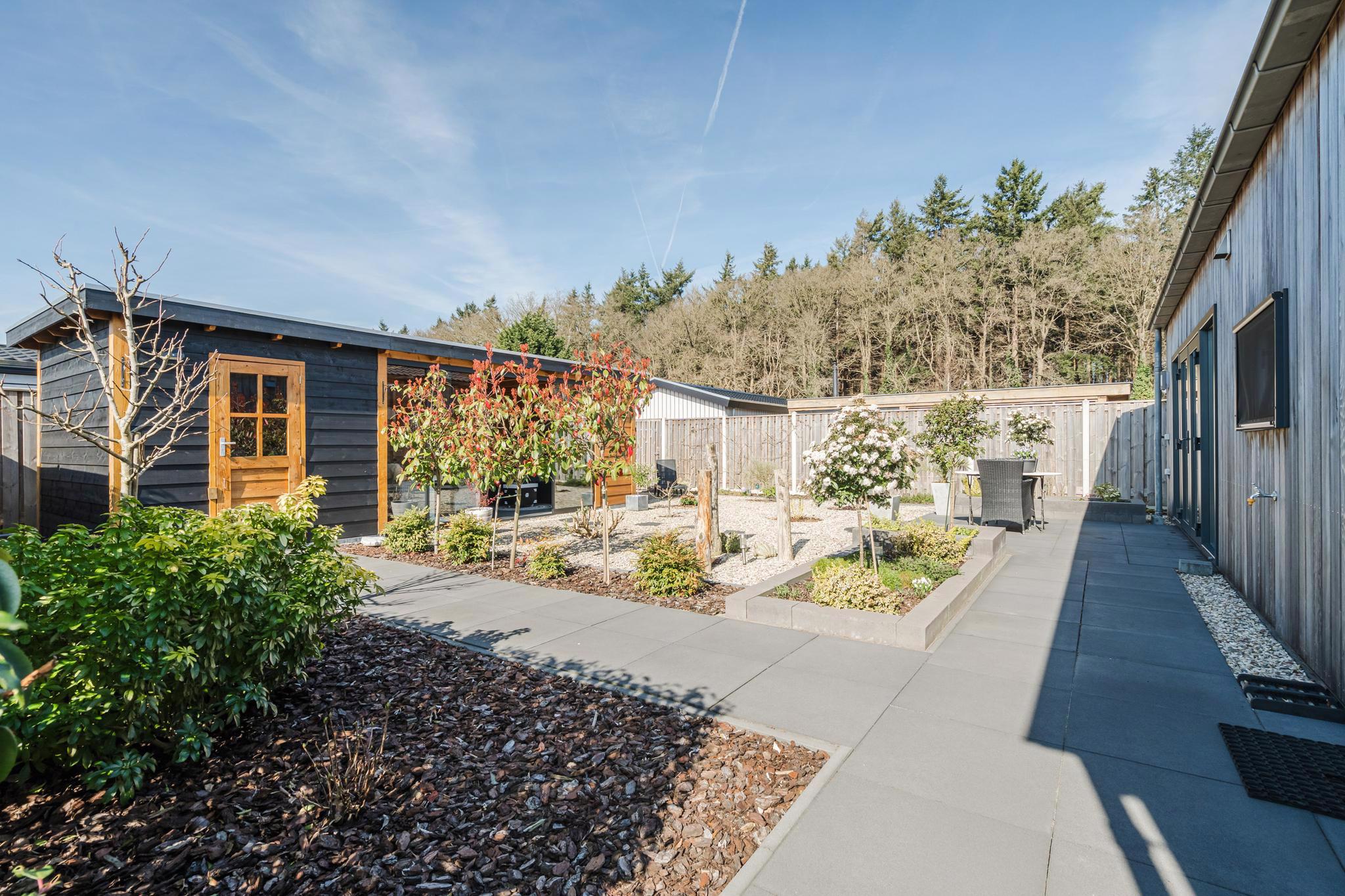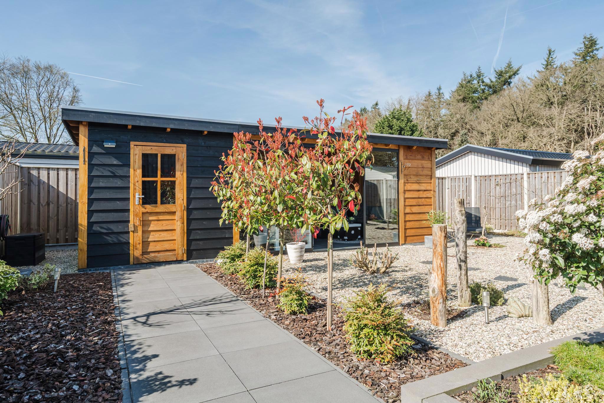 De tuin is onderhoudsvriendelijk aangelegd met fraaie bloeiende borders. In de prachtige tuinkamer met glazen schuifdeuren geniet je het hele jaar door van het buitenleven. De aangrenzende berging heeft geïsoleerde wanden. Ook het dak van de berging en tuinkamer is geïsoleerd. Voor het chalet is een parkeerplaats op eigen grond.