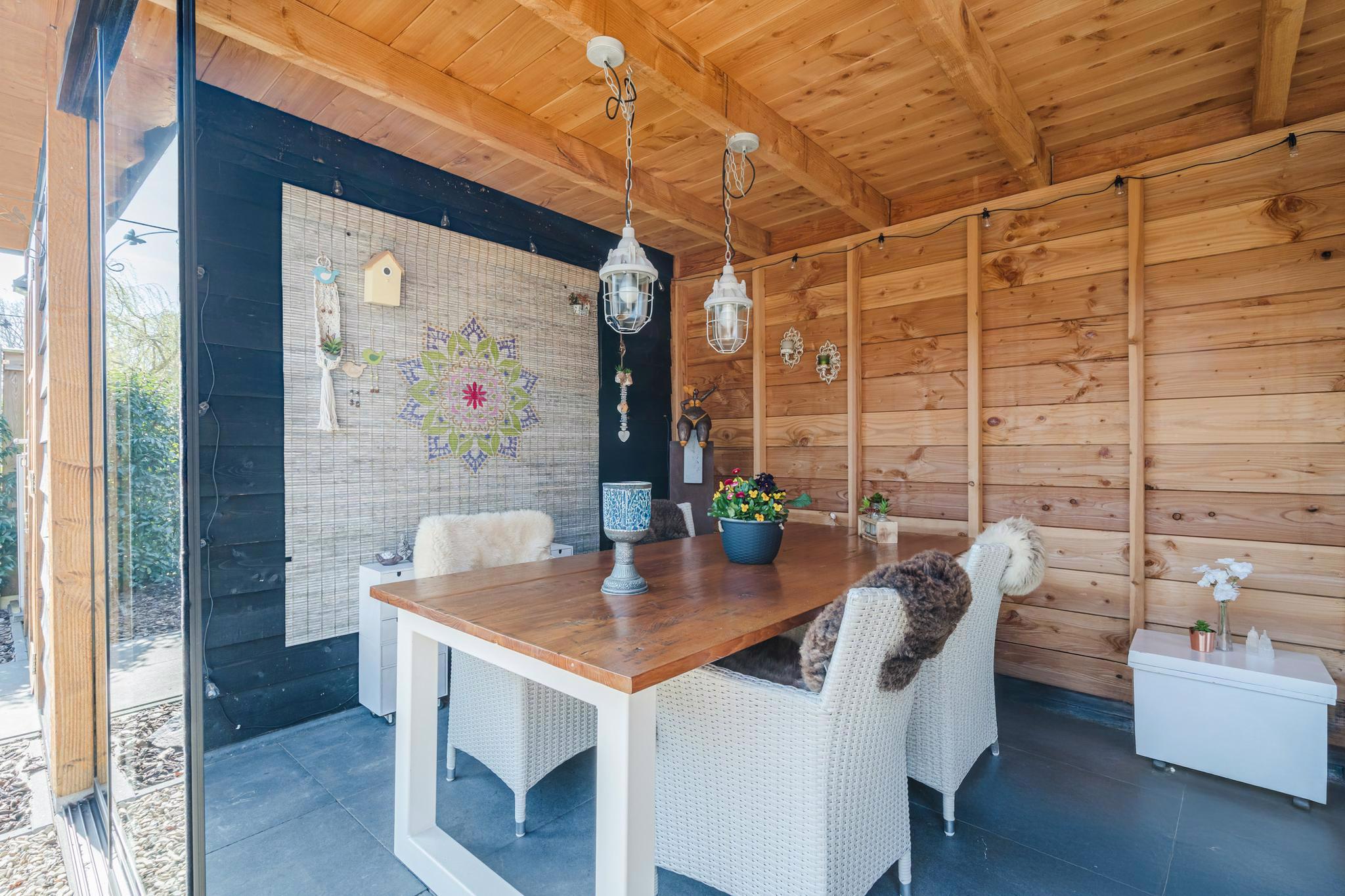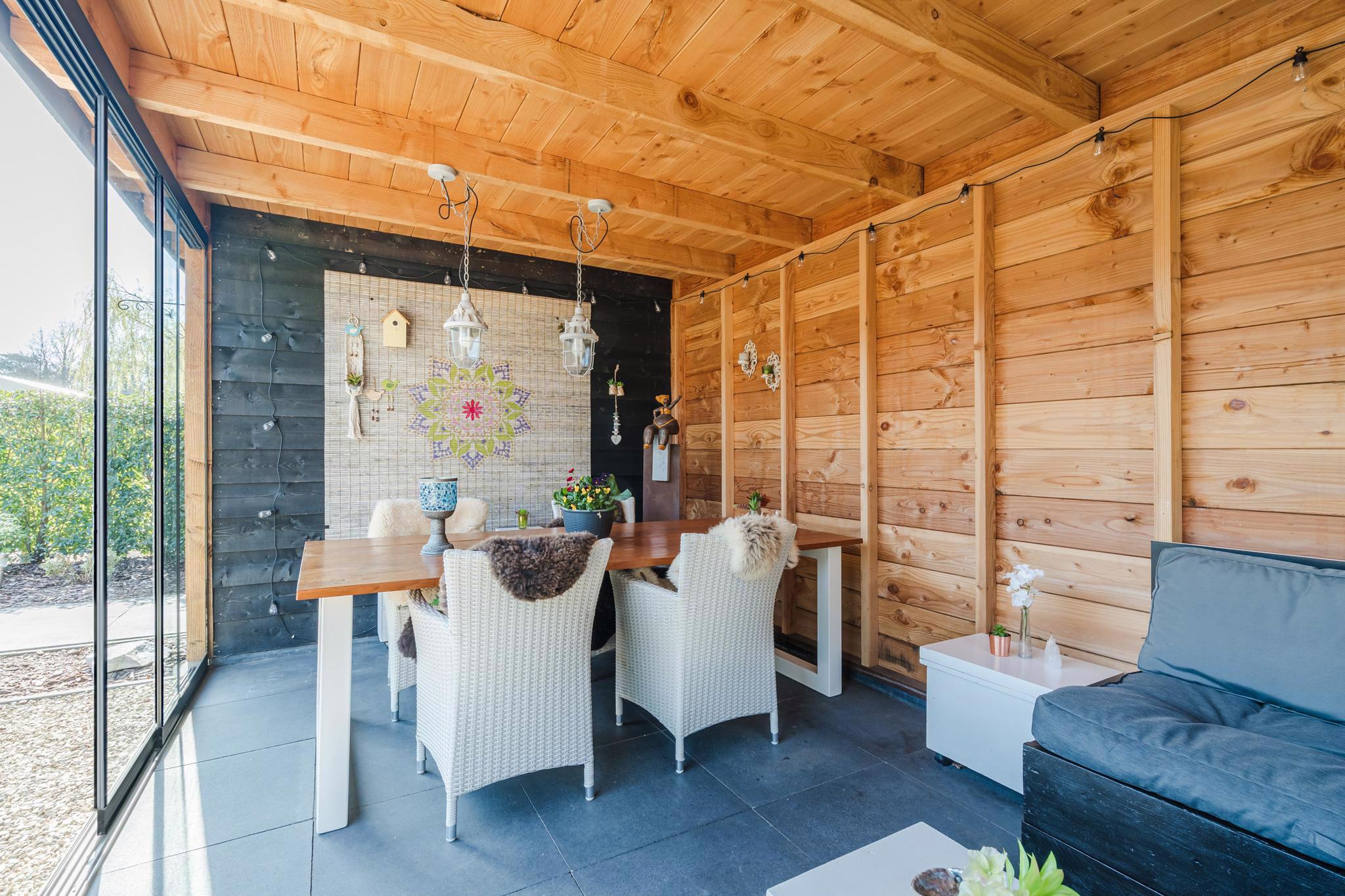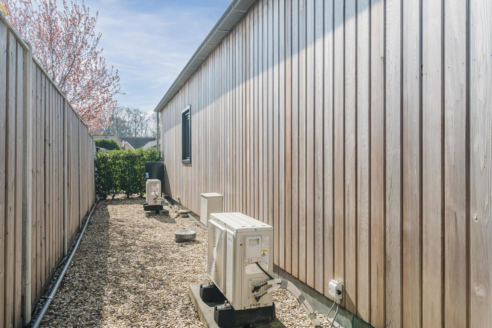 De tuin is onderhoudsvriendelijk aangelegd met fraaie bloeiende borders. In de prachtige tuinkamer met glazen schuifdeuren geniet je het hele jaar door van het buitenleven. De aangrenzende berging heeft geïsoleerde wanden. Ook het dak van de berging en tuinkamer is geïsoleerd. Voor het chalet is een parkeerplaats op eigen grond.