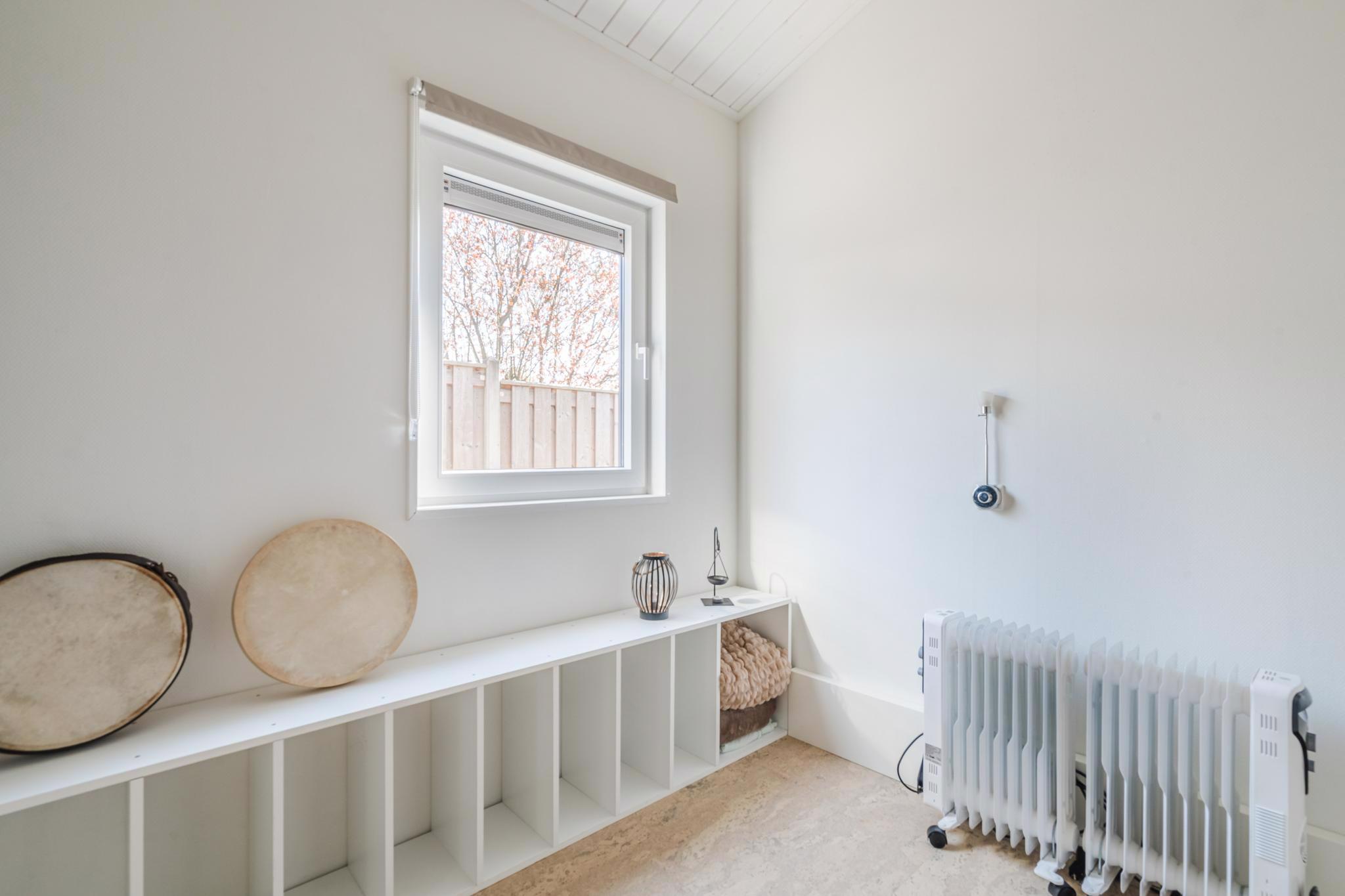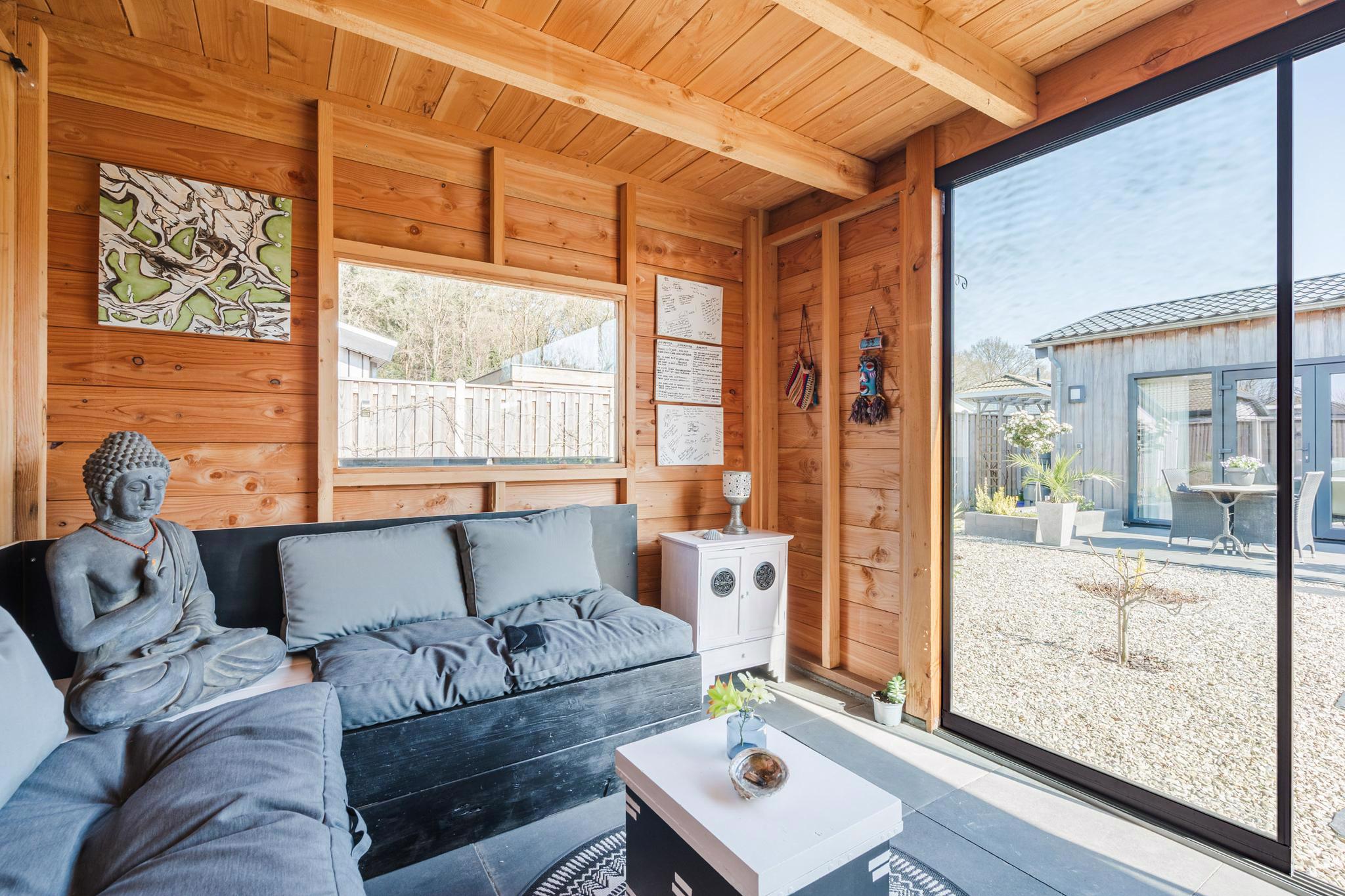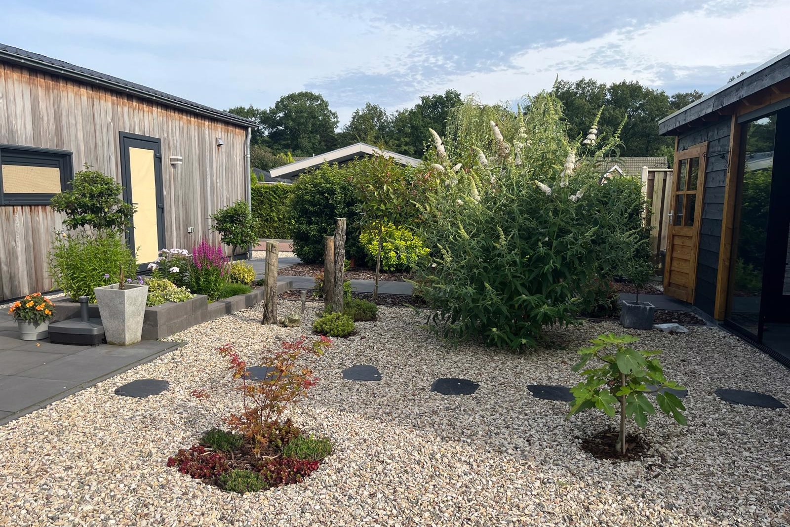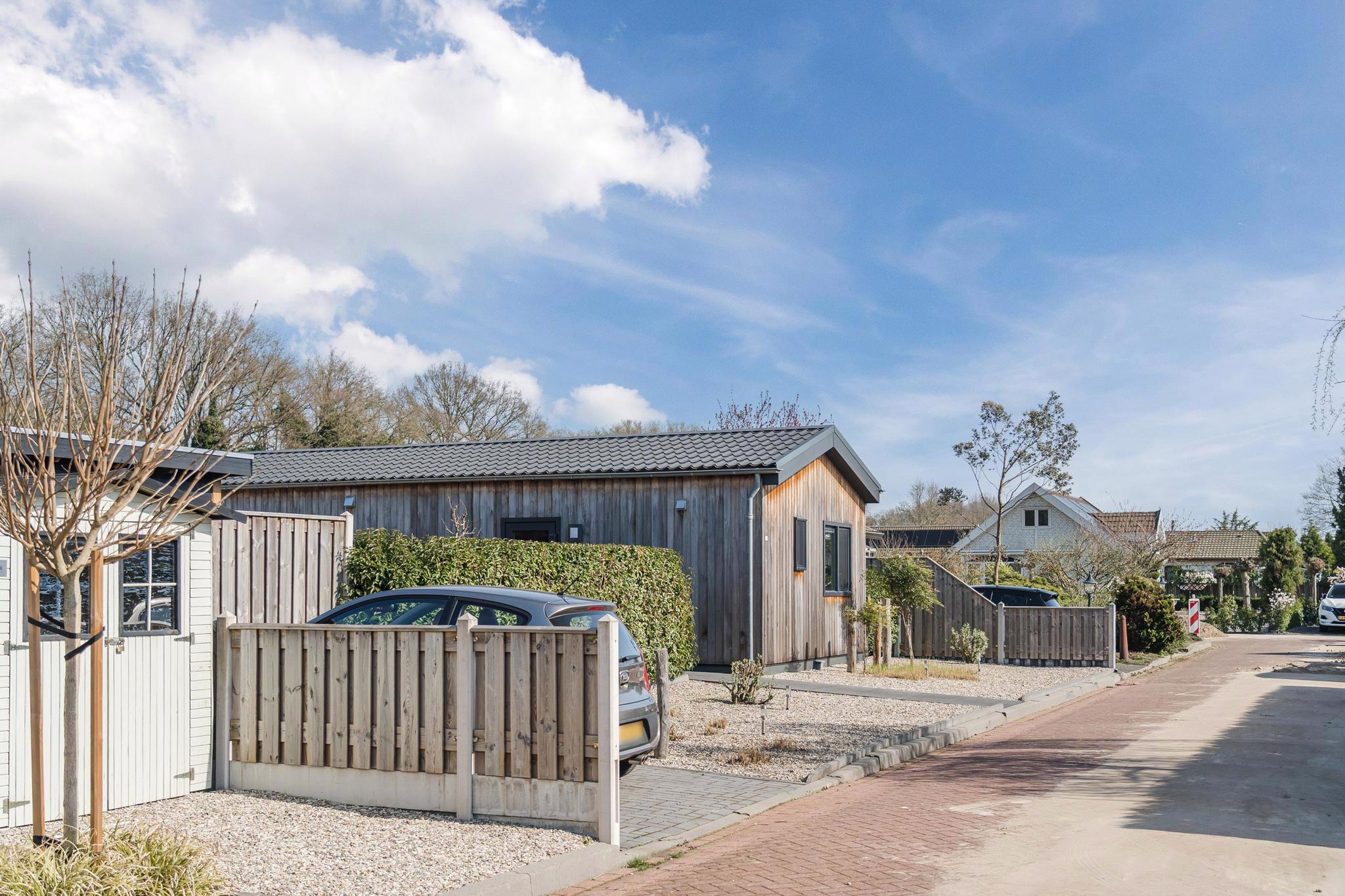 De tuin is onderhoudsvriendelijk aangelegd met fraaie bloeiende borders. In de prachtige tuinkamer met glazen schuifdeuren geniet je het hele jaar door van het buitenleven. De aangrenzende berging heeft geïsoleerde wanden. Ook het dak van de berging en tuinkamer is geïsoleerd. Voor het chalet is een parkeerplaats op eigen grond.