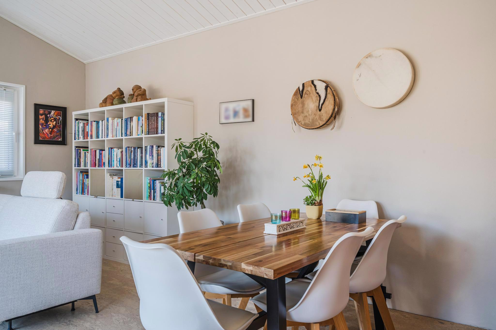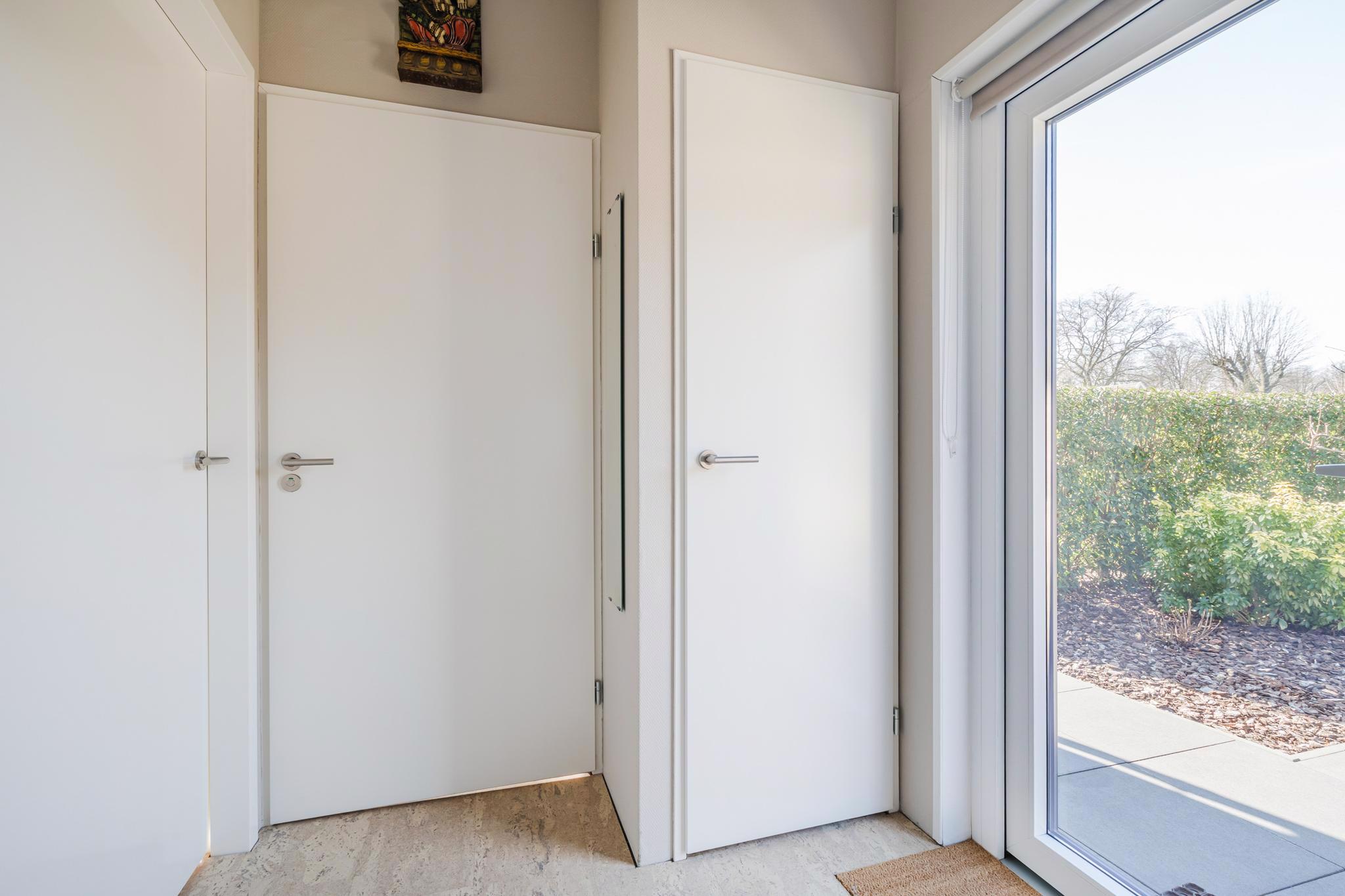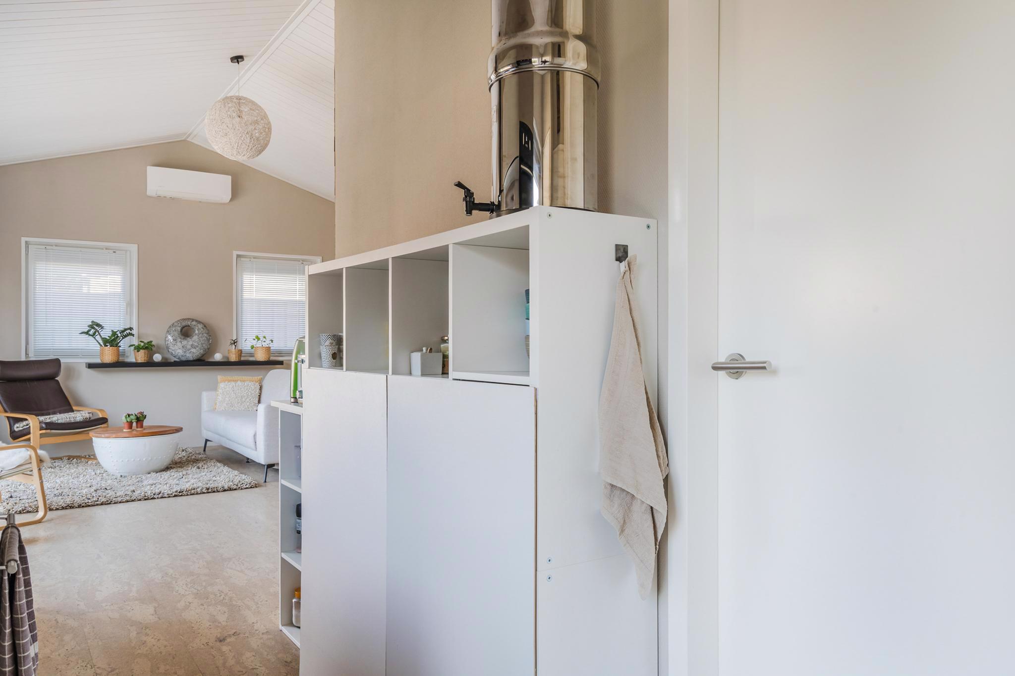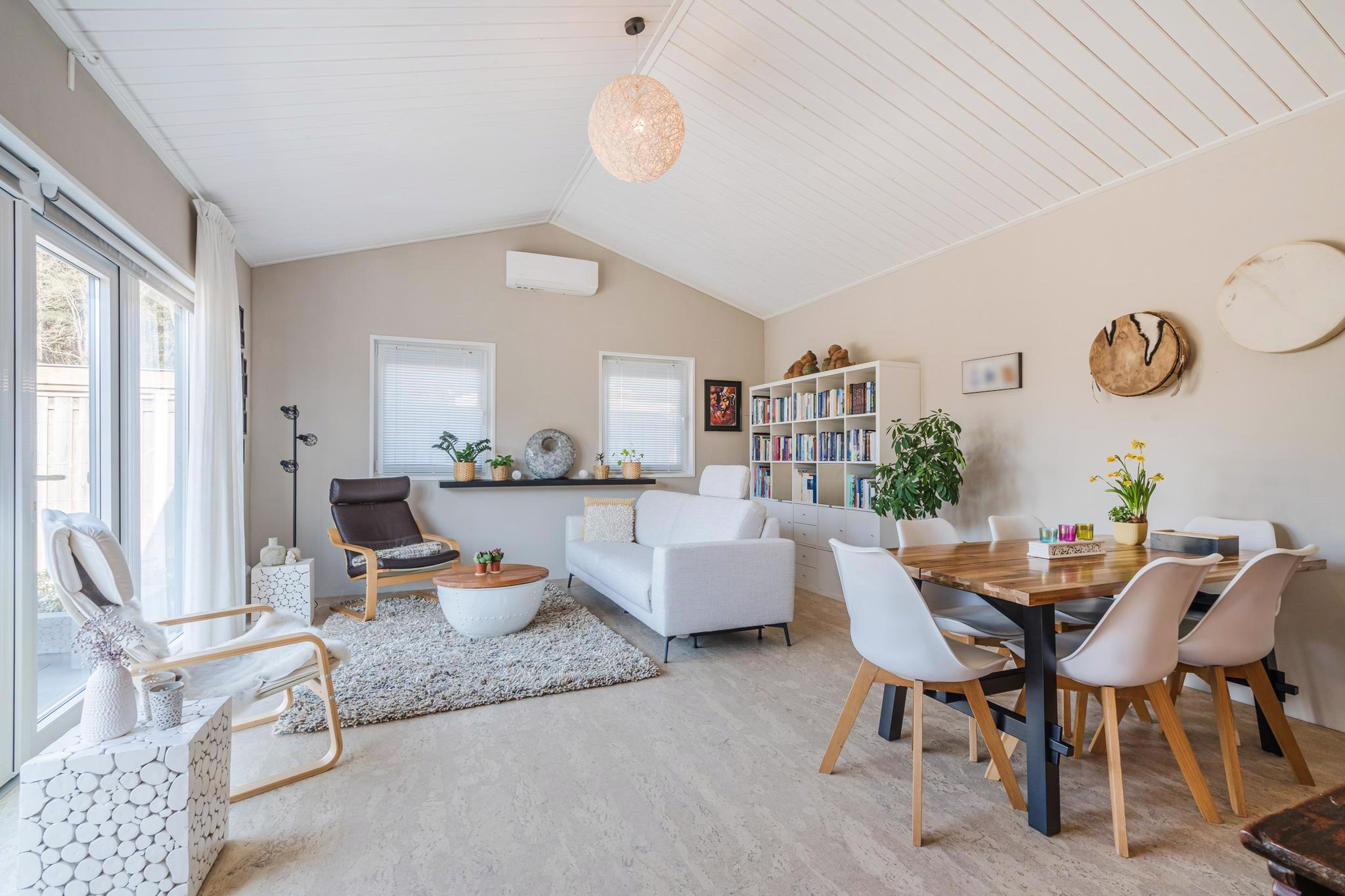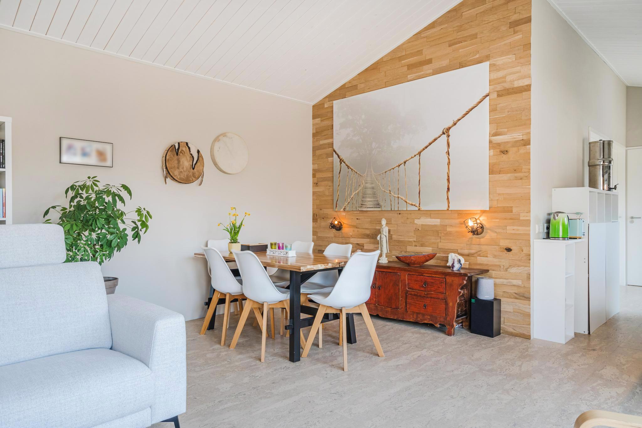 Bij binnenkomst word je verwelkomd in een lichte en ruime woonkamer met openslaande deuren naar het terras. Je kijkt hier mooi uit op de fraai aangelegde tuin. Met een nokhoogte van 3,60 meter is het extra ruimtelijk. Er is een vloer van kurk (goed voor de isolatie) in een lichte kleurstelling. De airco kan koelen en verwarmen, zodat het in de zomer én winter comfortabel is.