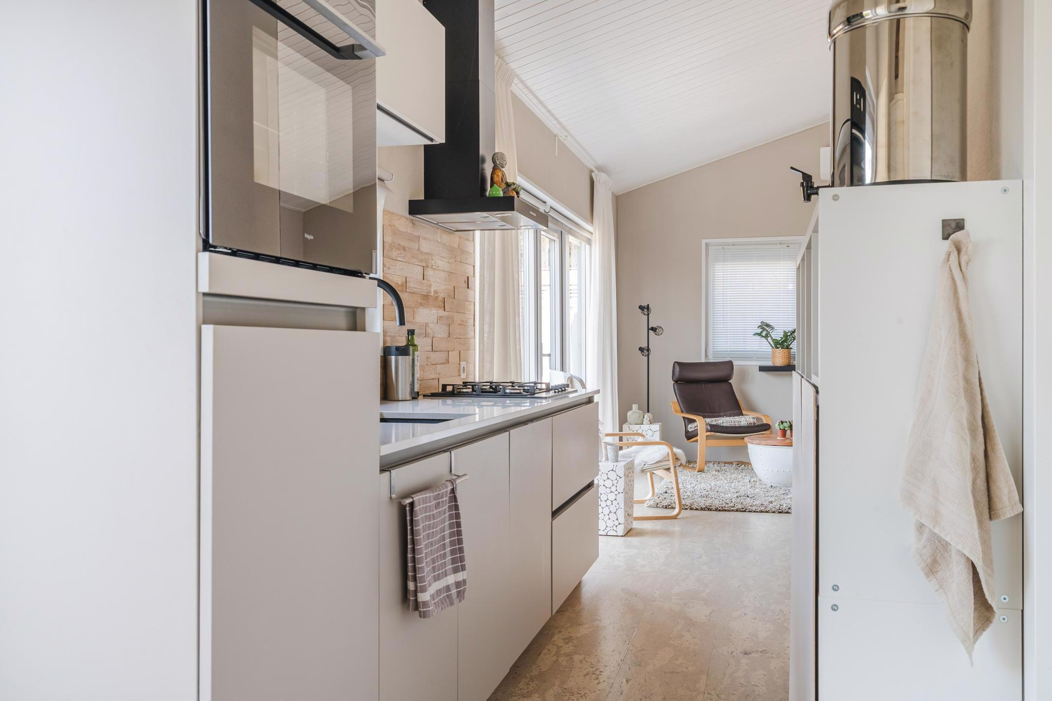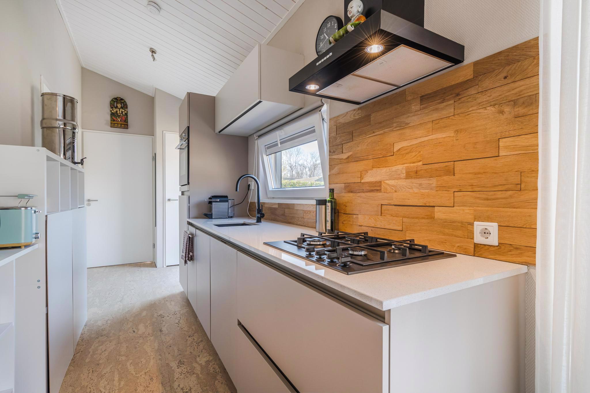 De luxe keuken is van alle gemakken voorzien, waaronder een ingebouwde vaatwasser, koelkast en oven. Koken doe je op gas, maar er is ook een aansluiting voor inductie aanwezig. Het composieten aanrechtblad biedt veel werkruimte.