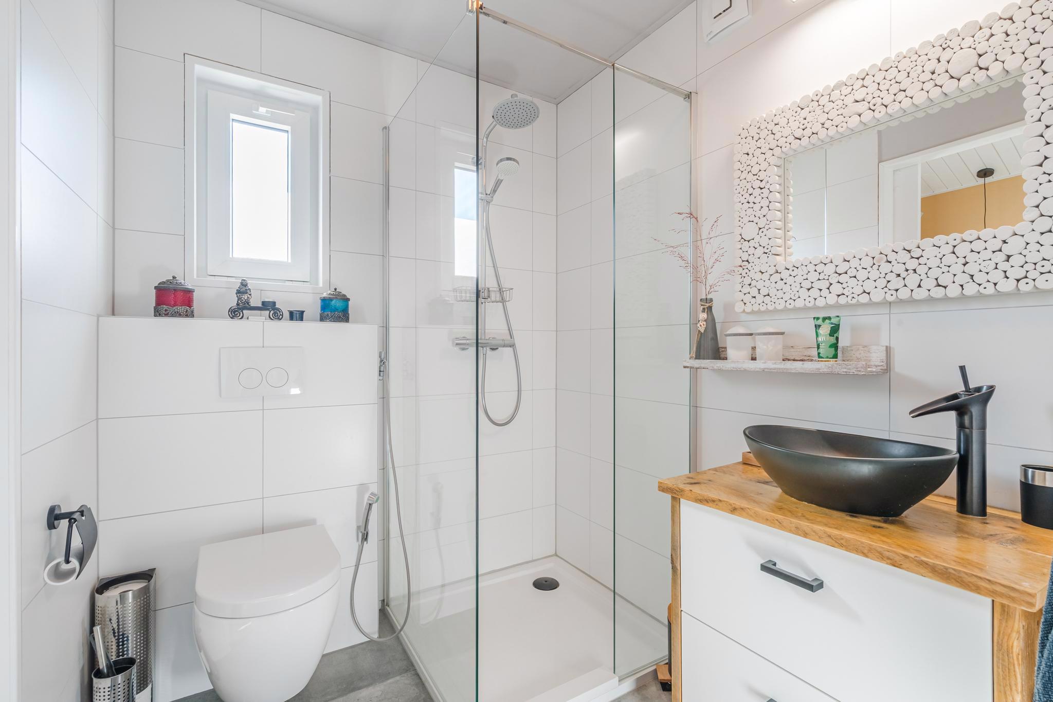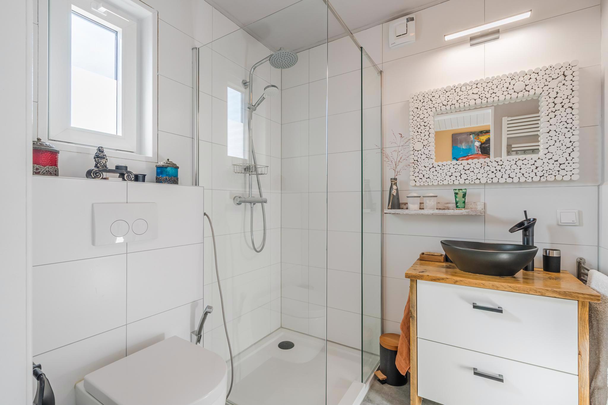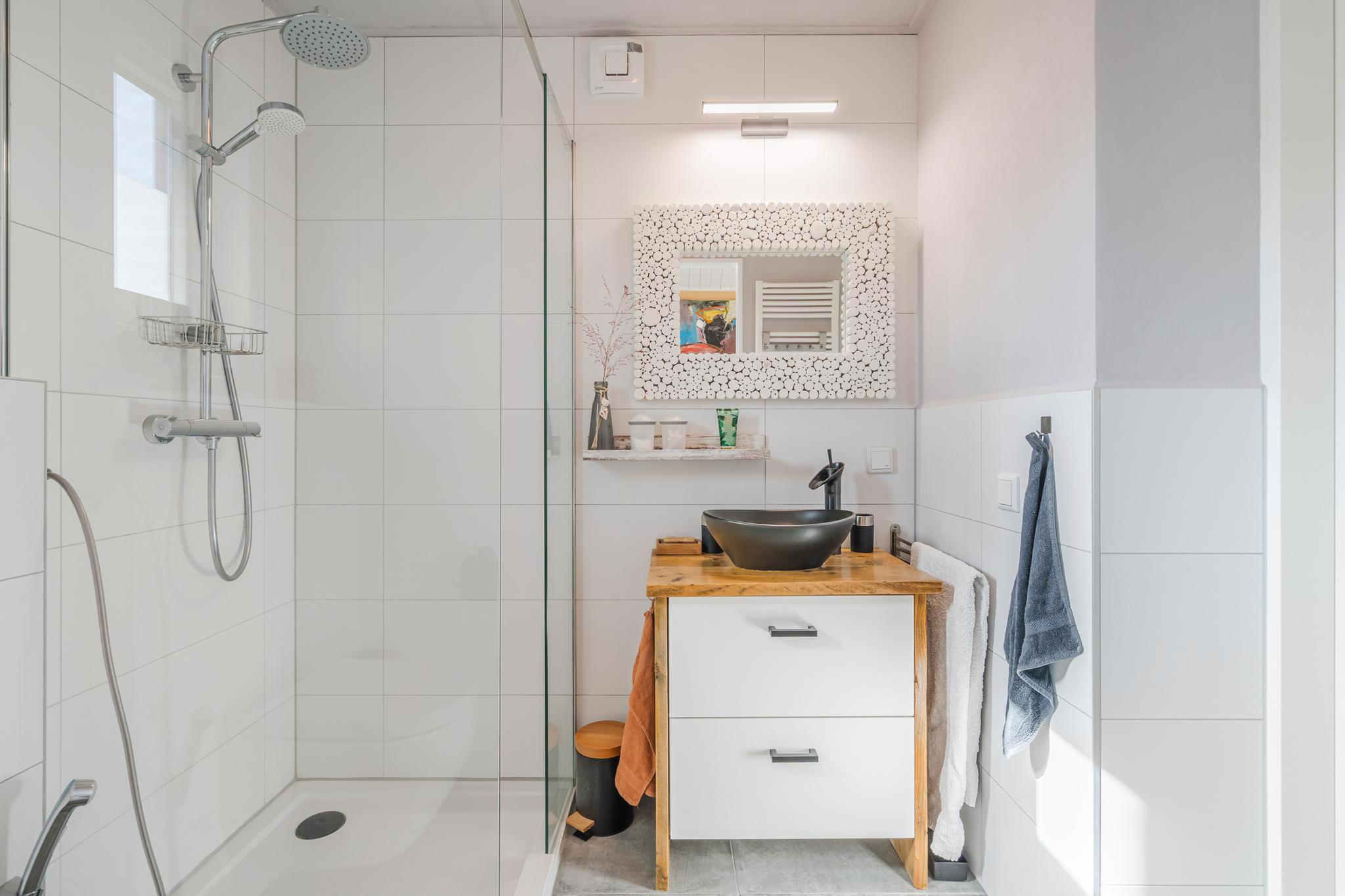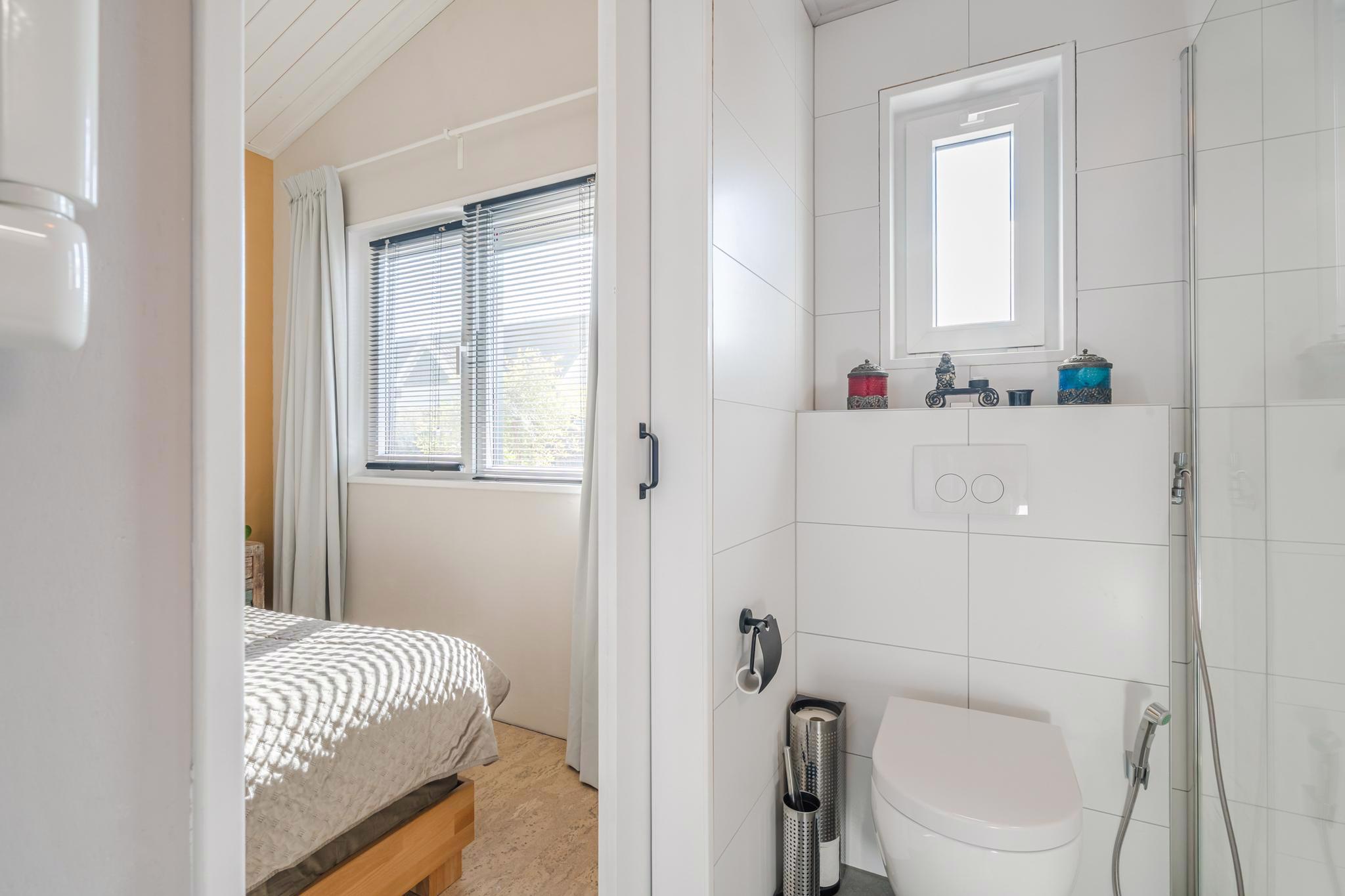 De nette badkamer is voorzien van een douche, toilet, badkamermeubel en een designradiator die je naar wens kunt programmeren. Er is een bergkast aanwezig met een wasmachine aansluiting en een 80 liter boiler.