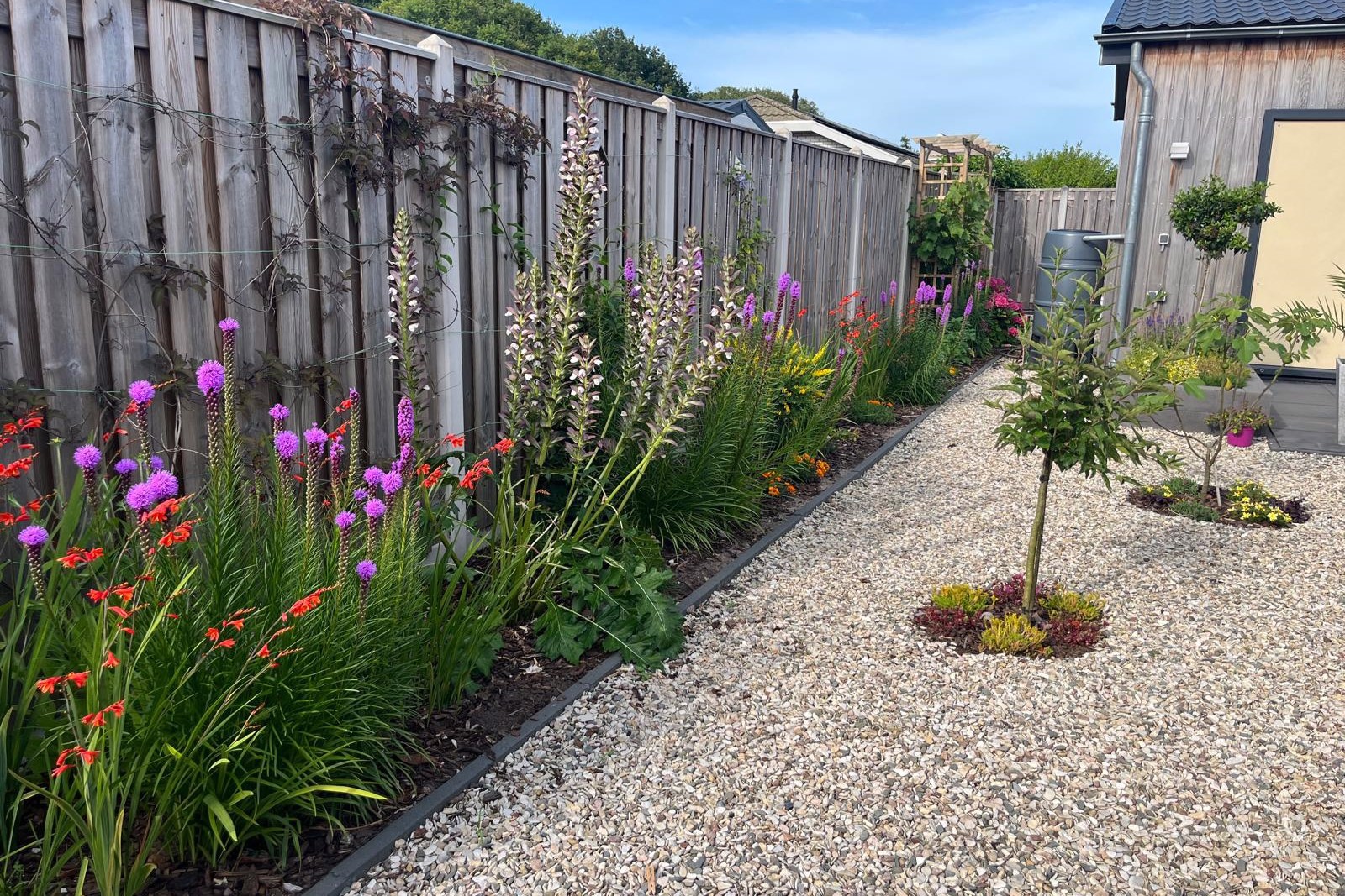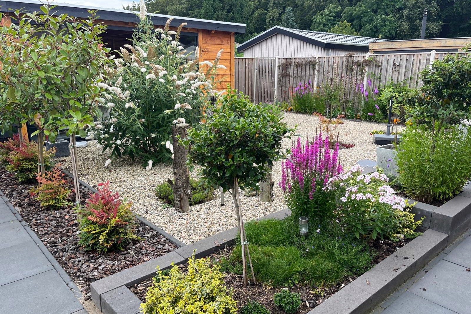 – Tuin met antiworteldoek, regentonnen en 4 ingegraven waterkoffers
