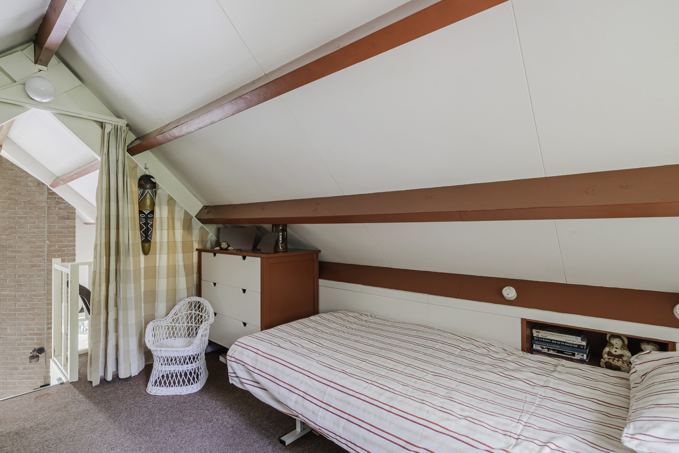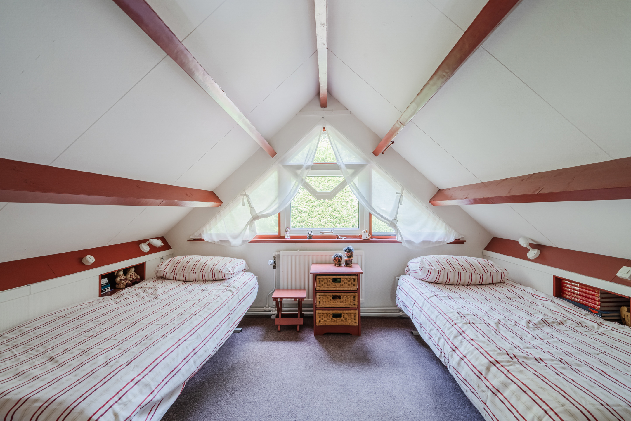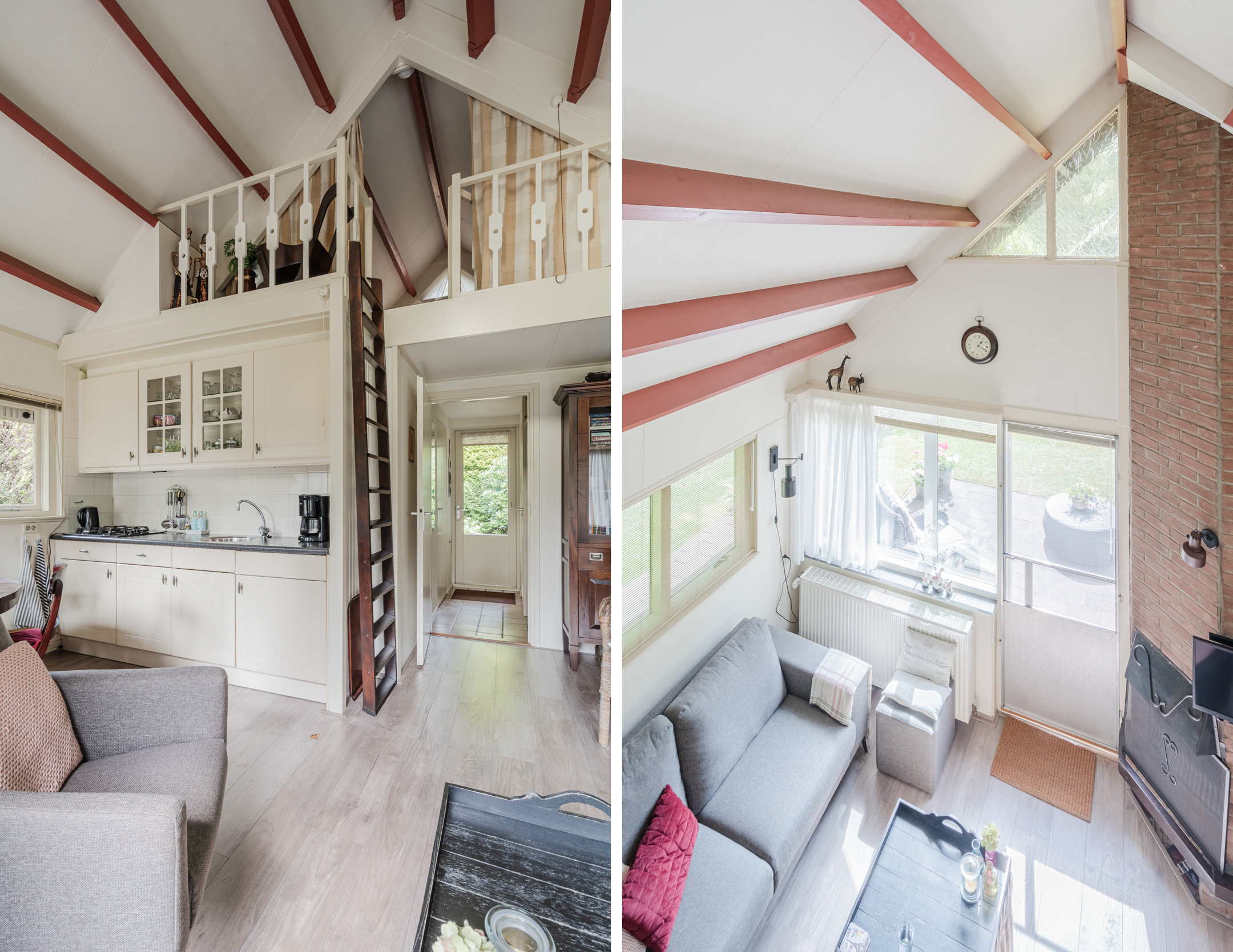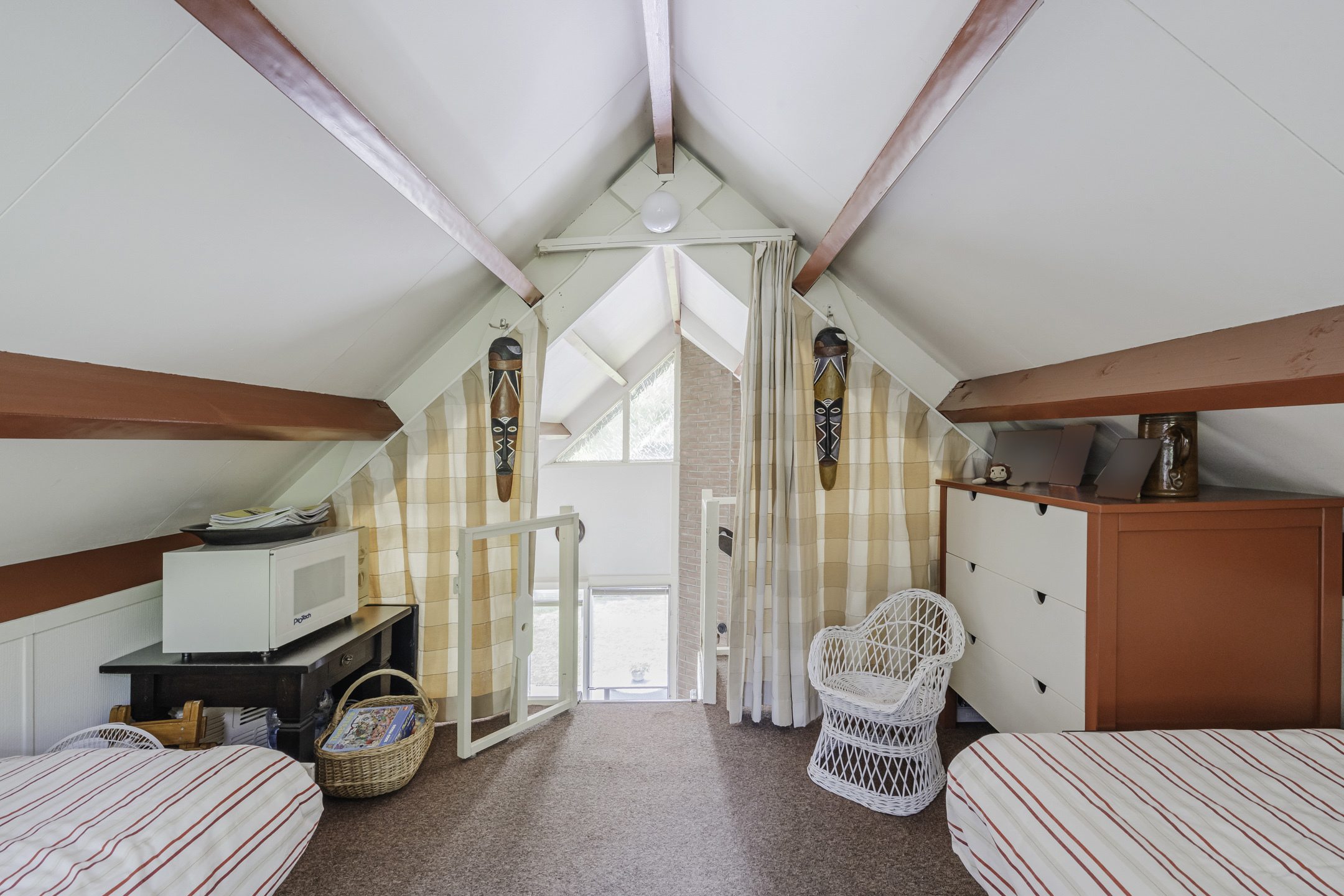 De tussenverdieping die via een losse houten trap in de woonkamer bereikbaar is, biedt plaats aan de twee bedden.