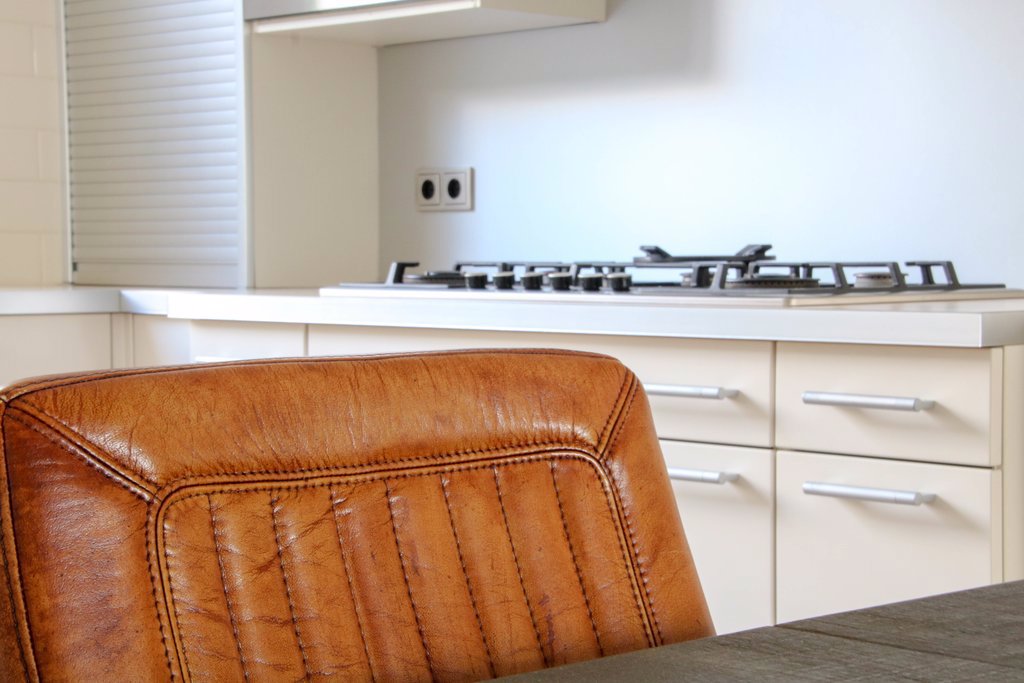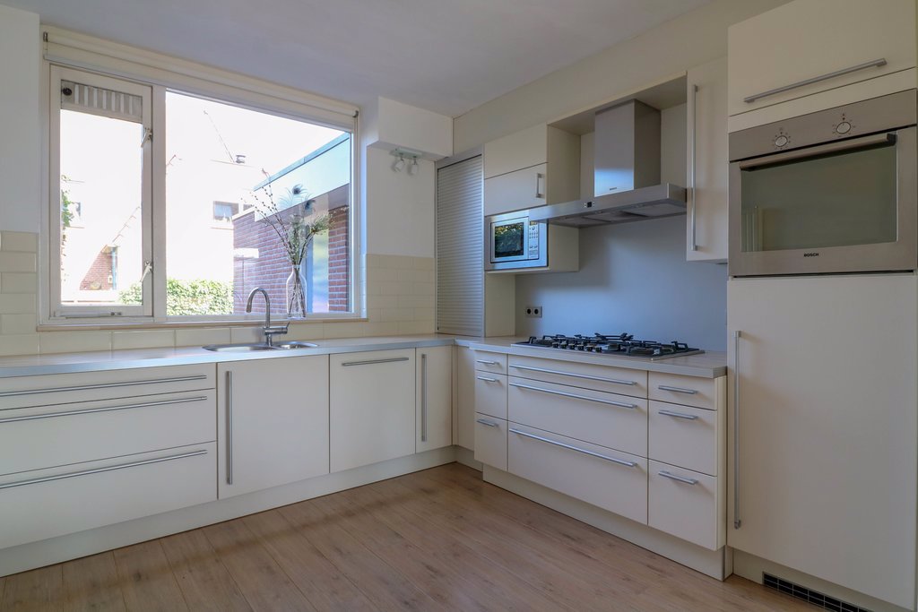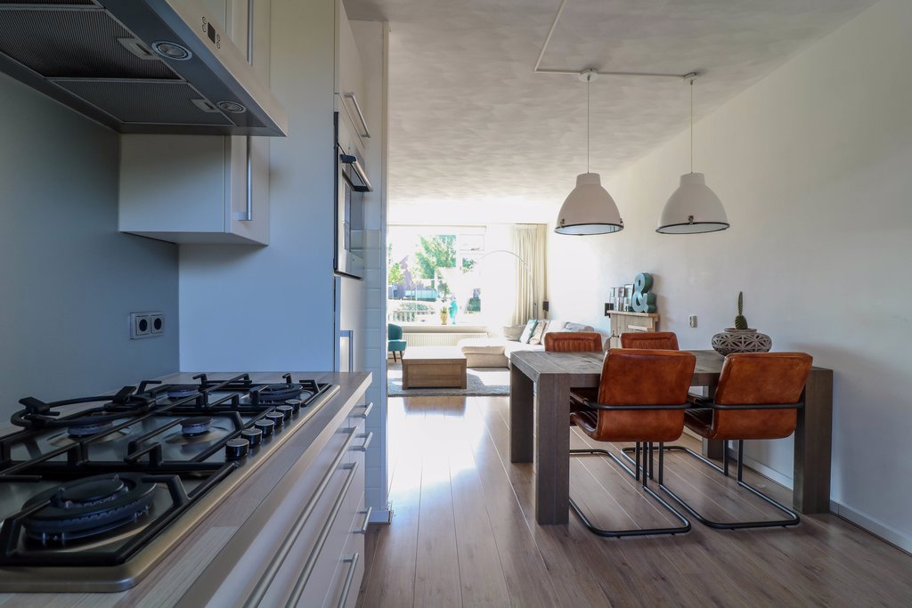 In de open hoekkeuken kunnen kooktalenten zich helemaal uitleven met het 6-pits gasfornuis, een oven én magnetron. De afwasmachine, koelkast, afzuigkap maken het compleet. Alle apparatuur is van Bosch.